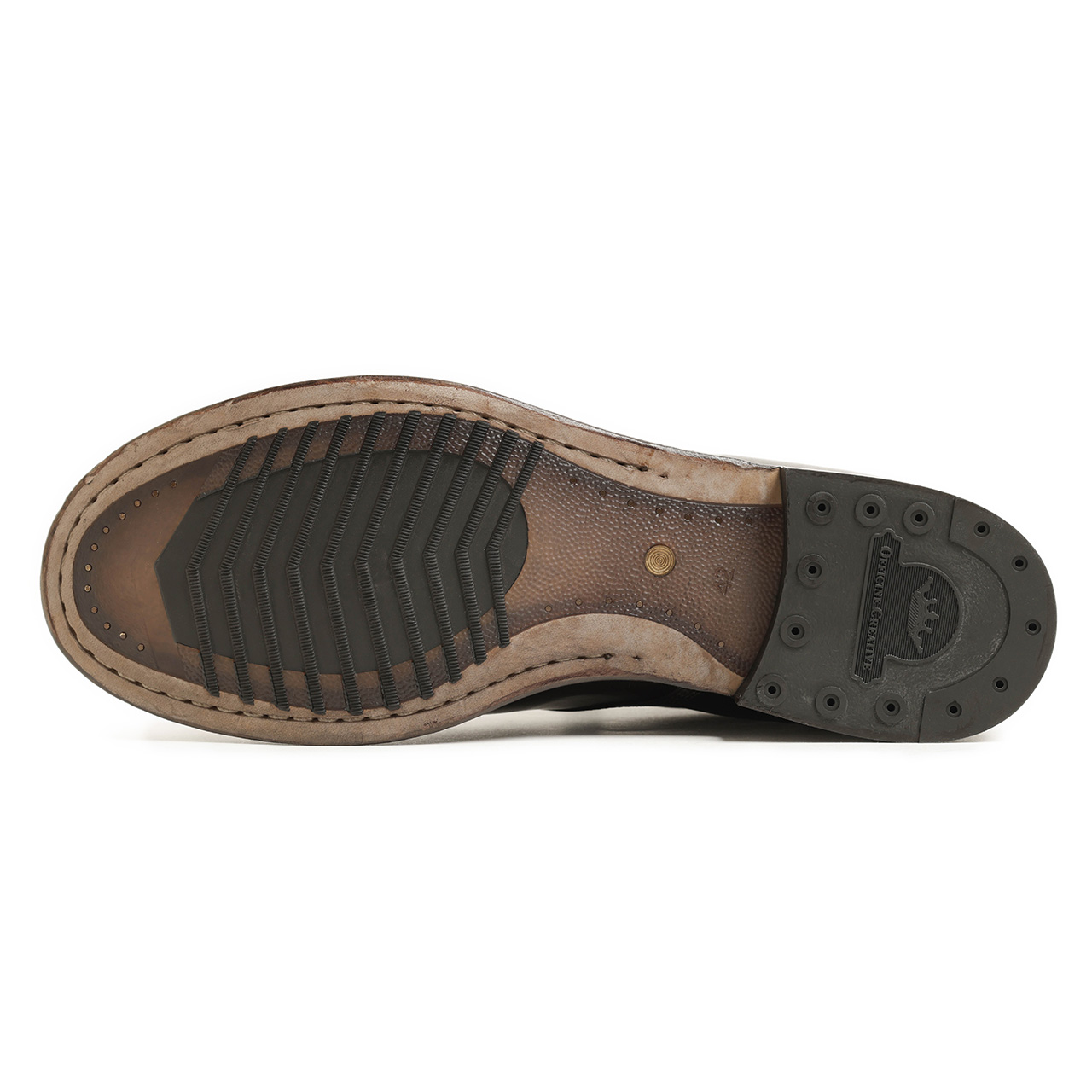 アッパーにはバッファローレザーを使用。カーフなどとは違う独特な革質、ナチュラルなシボ感が特徴のレザーになります。本モデルはヴィンテージ加工を加えており新品状態から履きこんだような独特な風合いを表現しています。この加工により革に柔らかさが生まれ馴染ませやすい一足になっております。