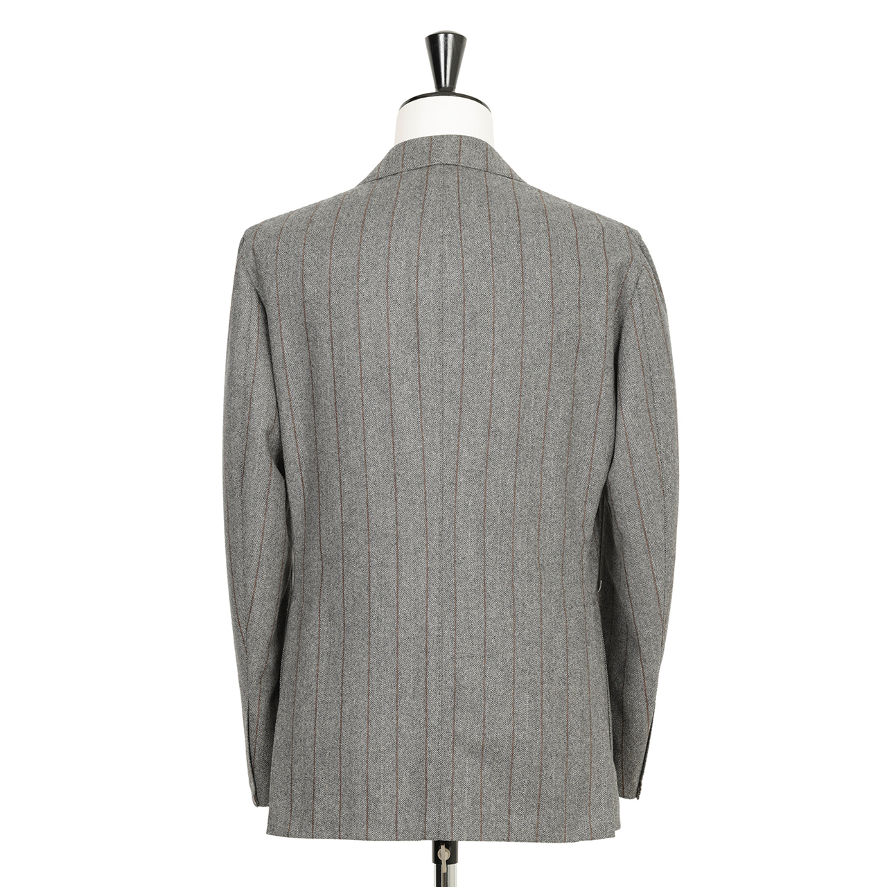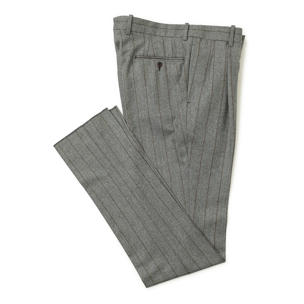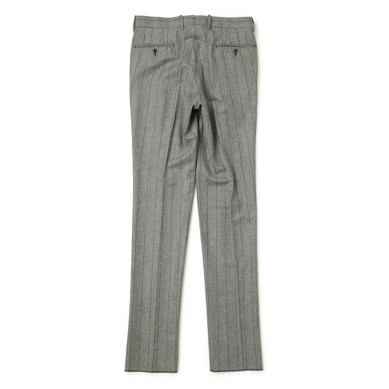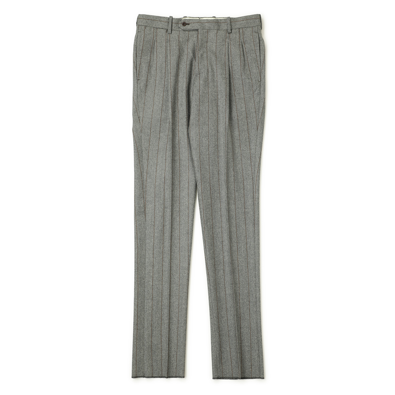 バルカポケット、ダブルステッチ、マニカ・カミーチャといった仕様、吸い付くような肩から存在感のあるラペル、そしてふんわりとロールした襟も非常にエレガントです。パンツは2プリーツ仕様のわたりにゆとりを持たせたクラシカルな雰囲気。しっかりとテーパードがかかっている分モダンに魅せてくれる点もぬかりなし。