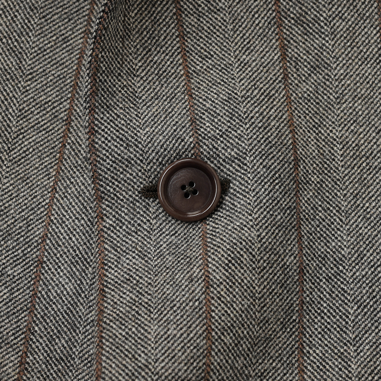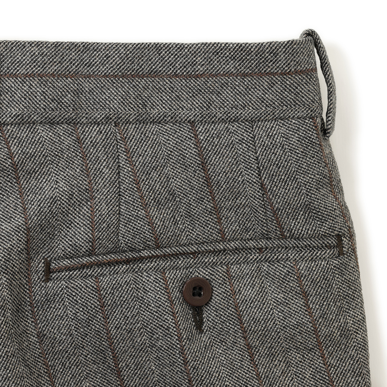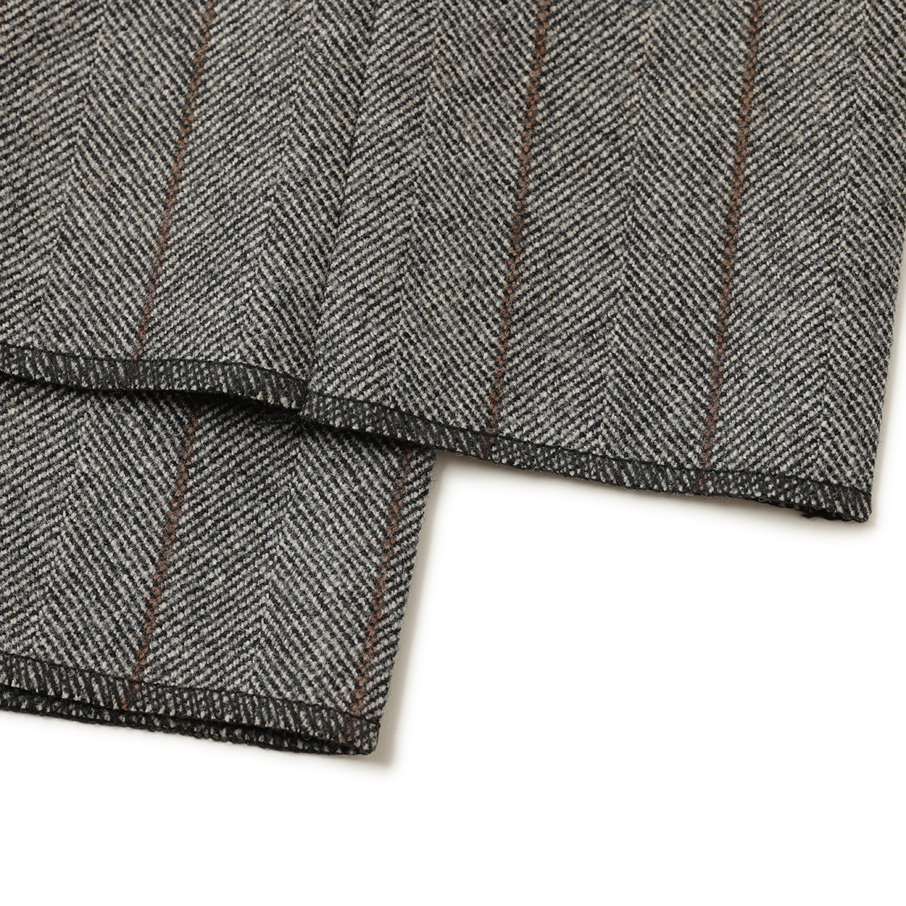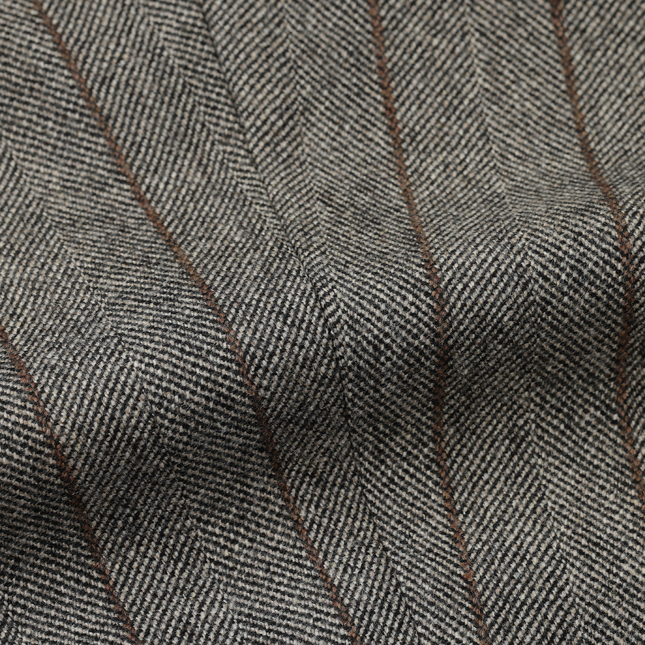 生地はウール100%。ややざらっとしたヴィンテージ感のあるツイード調のウール地になっており、ベースにはグレーのヘリンボーン、そこにブラウンのストライプを合わせた絶妙な色合いも見逃せません。ツイード調と聞くと生地が硬く、着用を重ねて育てていく印象がありますが、この生地に関してはそんなことはなく着始めから体に良く馴染んでくれる柔らかさも持っております。