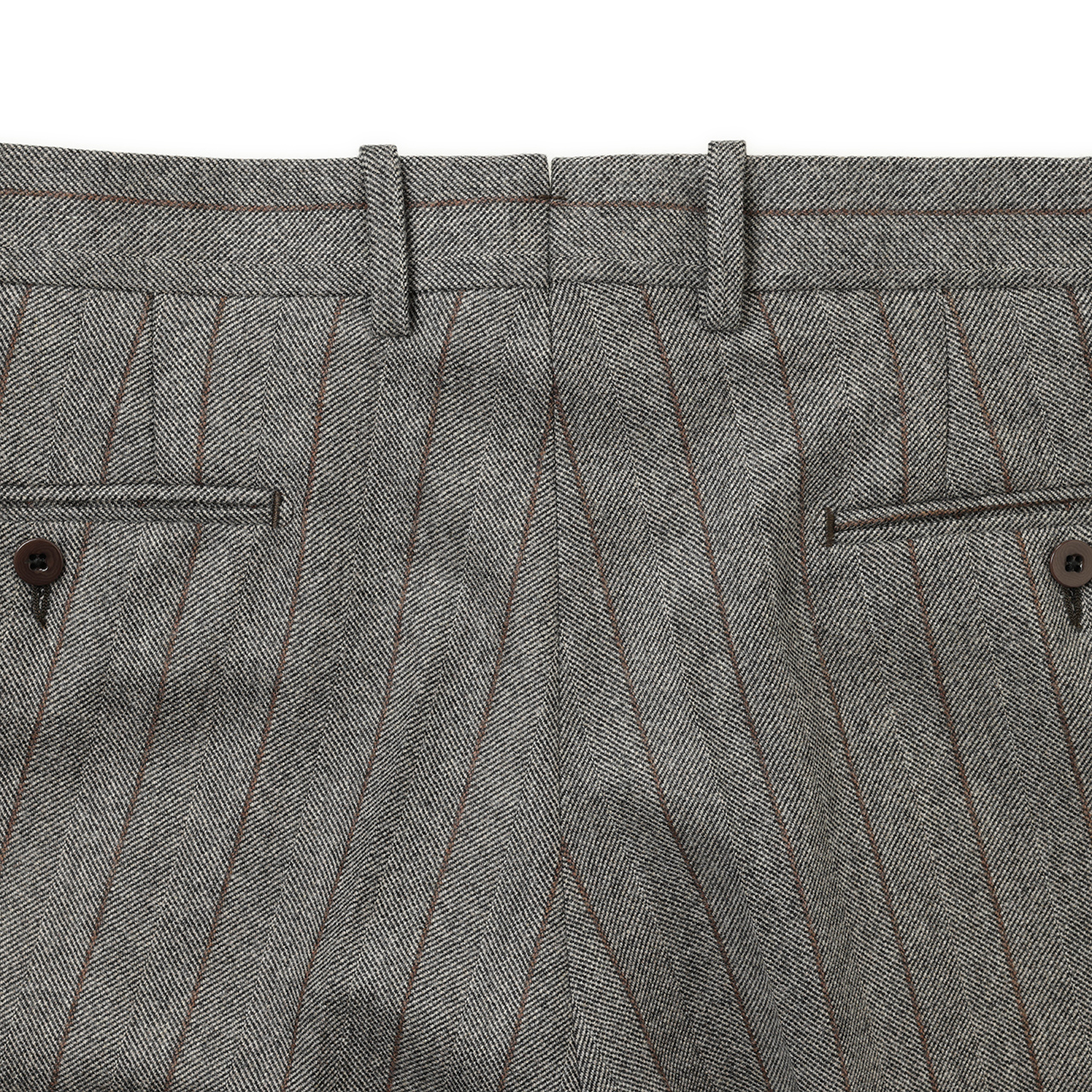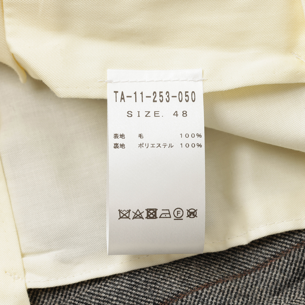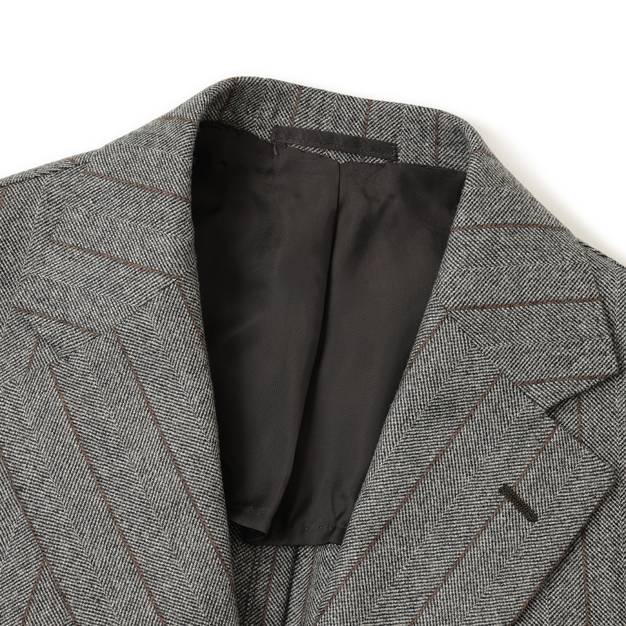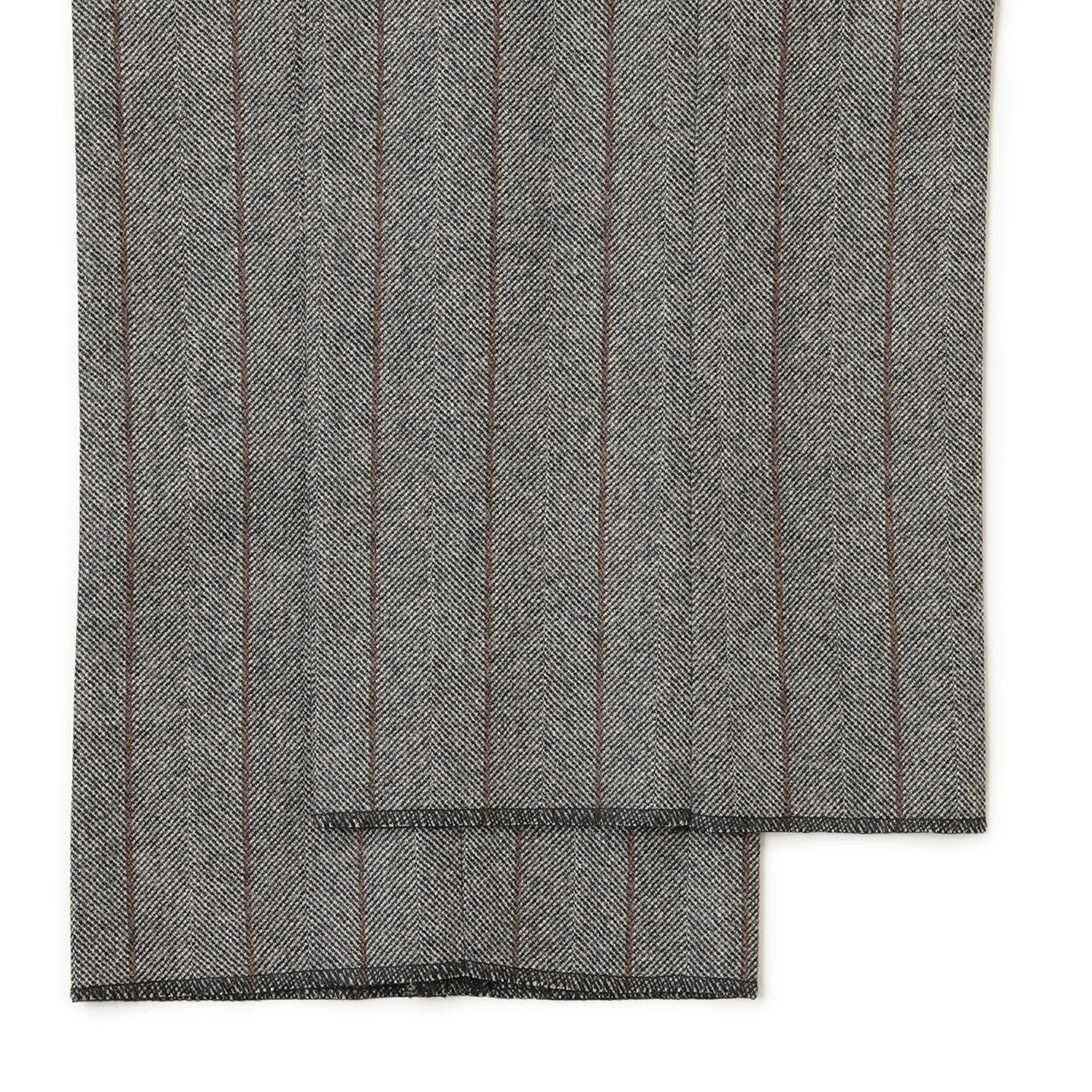 生地はウール100%。ややざらっとしたヴィンテージ感のあるツイード調のウール地になっており、ベースにはグレーのヘリンボーン、そこにブラウンのストライプを合わせた絶妙な色合いも見逃せません。ツイード調と聞くと生地が硬く、着用を重ねて育てていく印象がありますが、この生地に関してはそんなことはなく着始めから体に良く馴染んでくれる柔らかさも持っております。