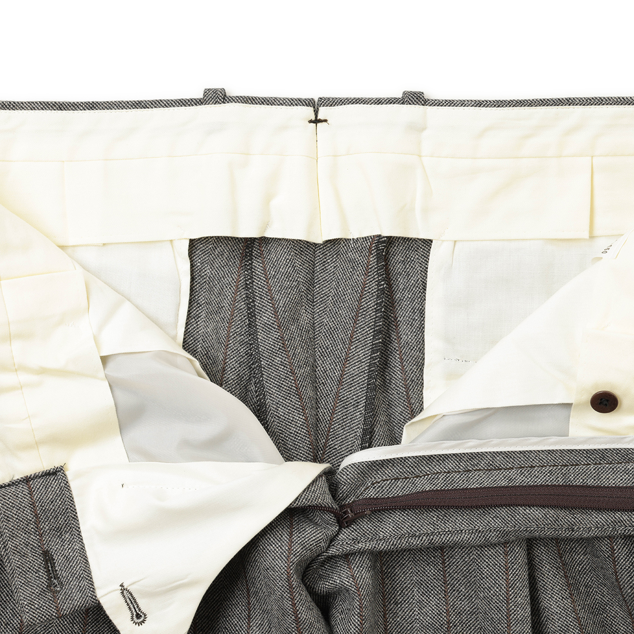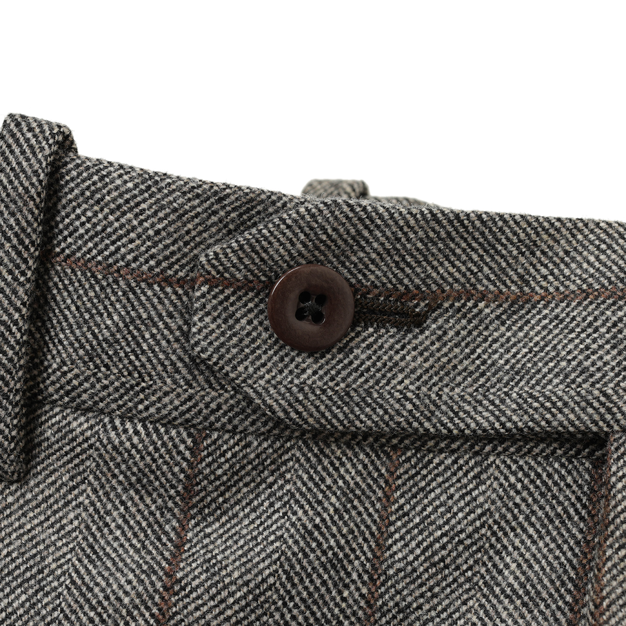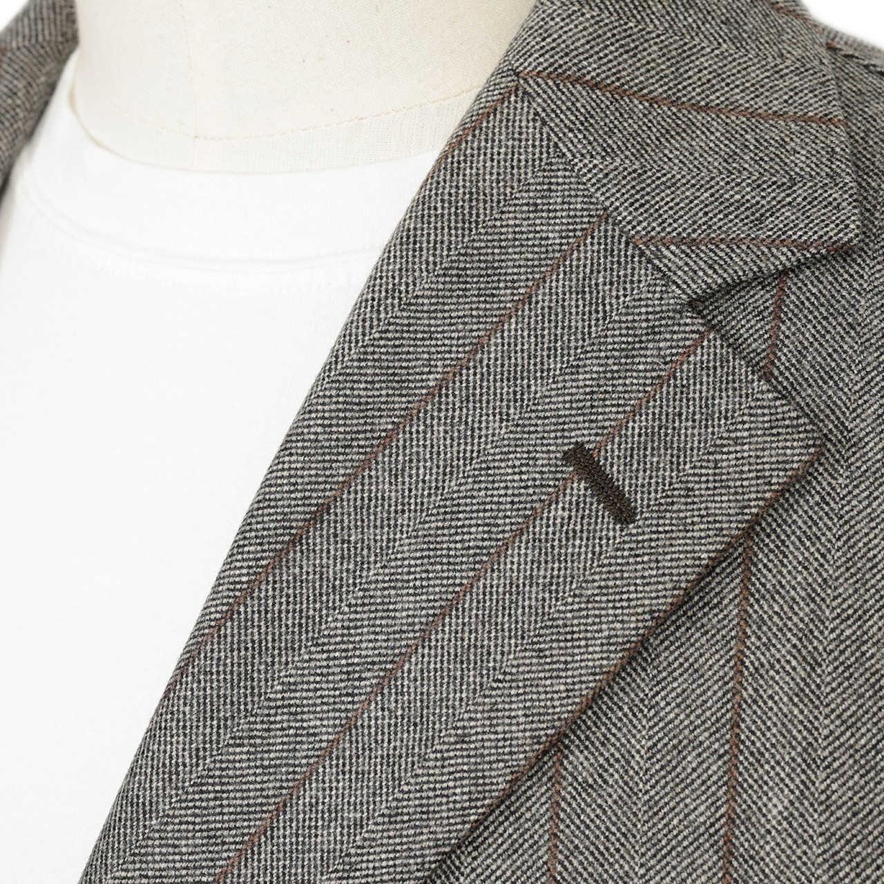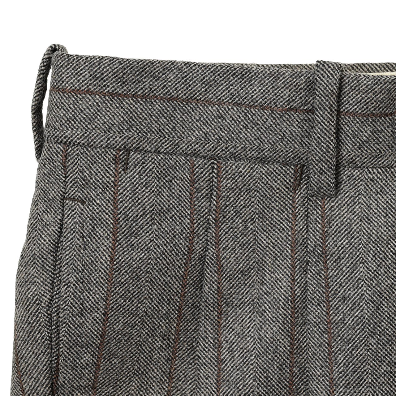 生地はウール100%。ややざらっとしたヴィンテージ感のあるツイード調のウール地になっており、ベースにはグレーのヘリンボーン、そこにブラウンのストライプを合わせた絶妙な色合いも見逃せません。ツイード調と聞くと生地が硬く、着用を重ねて育てていく印象がありますが、この生地に関してはそんなことはなく着始めから体に良く馴染んでくれる柔らかさも持っております。