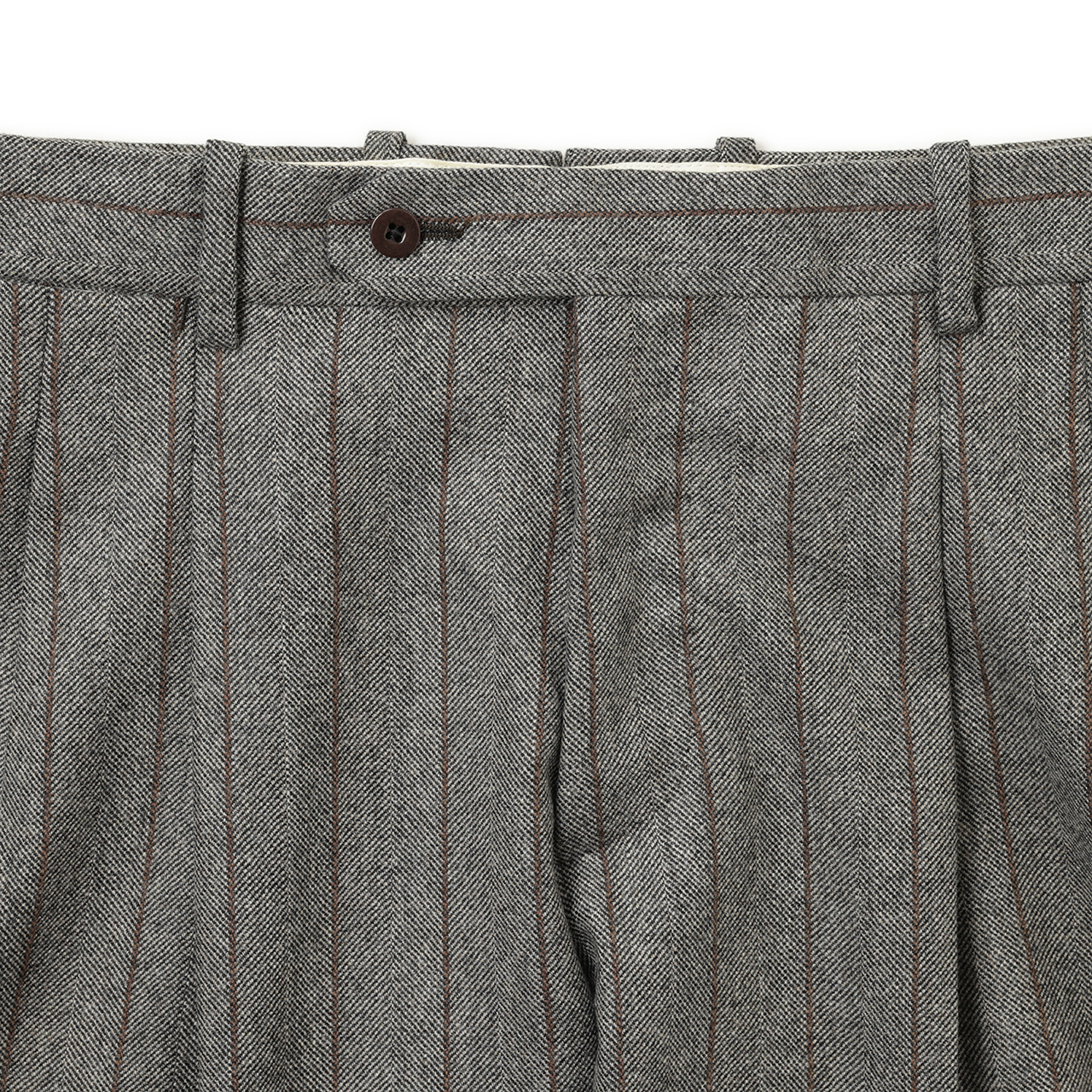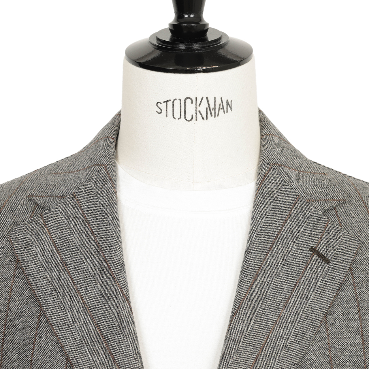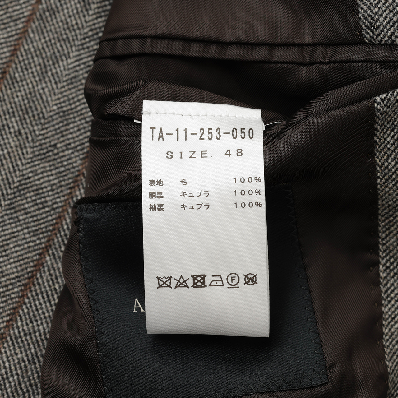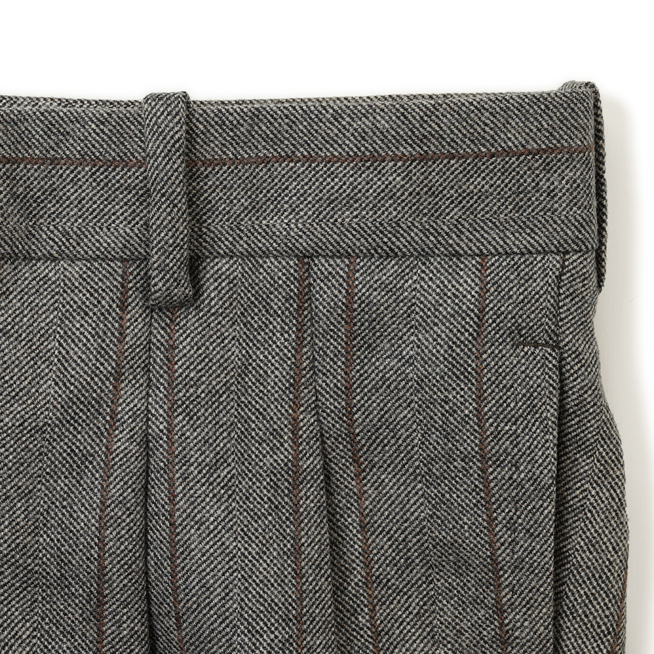 生地はウール100%。ややざらっとしたヴィンテージ感のあるツイード調のウール地になっており、ベースにはグレーのヘリンボーン、そこにブラウンのストライプを合わせた絶妙な色合いも見逃せません。ツイード調と聞くと生地が硬く、着用を重ねて育てていく印象がありますが、この生地に関してはそんなことはなく着始めから体に良く馴染んでくれる柔らかさも持っております。