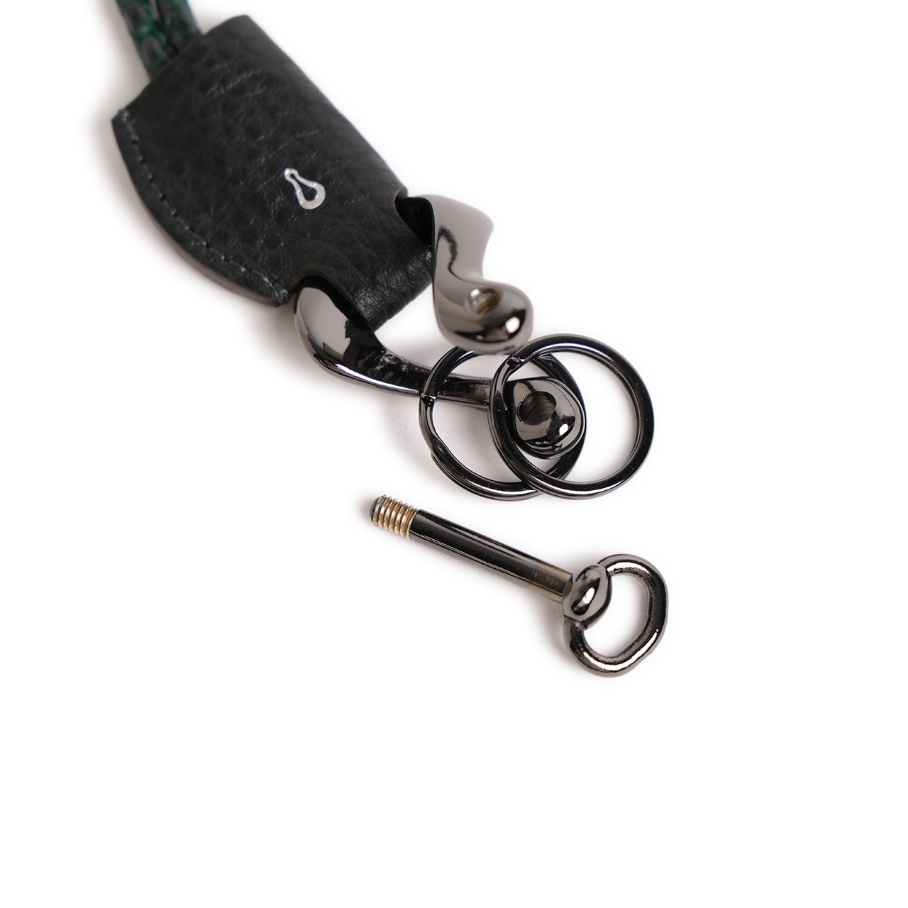 先端のメインパーツは、ドライバーなどを使わずに指でネジを着脱できる、シャックル機能付きのオリジナル真鍮金具で、ひねりが加えられた造形の美しさが個性的。