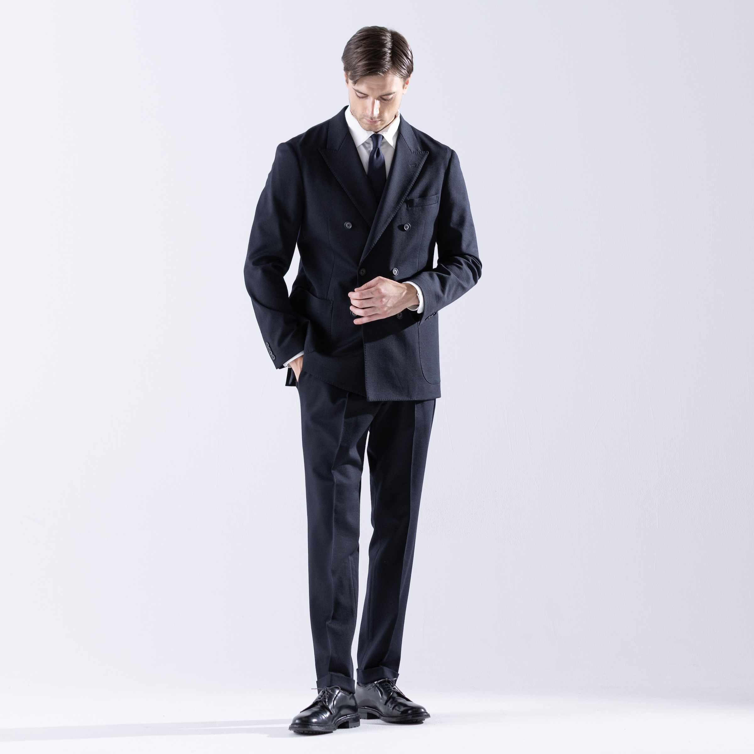 「Duplex Wool Jersey」は、ウール・ナイロン・ポリウレタンを掛け合わせた特殊な糸を、独自の両面編み機で“高密度”に編み上げた「ポンチ素材=ダブルジャージー」が特長。