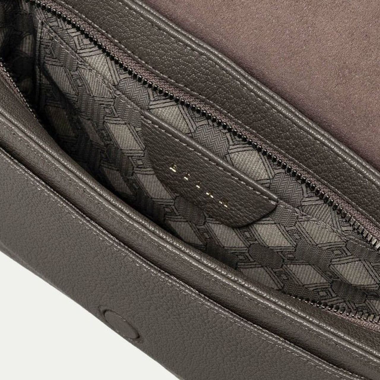 クラシックな印象のフラップは、マグネット式で簡単に開け閉めでき、天ファスナーも設けることで荷物の落下を防止する配慮も。