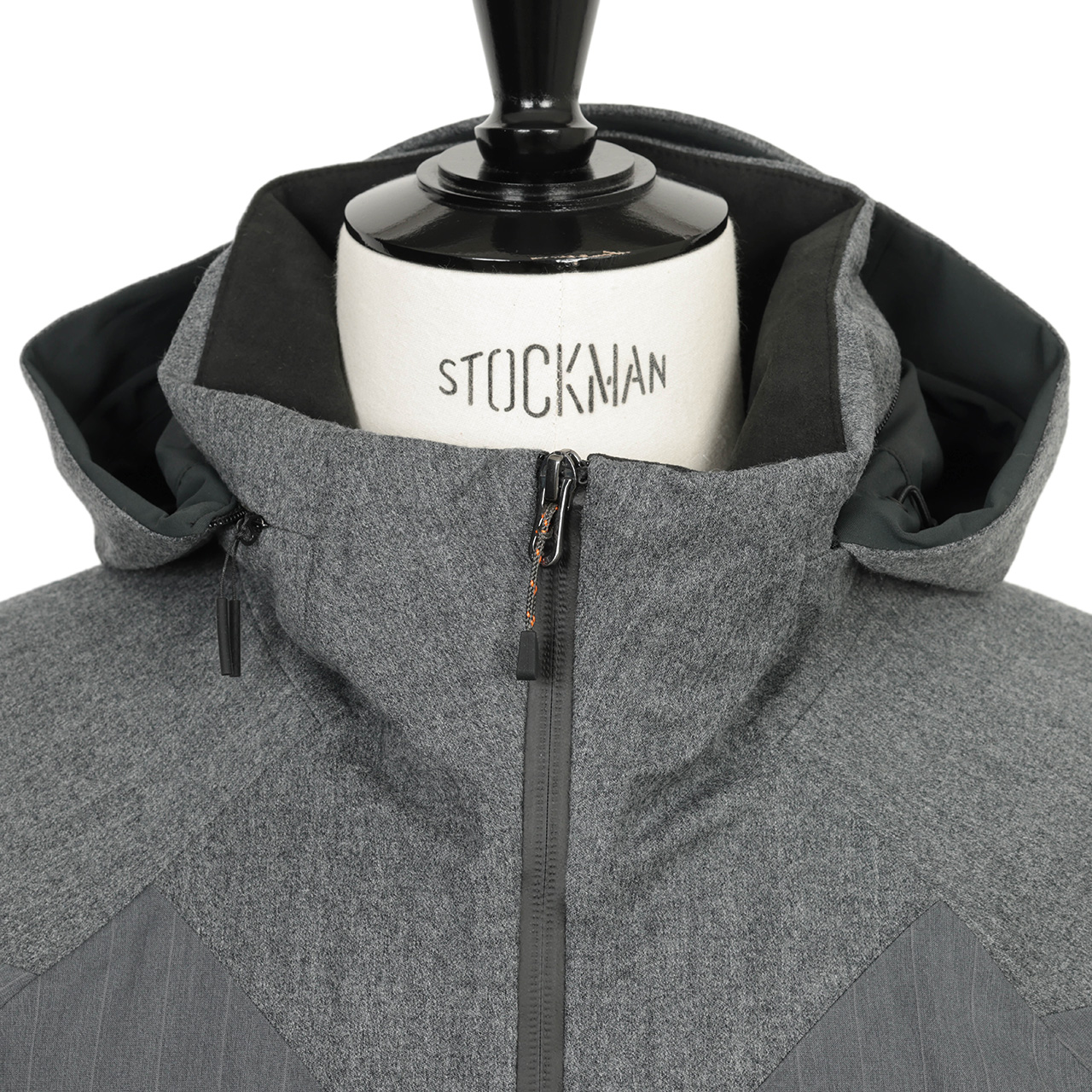 こちらのTRACE JACKET2.0は大胆な素材切り替えが印象的な一着。ベースとなる生地はストライプ、別布でメランジウールのフランネルを使用。