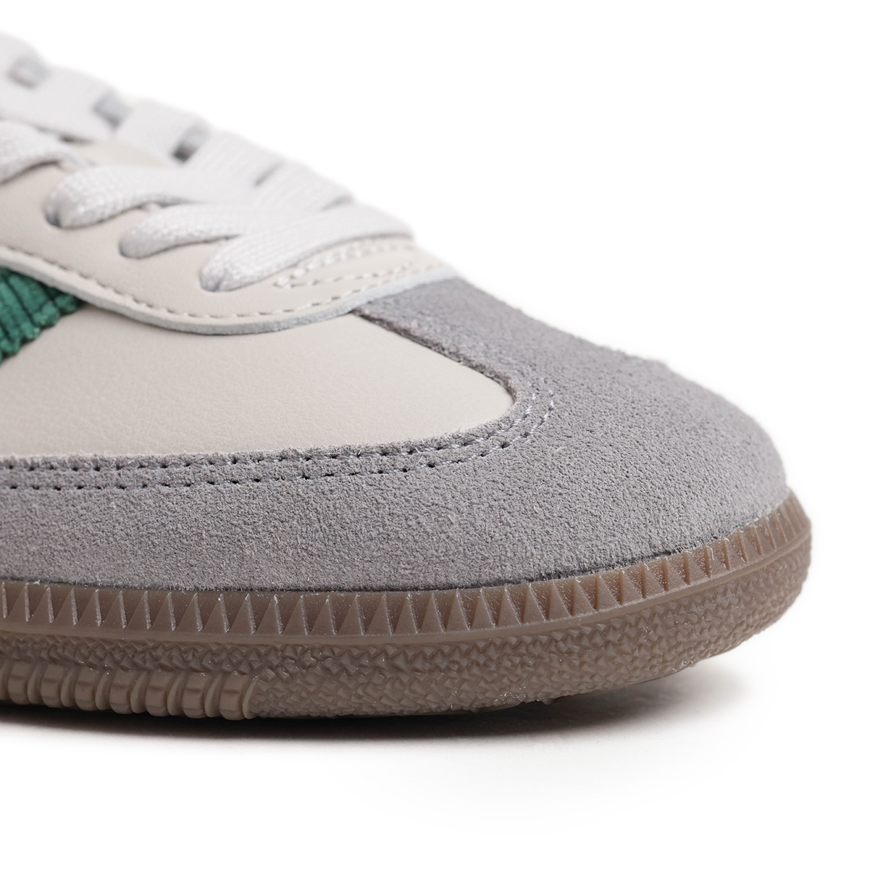 国内2社限定での展開となる本モデルはライトグレー、グレーのレザー、スエードをベースにグリーンのラインを組み合わせたカラーリング。ラインに使用しているコーデュロイ素材の立体感が足元にさりげないアクセントをプラスしてくれます。