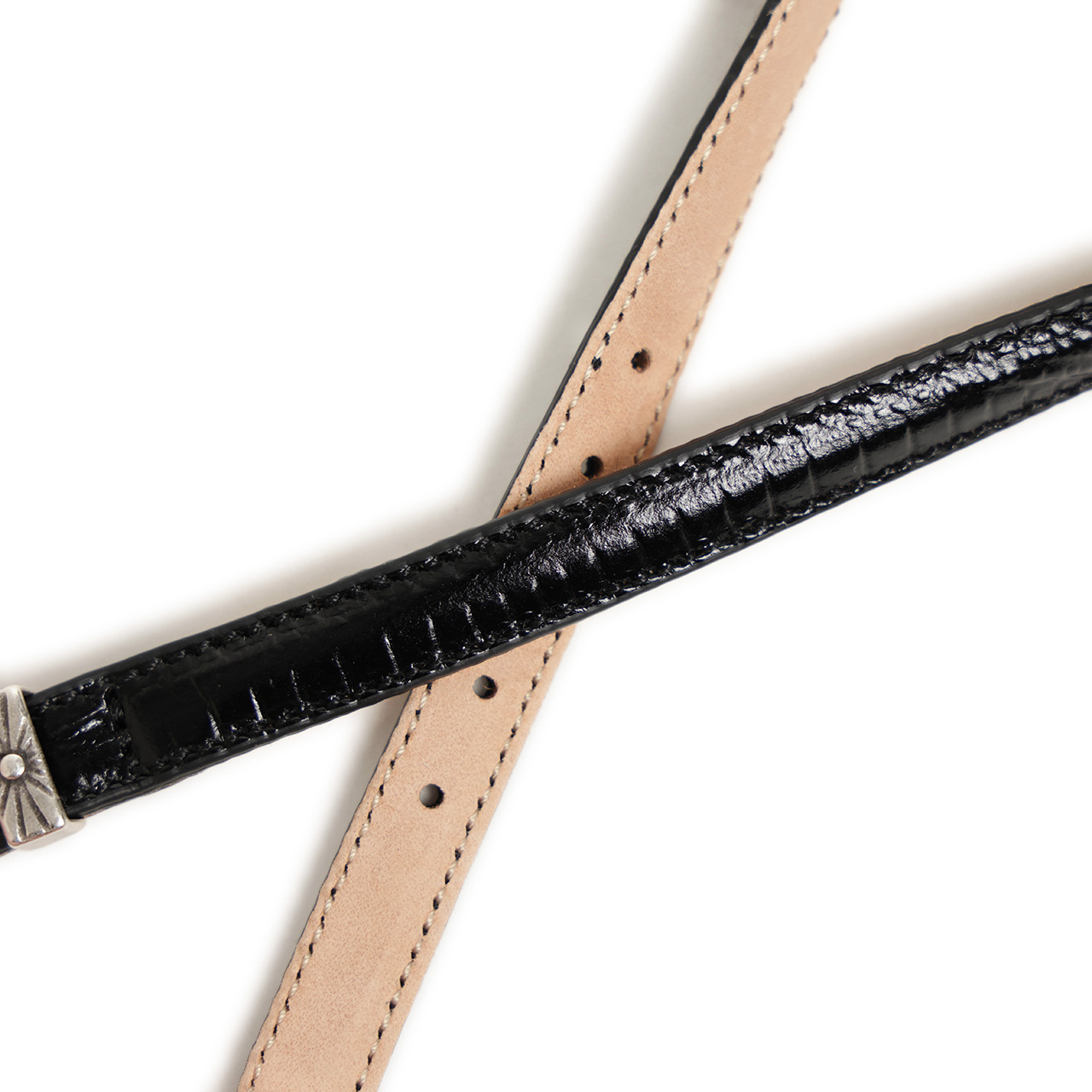 素材には2種類のレザーをご用意。シボの入ったレザーはもちっとしてソフト、上質なレザーならではの自然な艶が感じられます。一方リザード型押しを施したレザーは艶が強く感じられ大人の色気を演出してくれます。遊革、剣先部分にはウエスタン調のバックル、プンターレを付け春夏の手元にアクセントをプラスしてくれるデザイン。