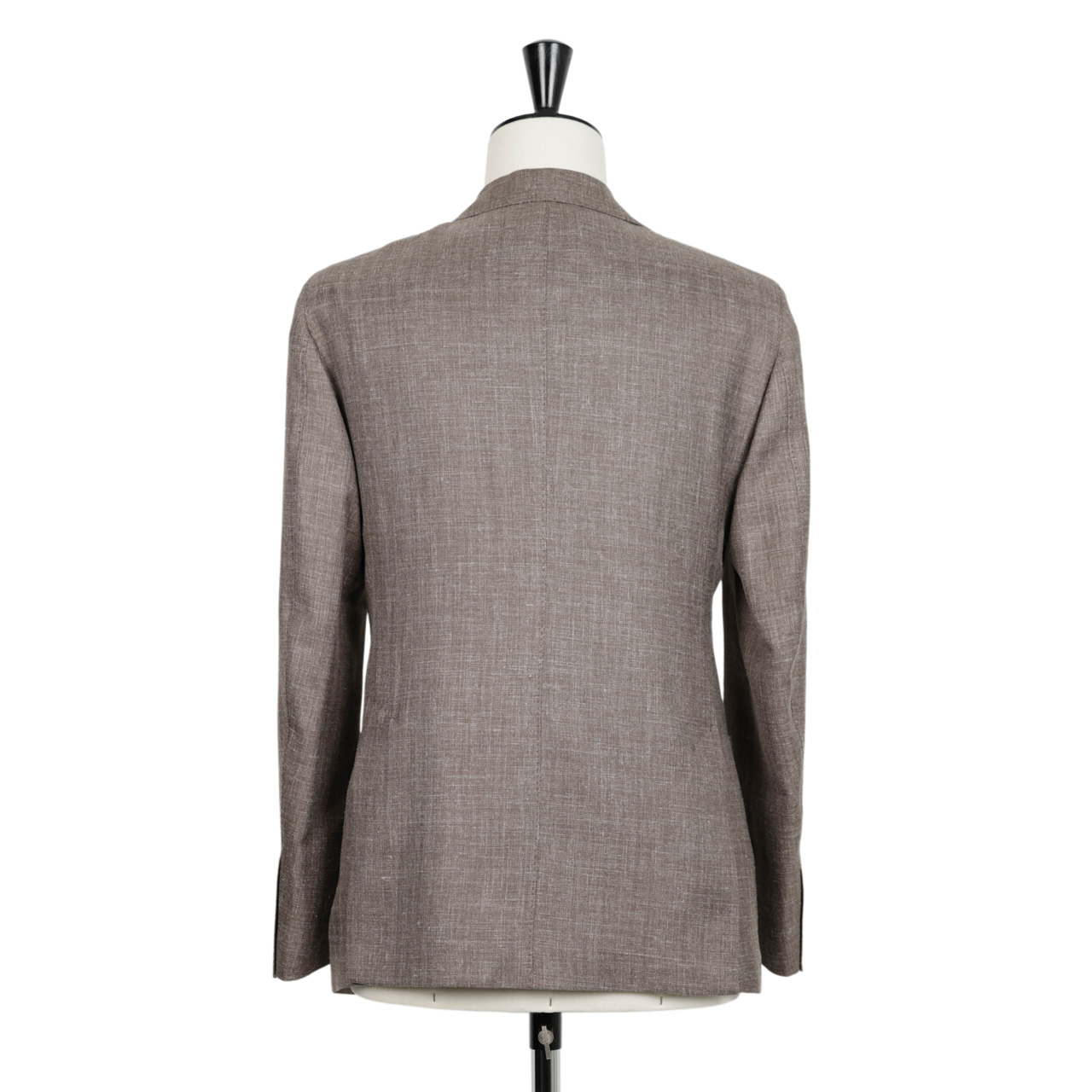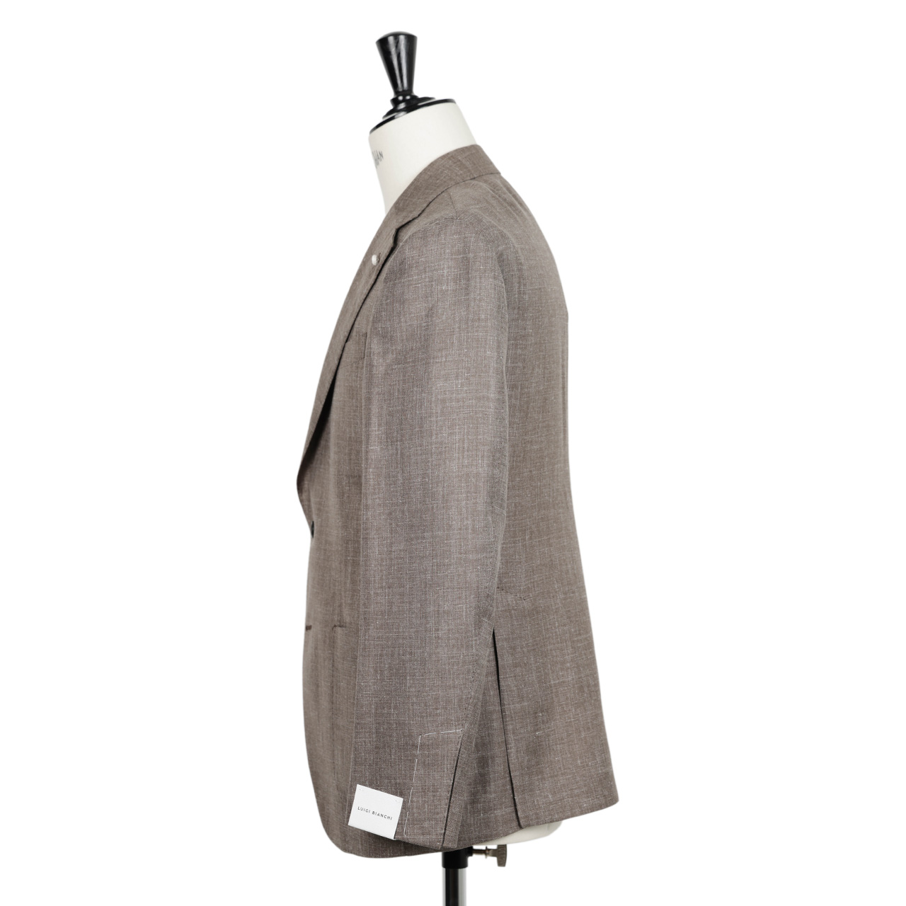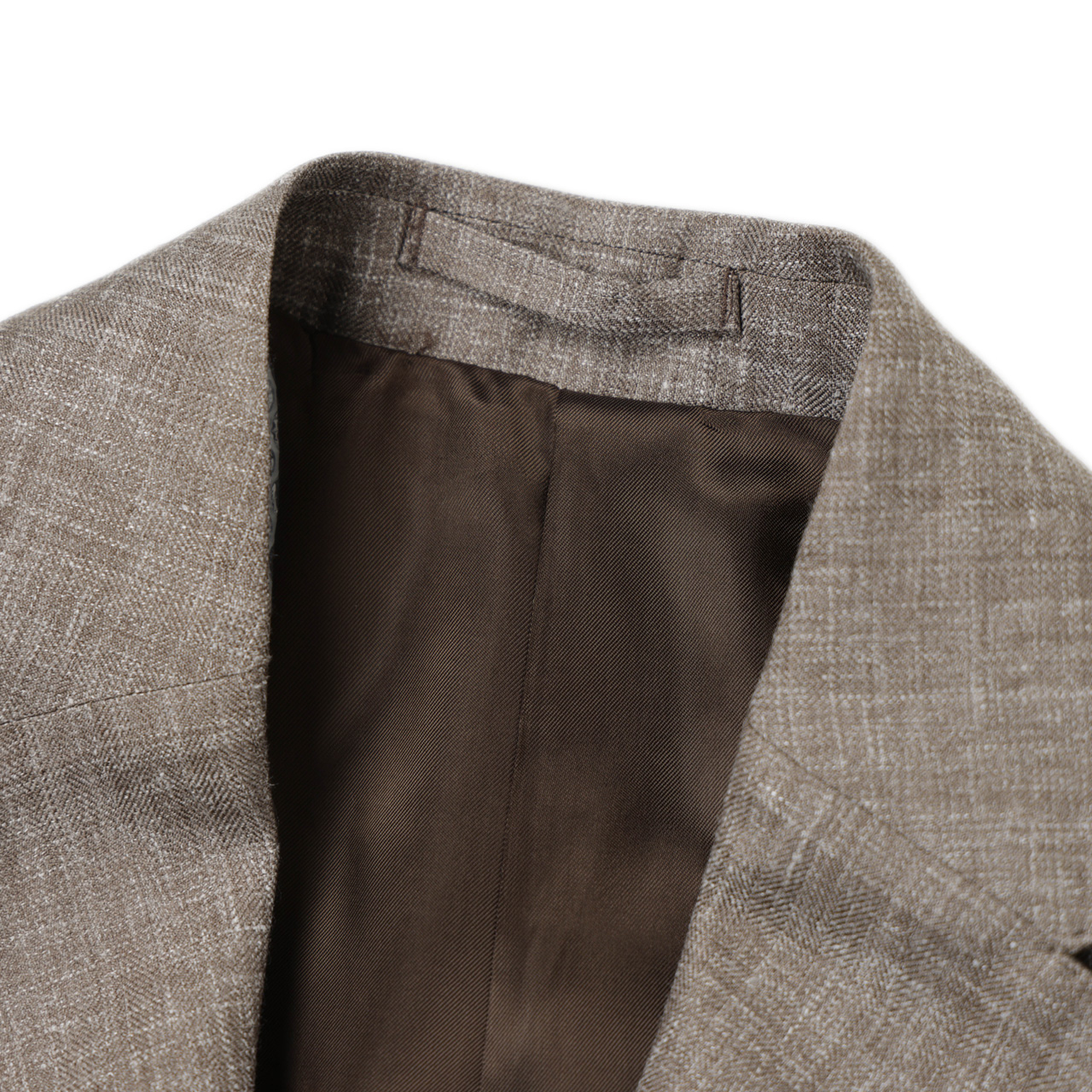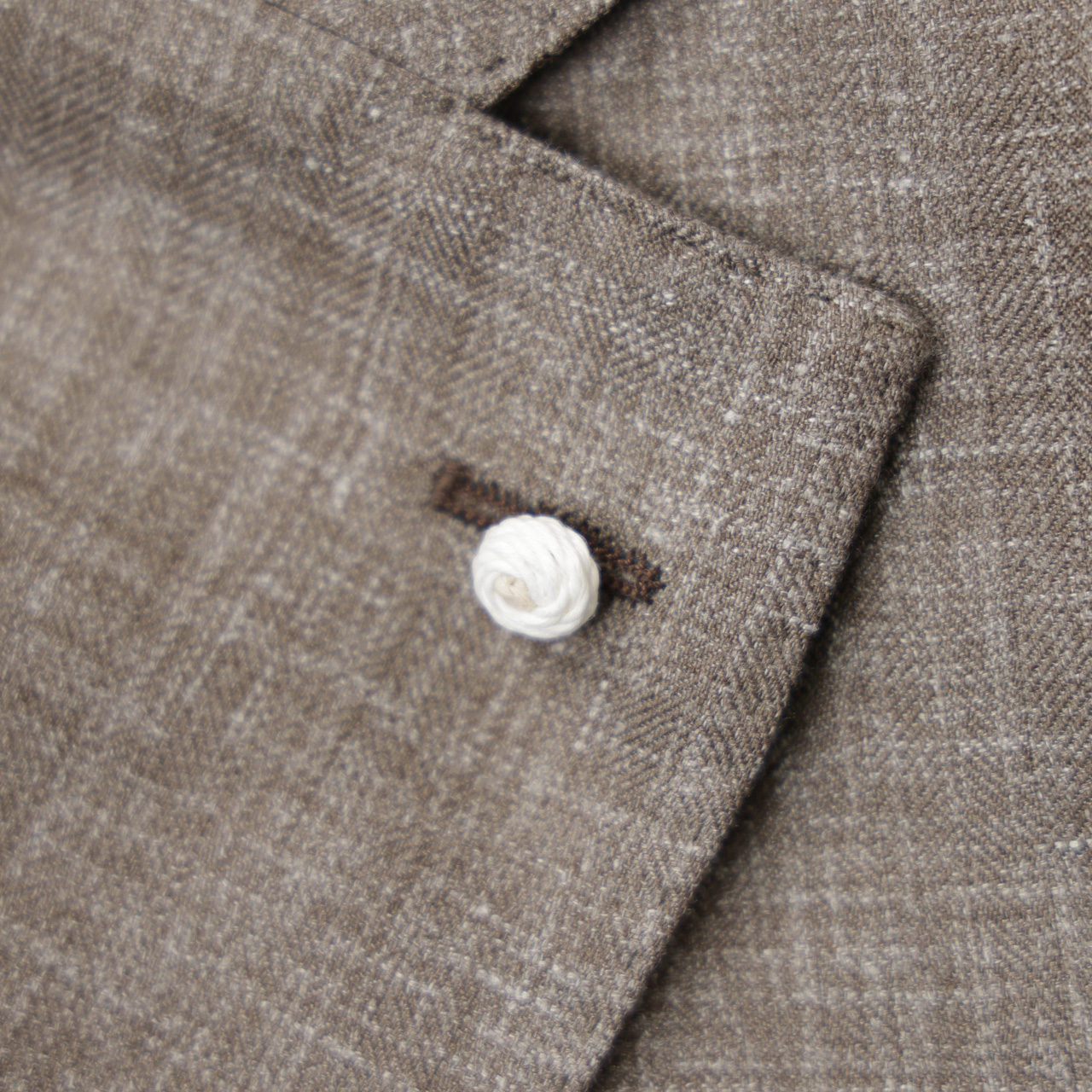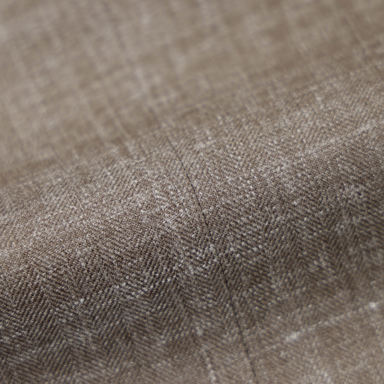 素材はウール、シルク、リネンの3者混地。ソフトで滑らかな上質素材を組み合わせた生地は非常に肌触りも滑らかで素材本来の艶も感じられる風合いに仕上がっております。アンコン仕立てになっておりますのでこの生地の良さをよりダイレクトに感じていただける上に、ソフトに体を包み込む感覚を味わっていただけます。