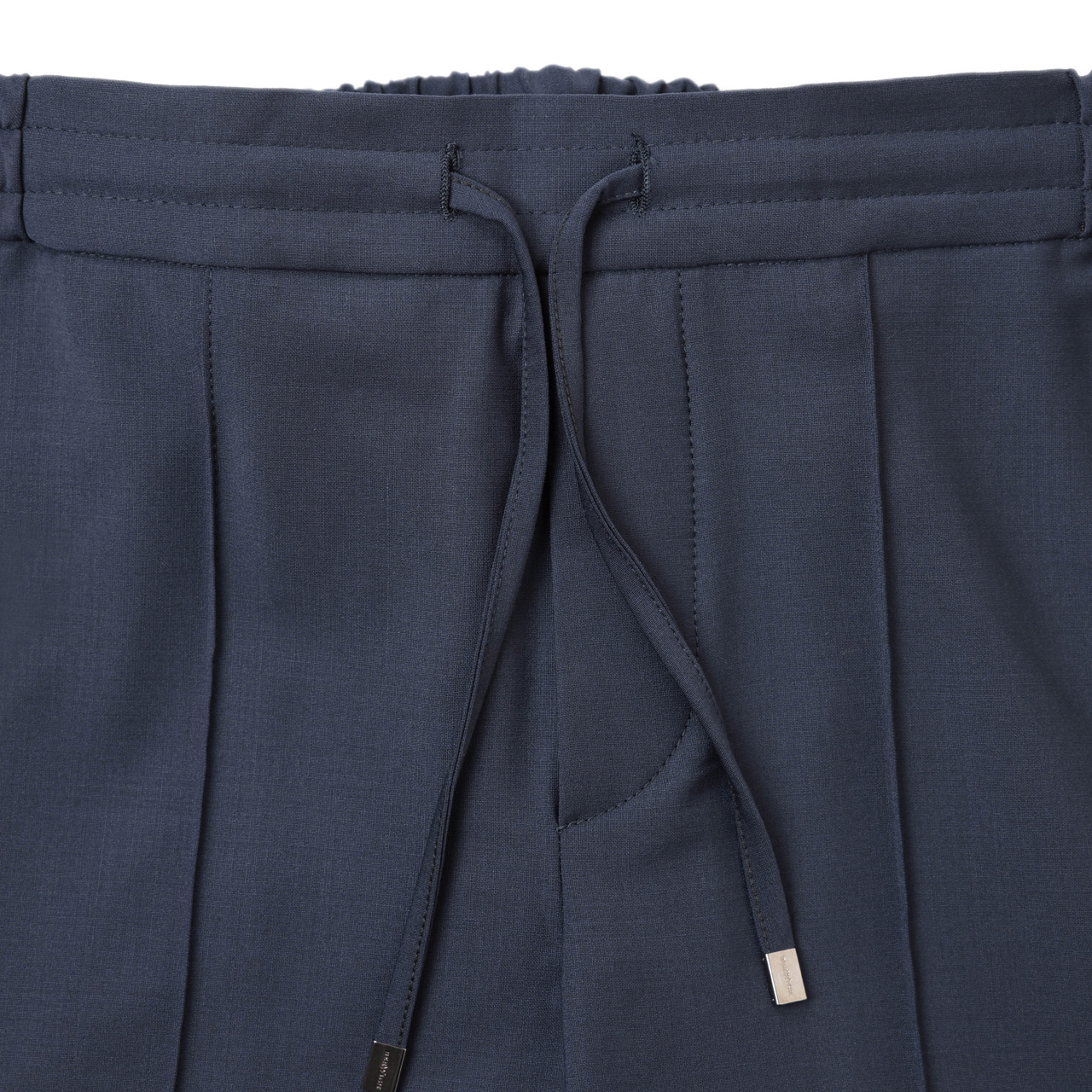 ウエストゴム+ドローコードのコンフォートな仕様にスラックスの様な裾のダブルの仕上げ、そして最大の特徴である「前後の永久クリース」。