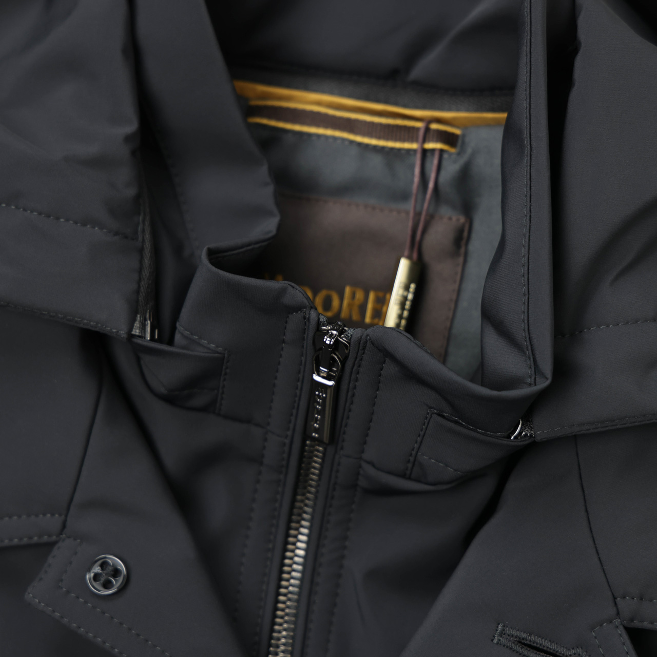 内側ジップの脇のパイピング、ジップ、ボタンは全て同社の特注パーツを使用。全てが極上の「MOORER」。モダンなブルゾンの着こなしをお楽しみください。