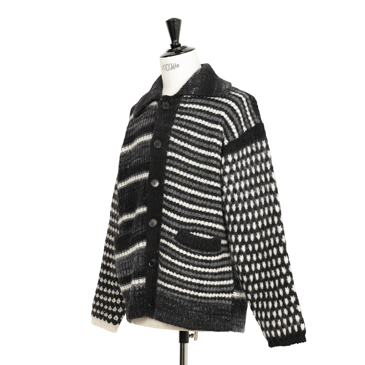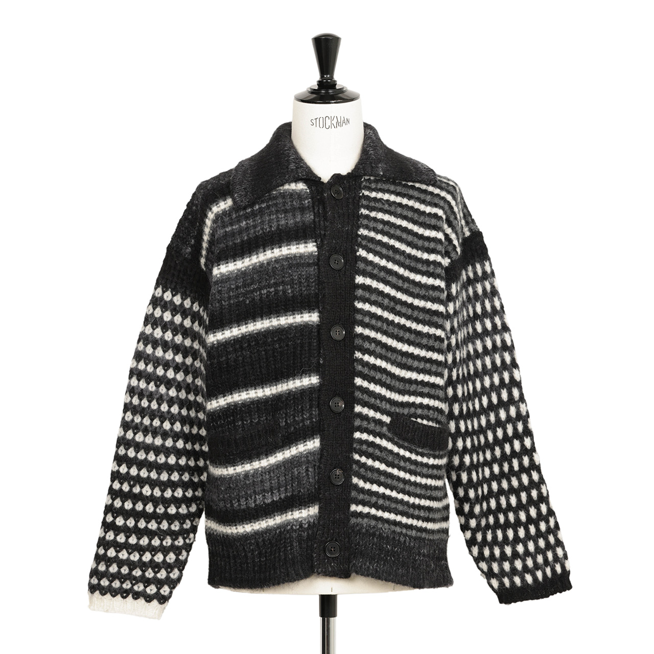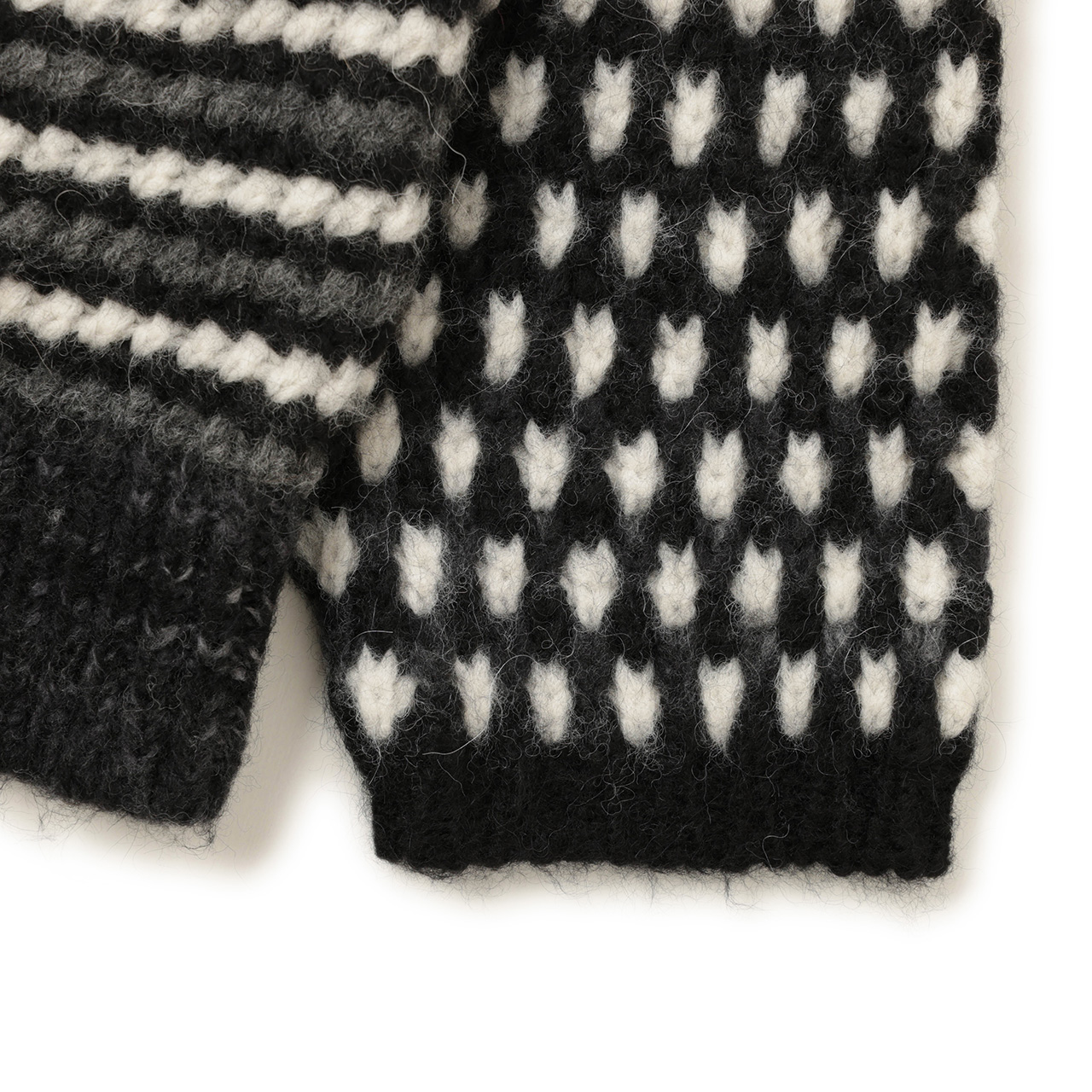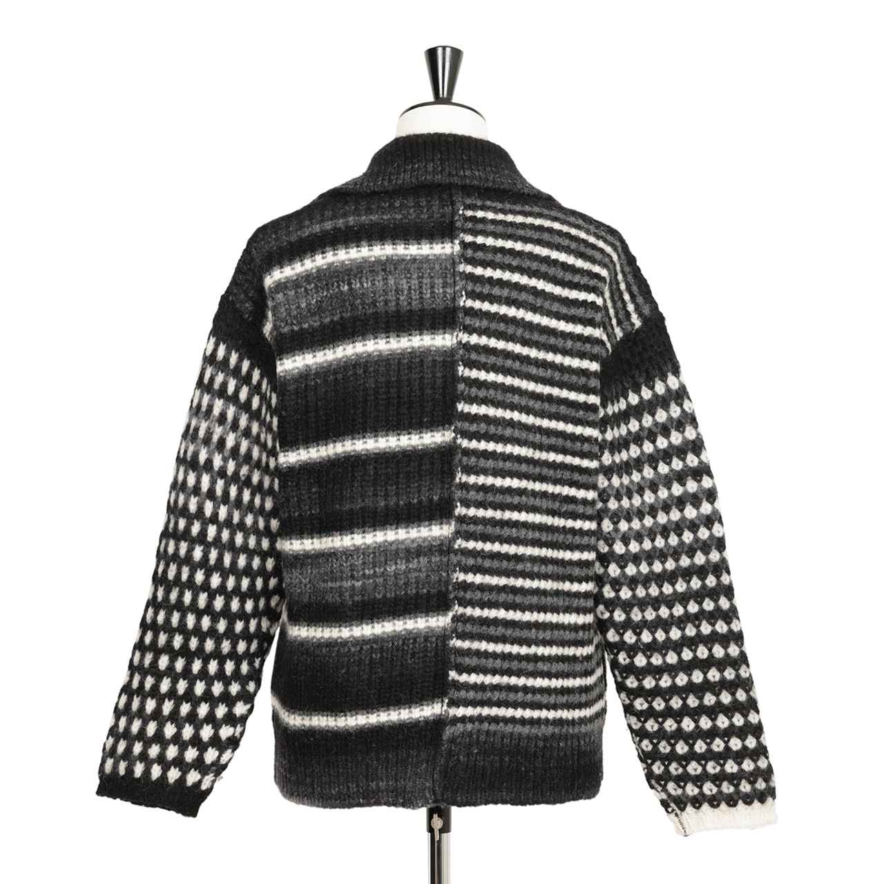 様々な柄を組み合わせたミックスステッチとマルチカラーのストライプを組み合わせたデザイン。ブラック、グレー、ホワイトのモノトーンカラーで構成している分、そこまで強く柄が出ない分、スタイリングに取り入れやすい一着となっております。
