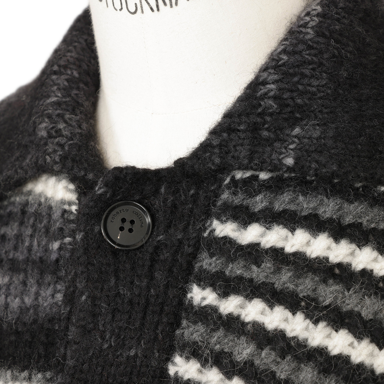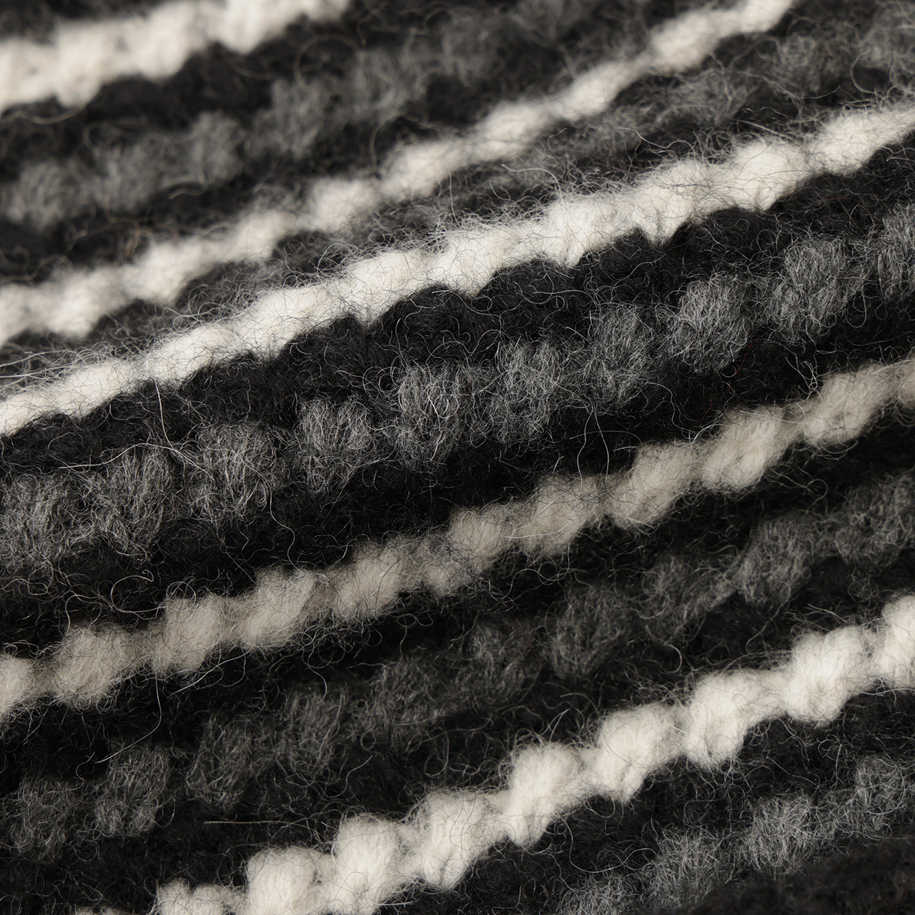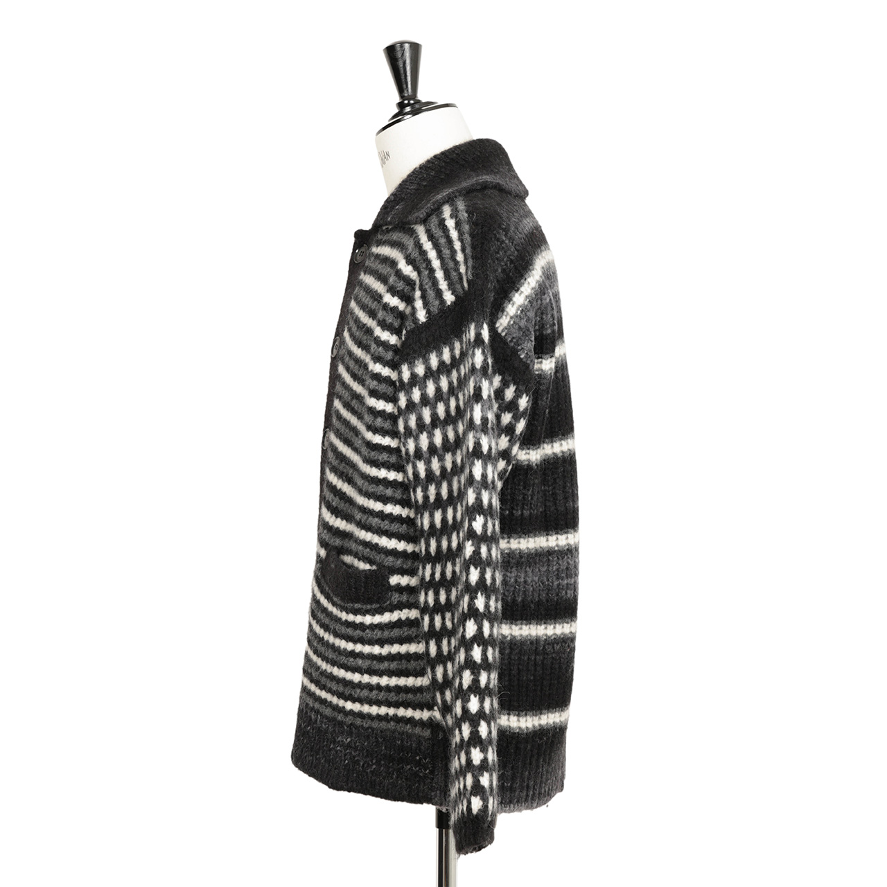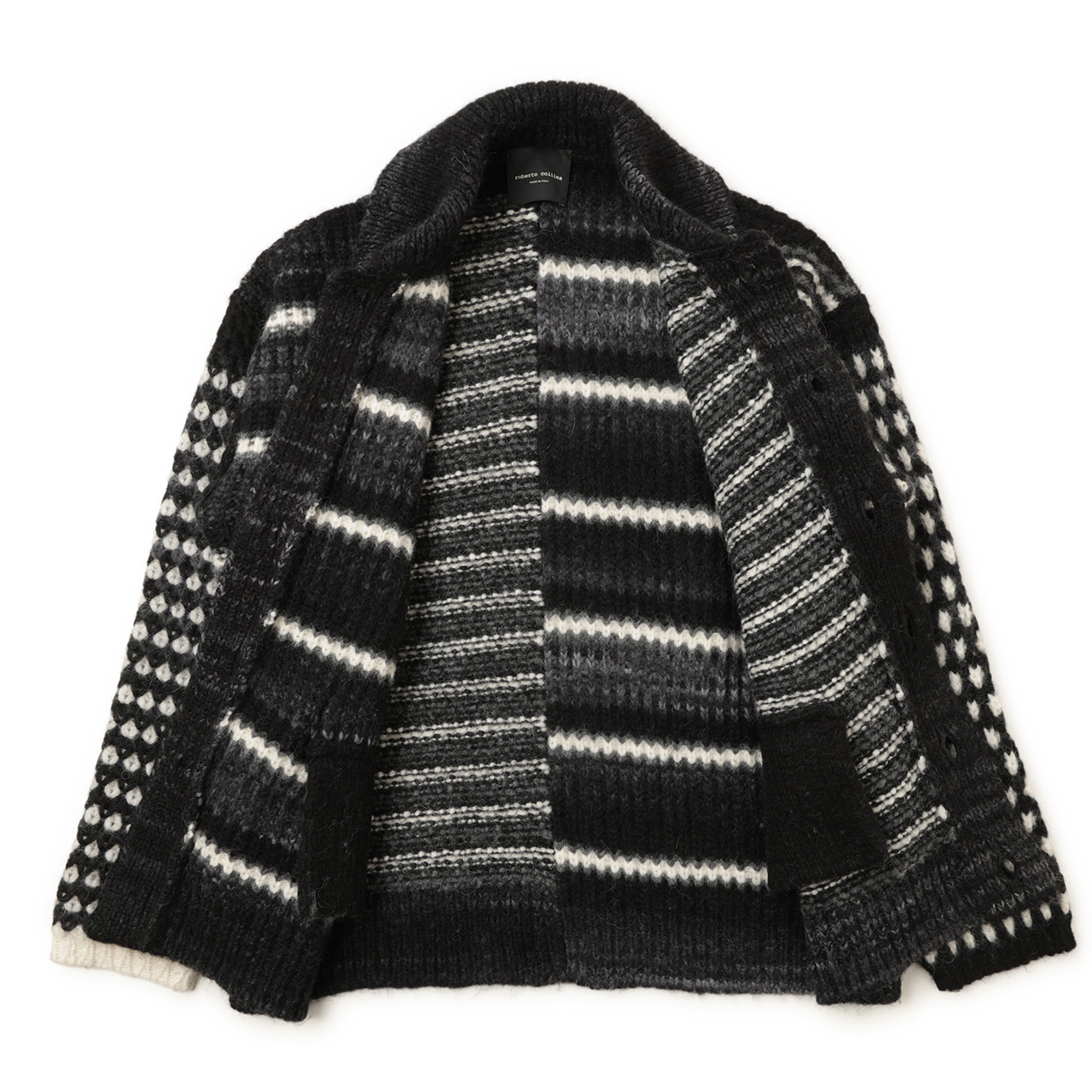 様々な柄を組み合わせたミックスステッチとマルチカラーのストライプを組み合わせたデザイン。ブラック、グレー、ホワイトのモノトーンカラーで構成している分、そこまで強く柄が出ない分、スタイリングに取り入れやすい一着となっております。