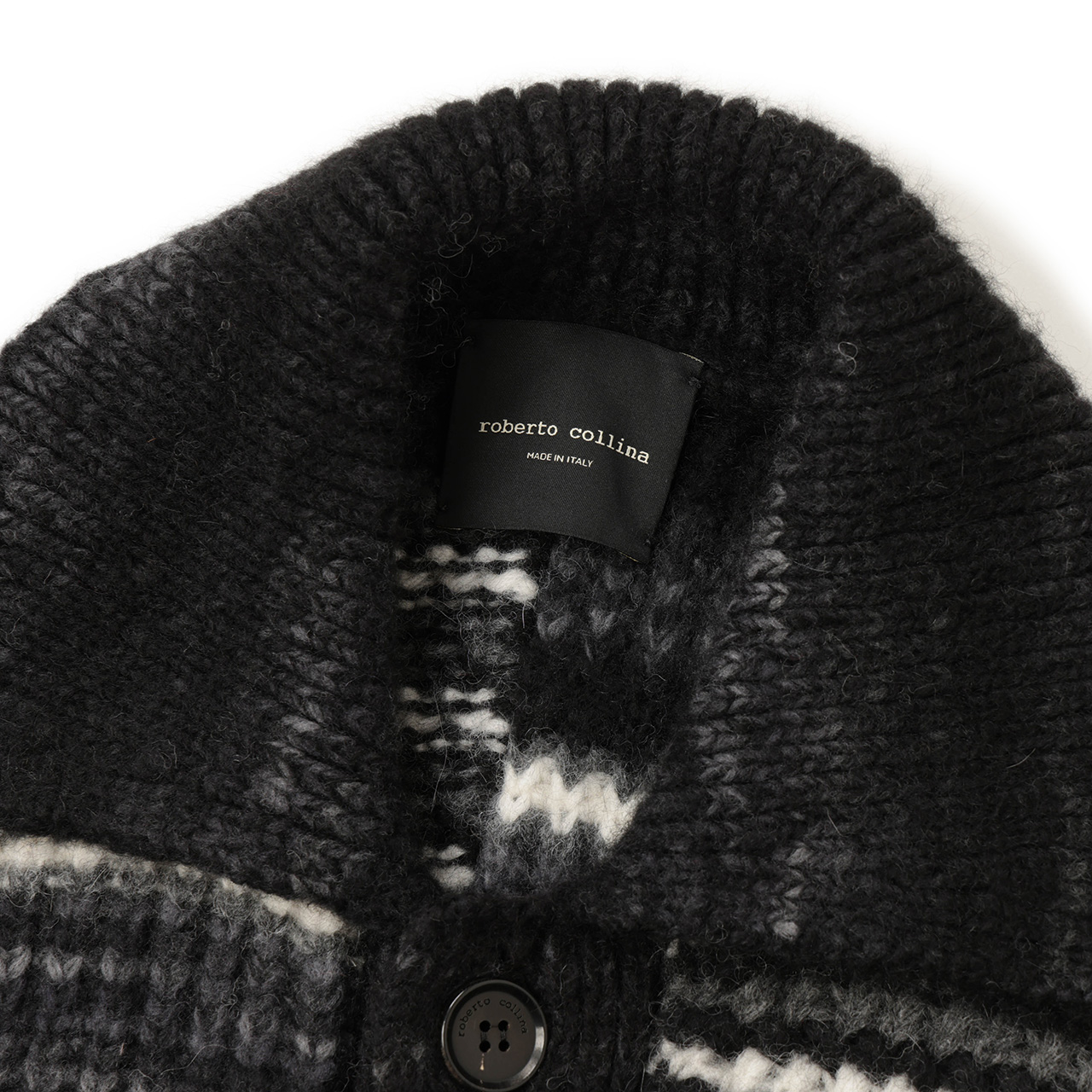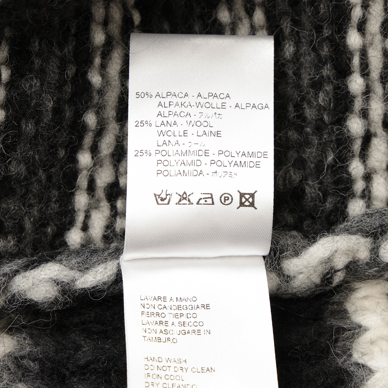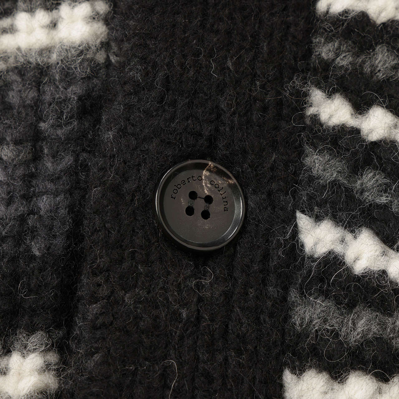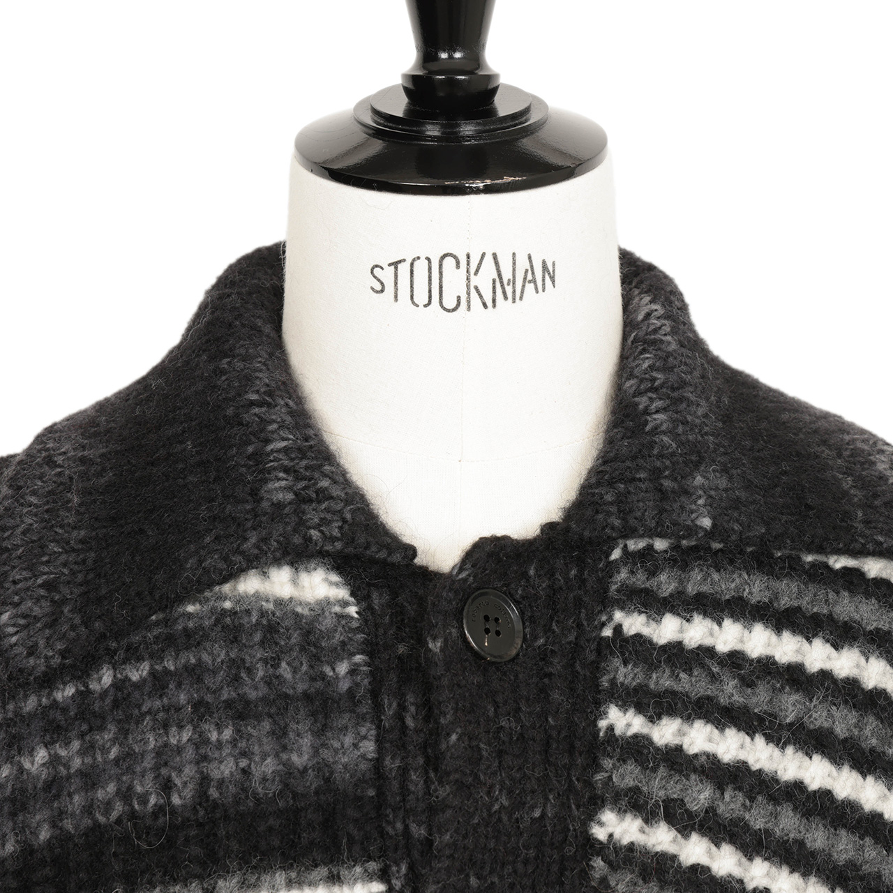 様々な柄を組み合わせたミックスステッチとマルチカラーのストライプを組み合わせたデザイン。ブラック、グレー、ホワイトのモノトーンカラーで構成している分、そこまで強く柄が出ない分、スタイリングに取り入れやすい一着となっております。