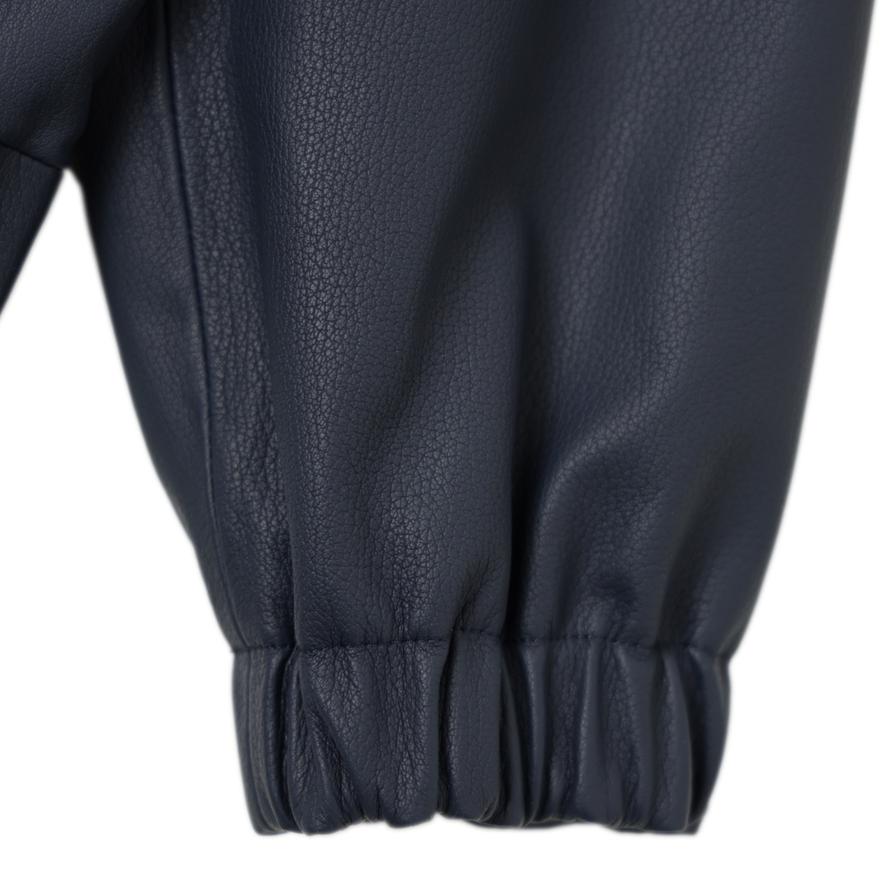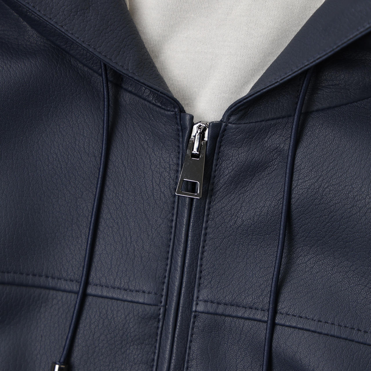 ライニングはフード、身頃にモダール素材のジャージ素材を使用しており、表地のゴートレザーの柔らかさ、コンフォートさを損ないません。
