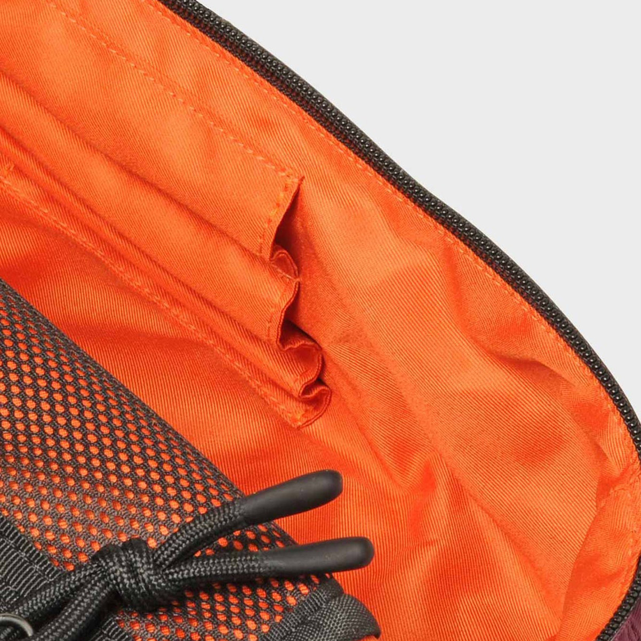 内側にはブラシホルダー、隠しファスナー付きポケット、メッシュ素材のトップポケットを備えています。さらに、ドローストリングで開閉できるオープンサイドポケットが2つ付いています。