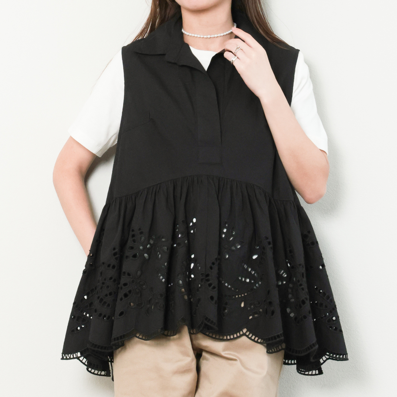 PROTAGONISTA プロタゴニスタ シャツ ブラウス ノースリーブ ギャザー コットン レース 刺繍 PNT-BL-10C BLACK/ブラック
