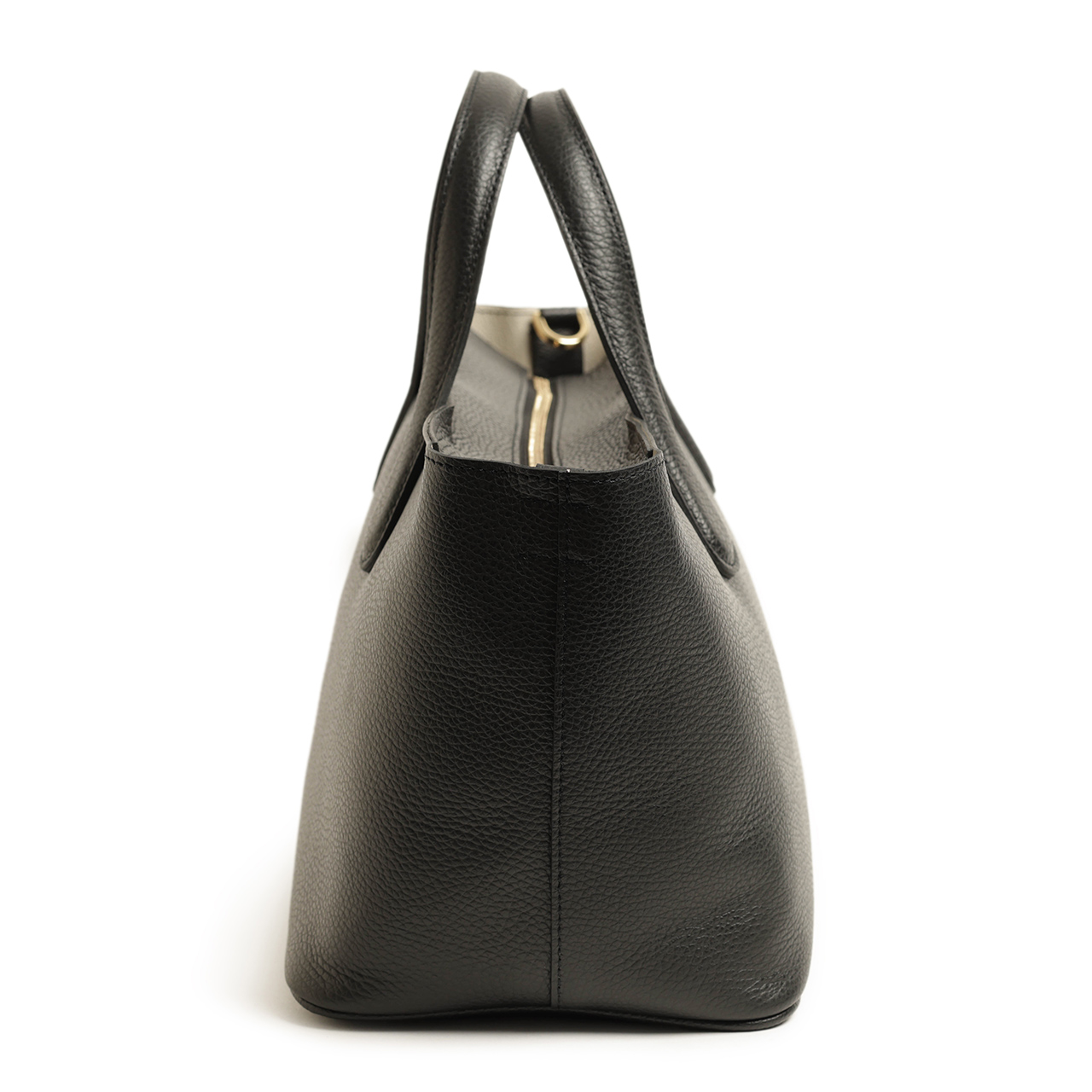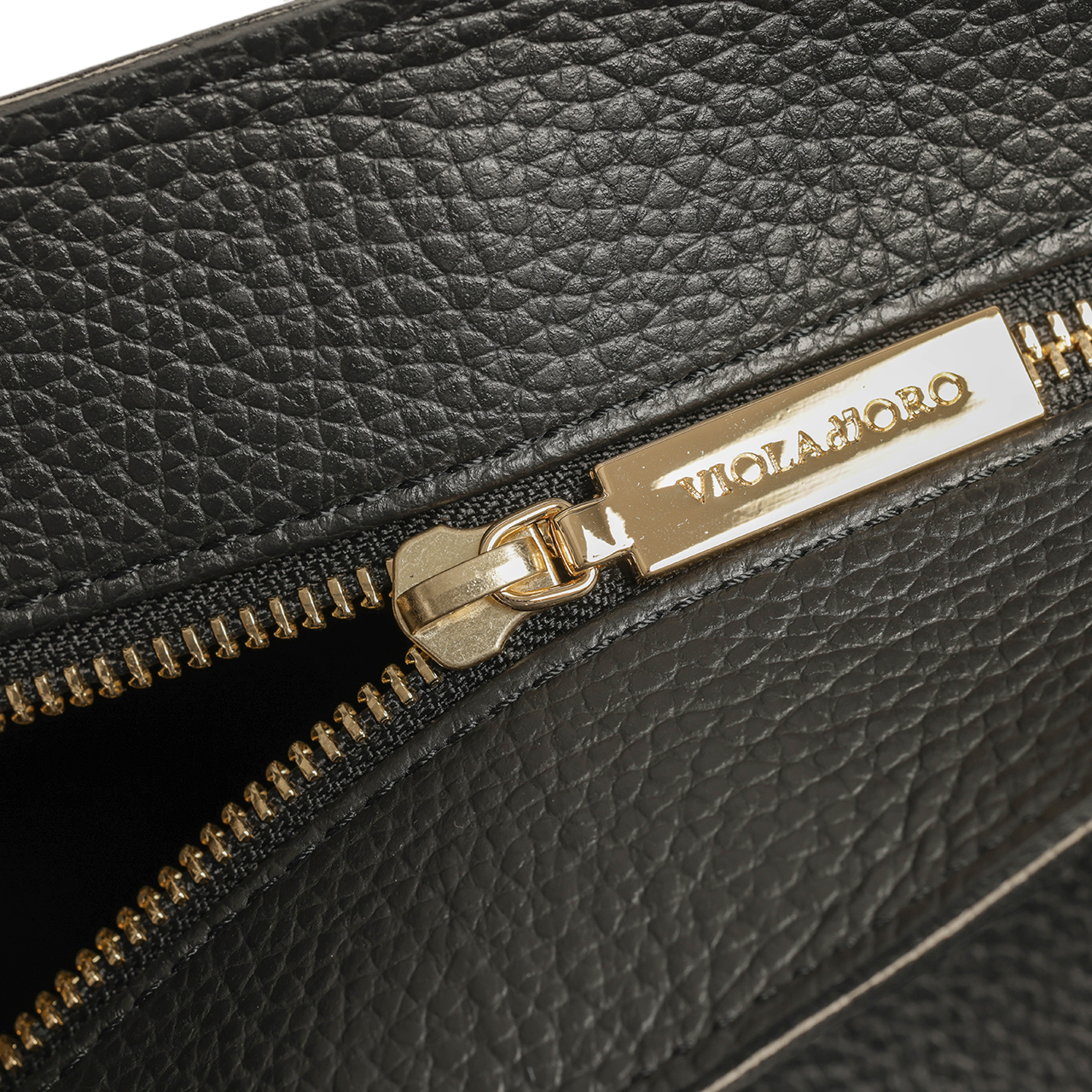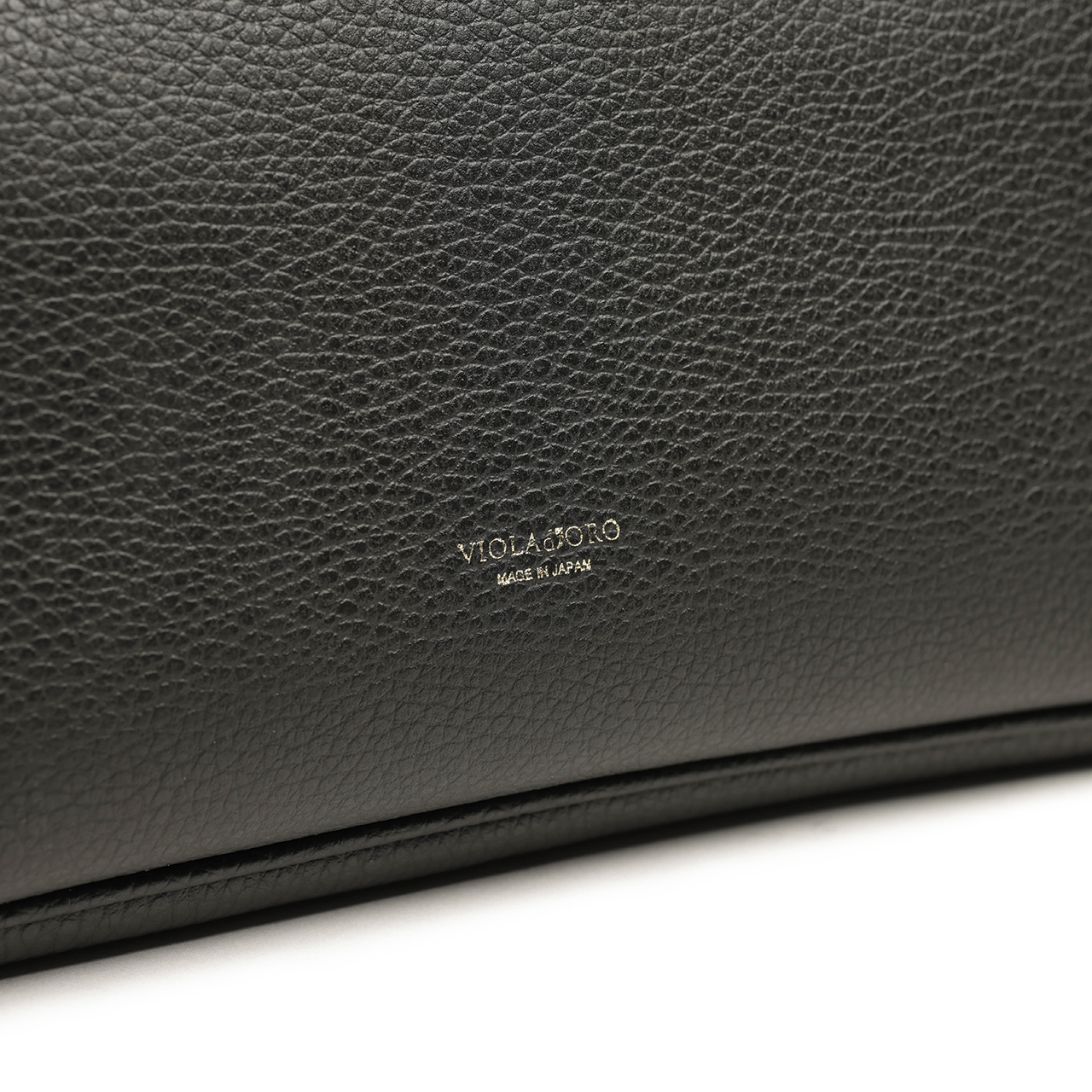 素材にはVIOLAd'OROおなじみの素材「イタリアンレザー」を使用。程よく肉厚でモチっとした革質、艶やかな風合いに、ゴールド金具の上品なアクセントが映える一品です。ダブルフェイス仕様になっておりまして、内側からちらっと覗くグレーカラーもアクセントに。