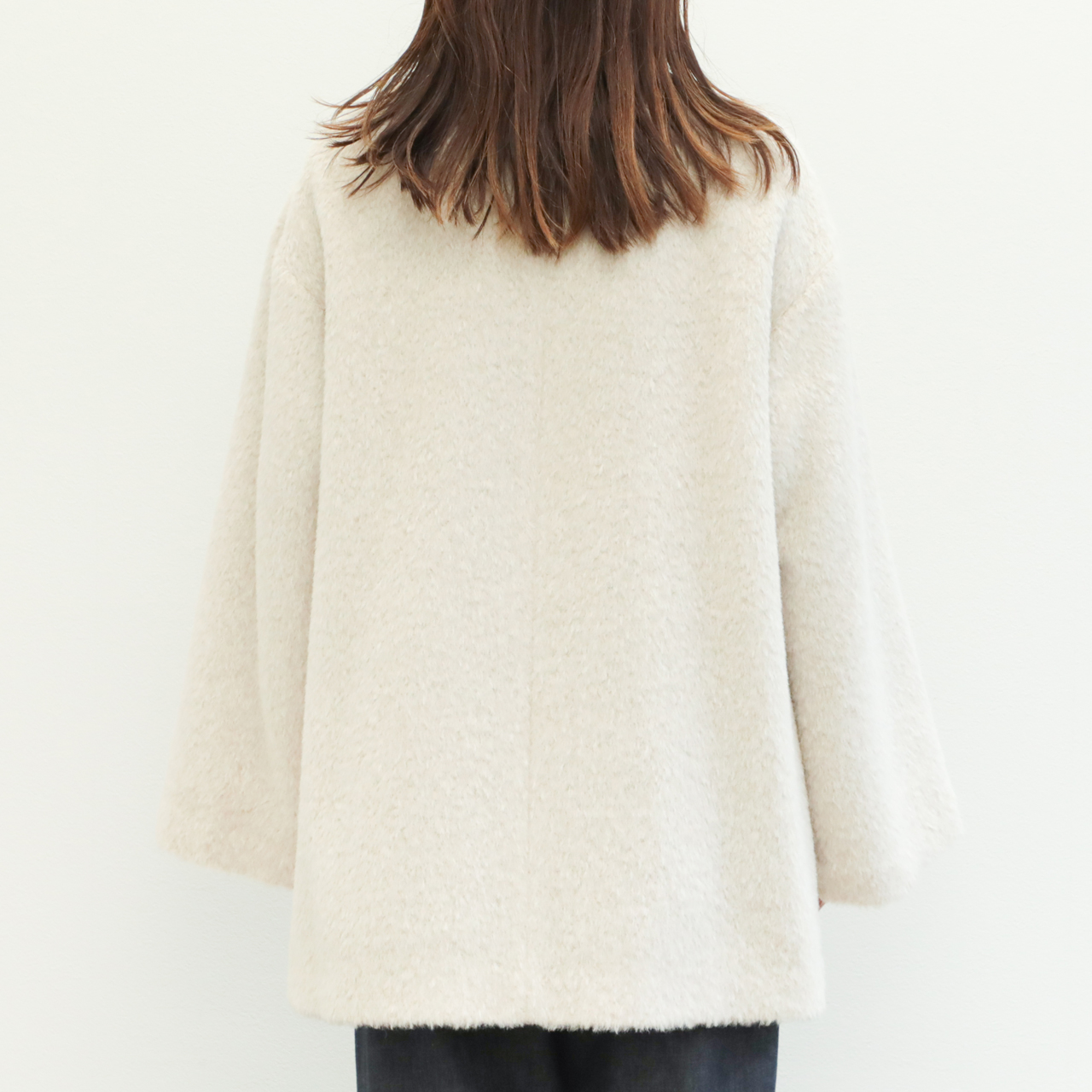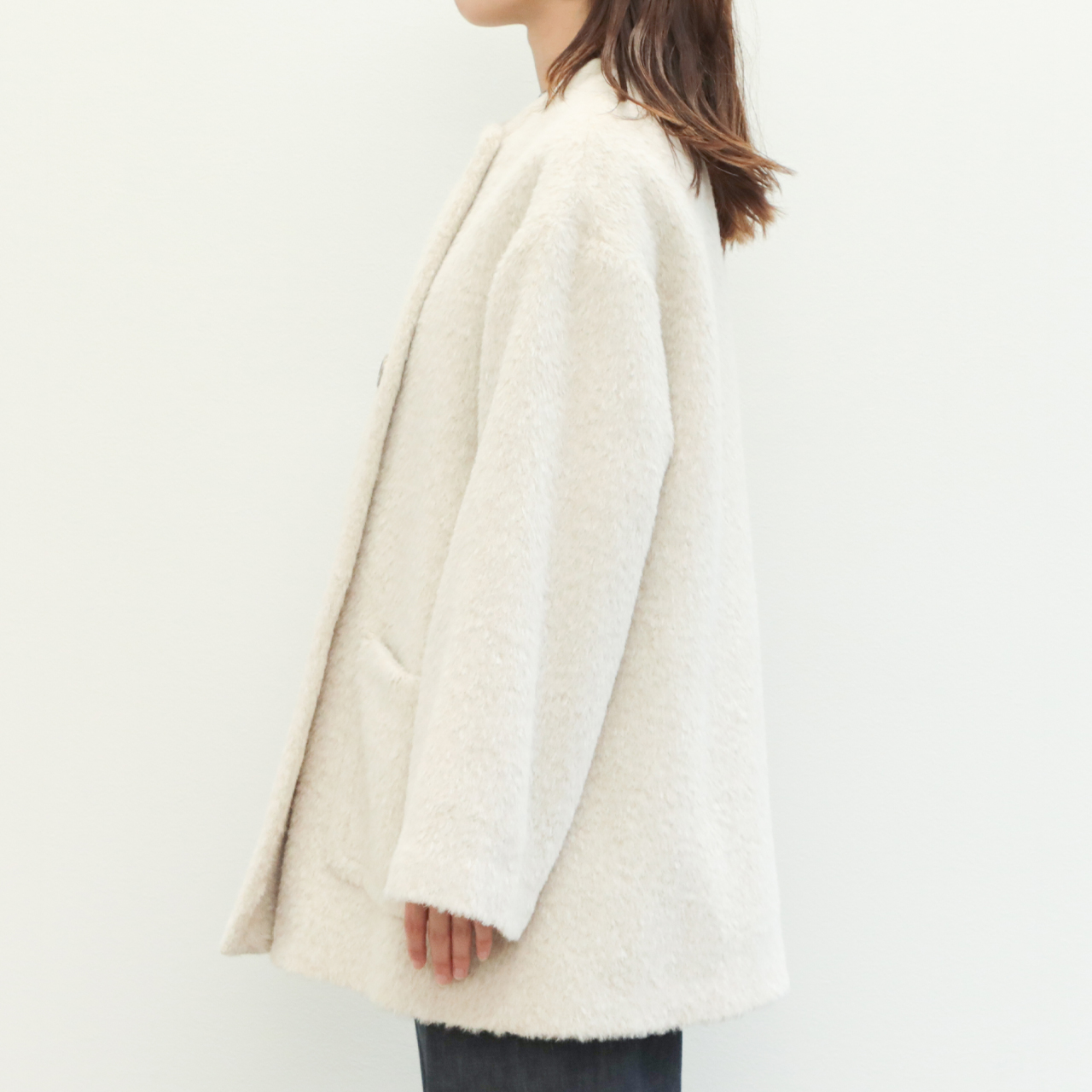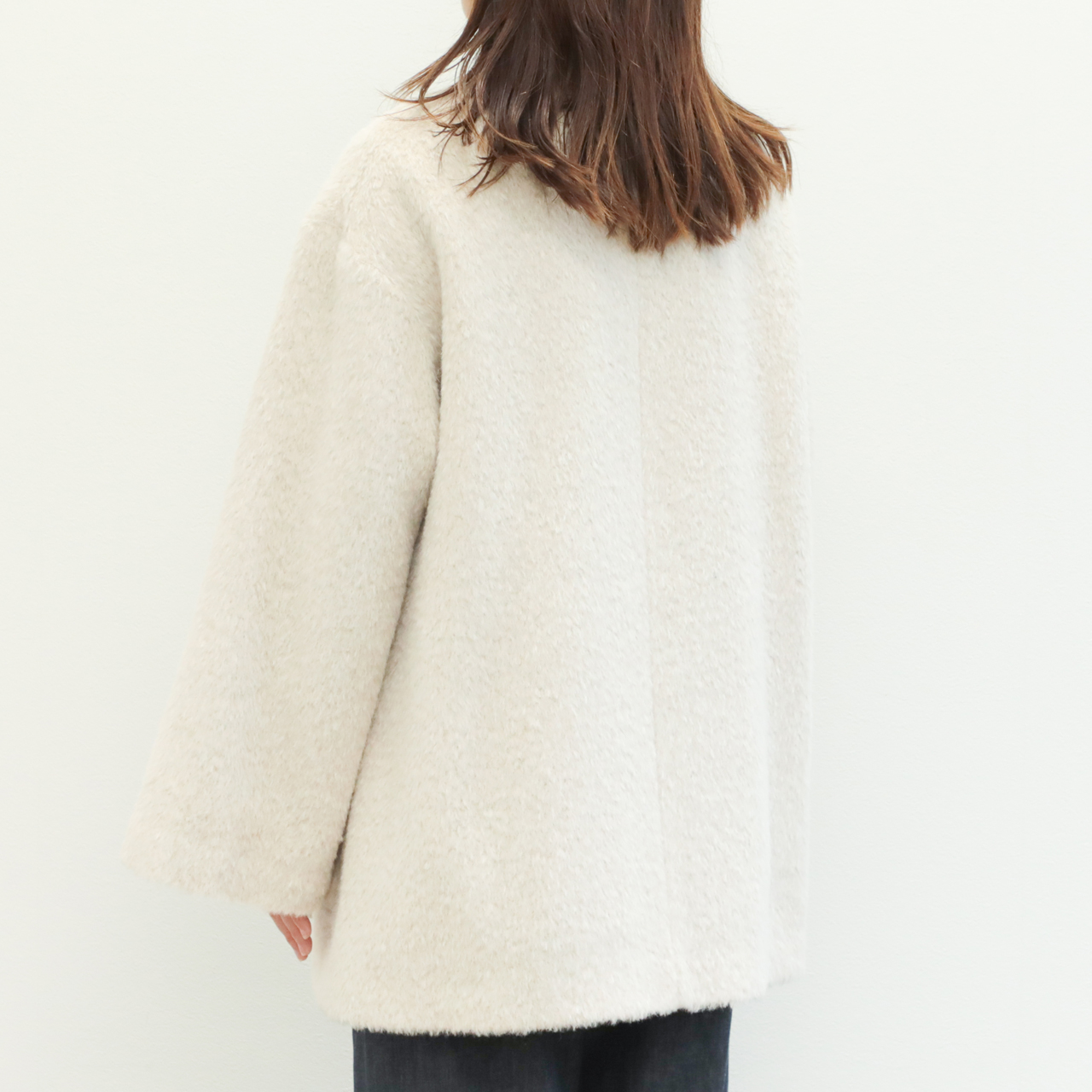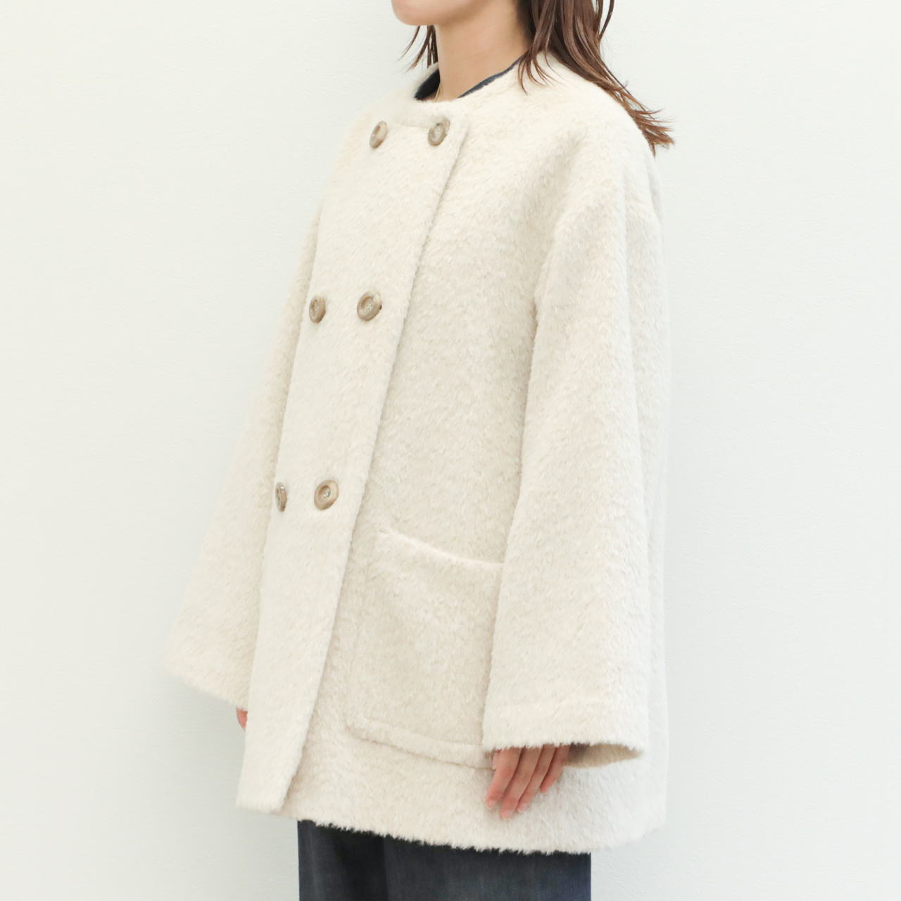今季は昨年好評だったアルパカシャギー地を使用し新作をオーダー。フェミニンさが引き立つノーカラー+Aラインシルエットが目を惹きます。