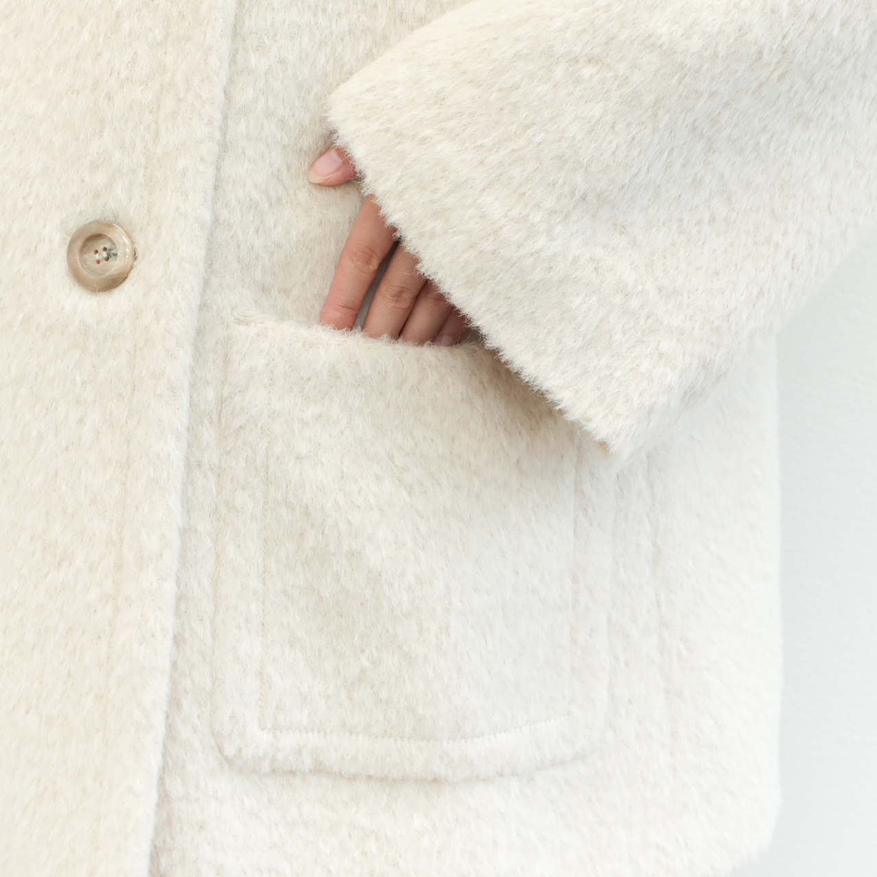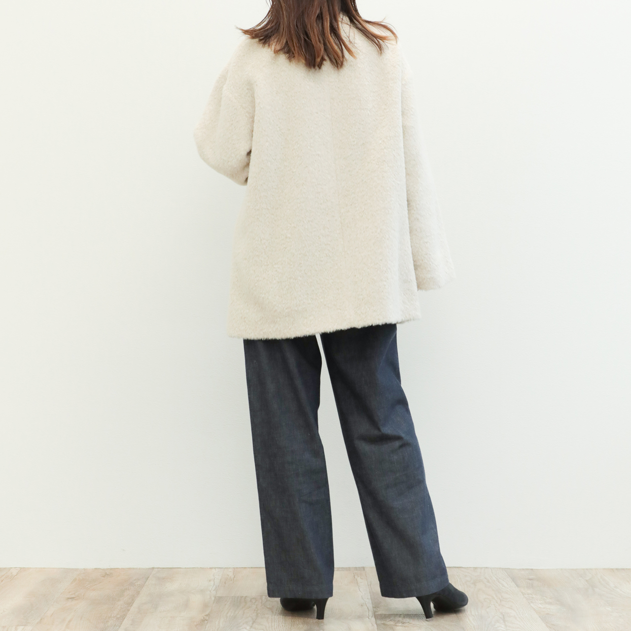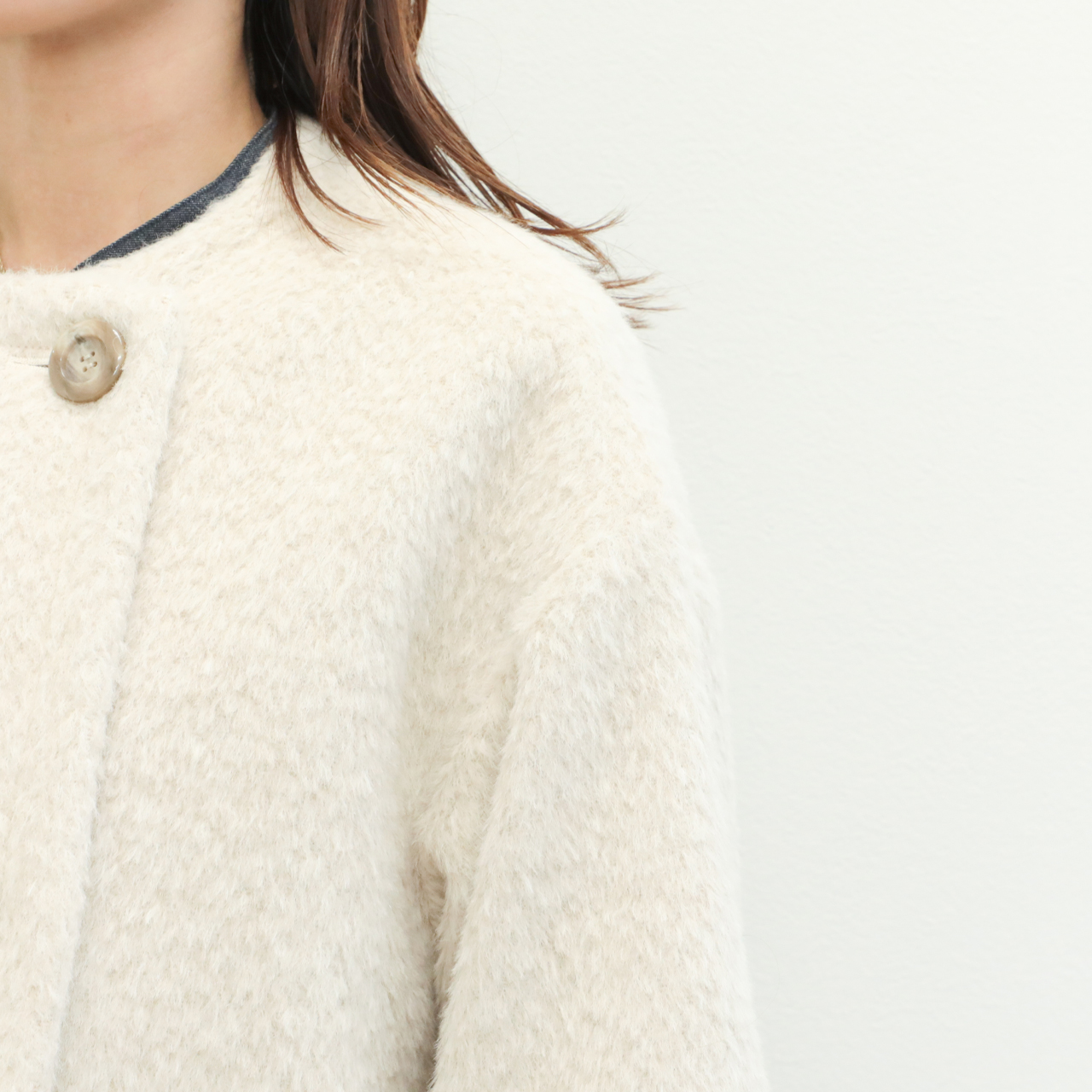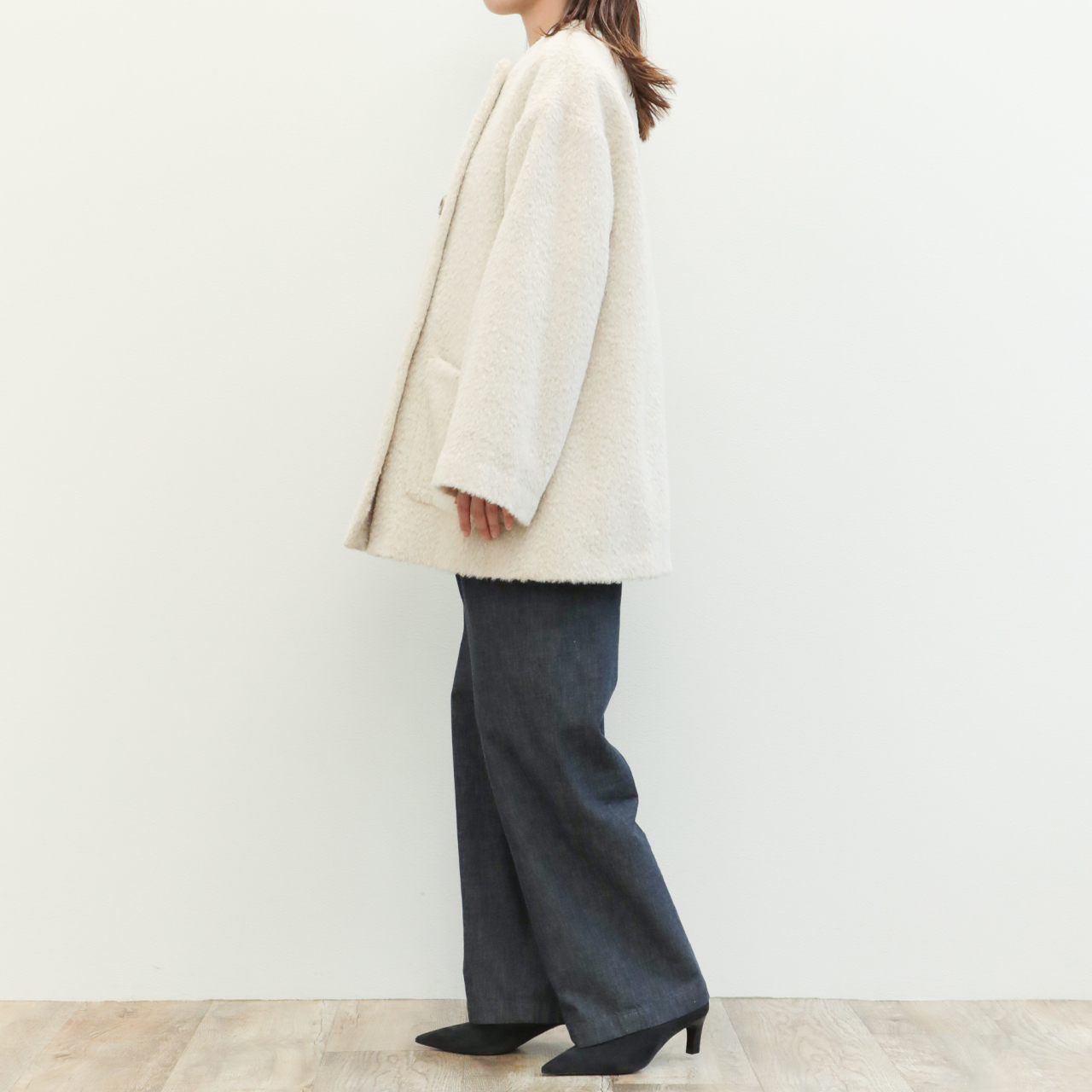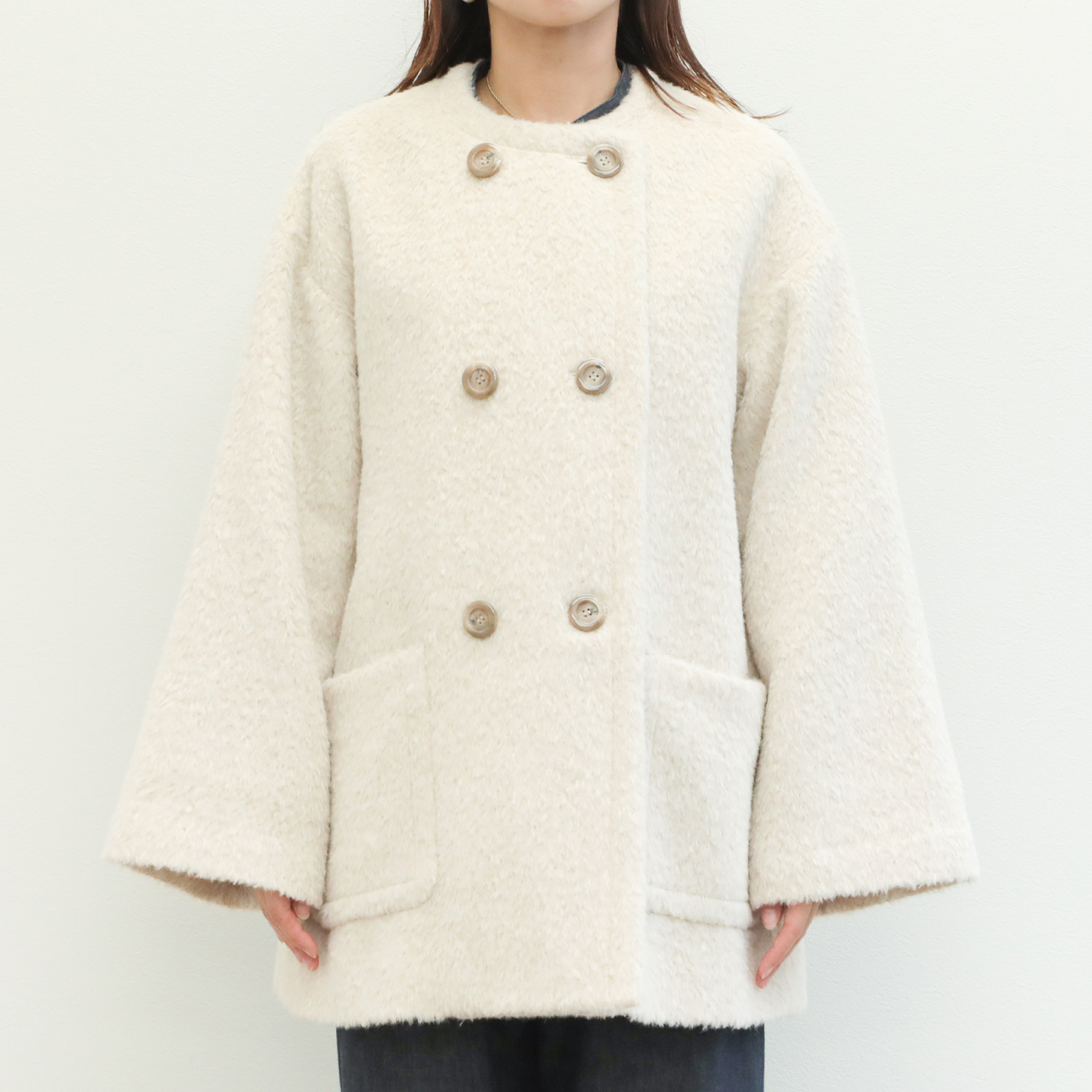 今季は昨年好評だったアルパカシャギー地を使用し新作をオーダー。フェミニンさが引き立つノーカラー+Aラインシルエットが目を惹きます。