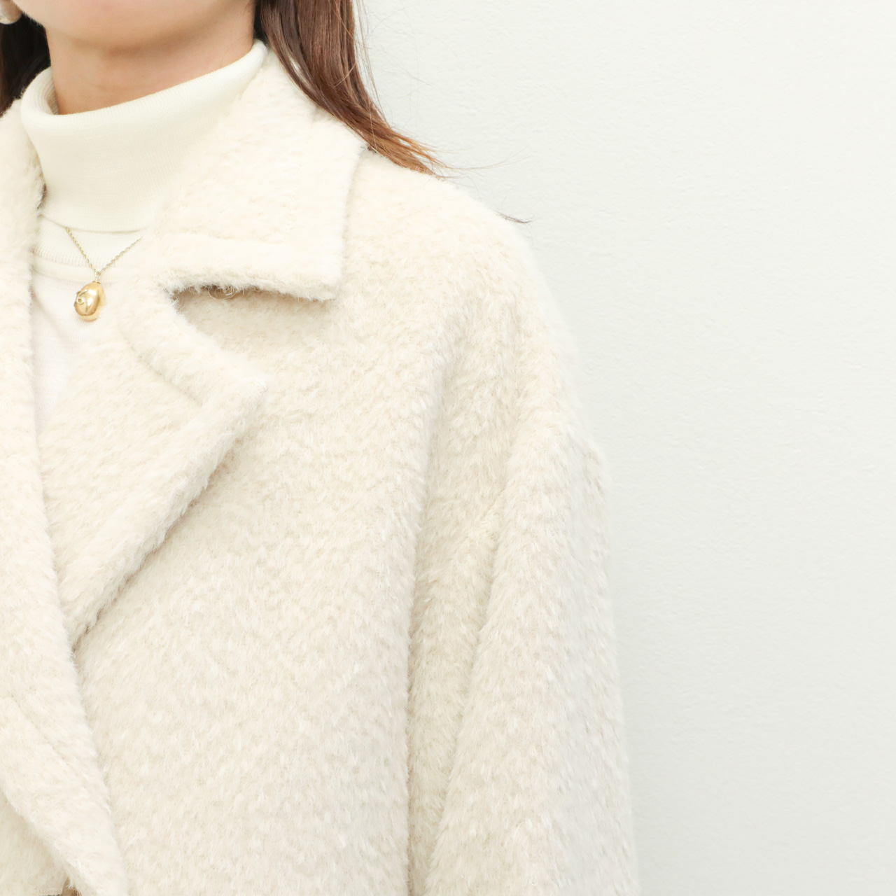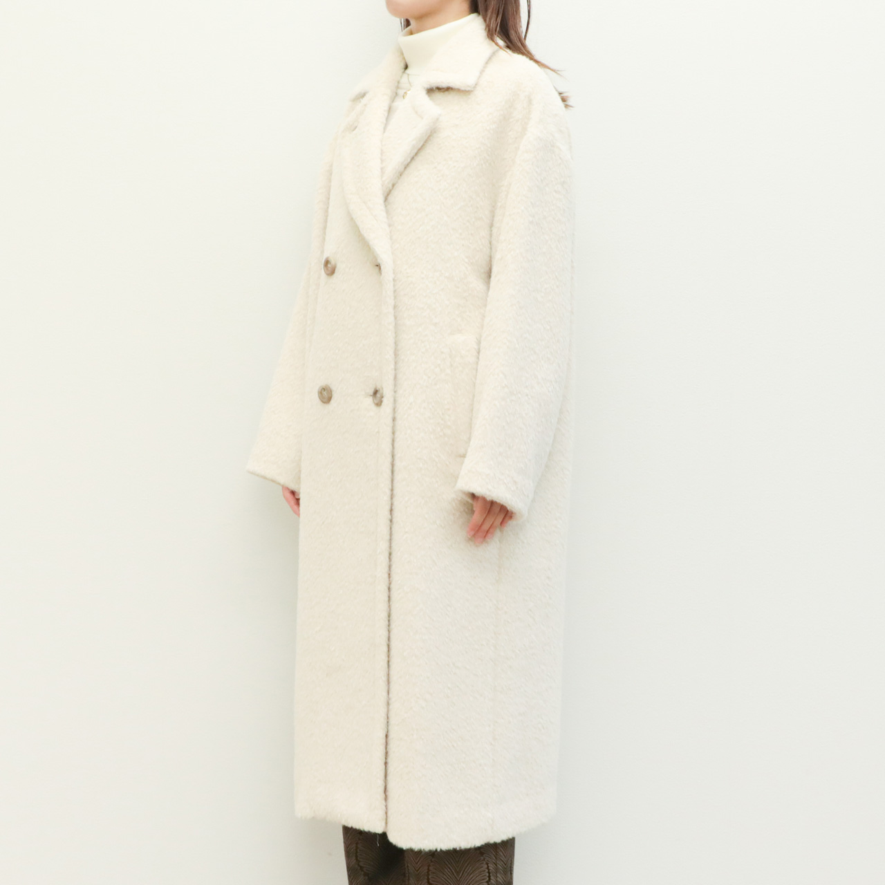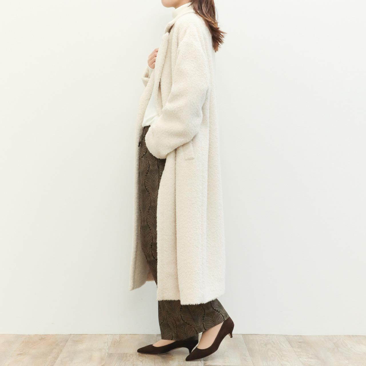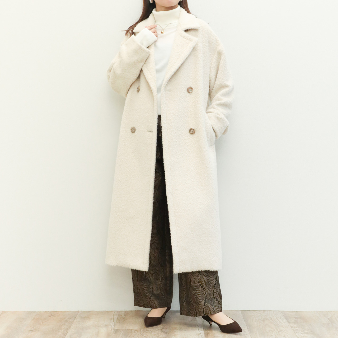前立てはダブルブレストになっており重厚感が感じさせつつも、シャギー素材で女性ならではの柔らかさや優し気な雰囲気が演出されています。襟サイズも大きめに設定し、メンズのヴィンテージコートをレディースが羽織っているような雰囲気でスタイリングを組むのも面白そうです。