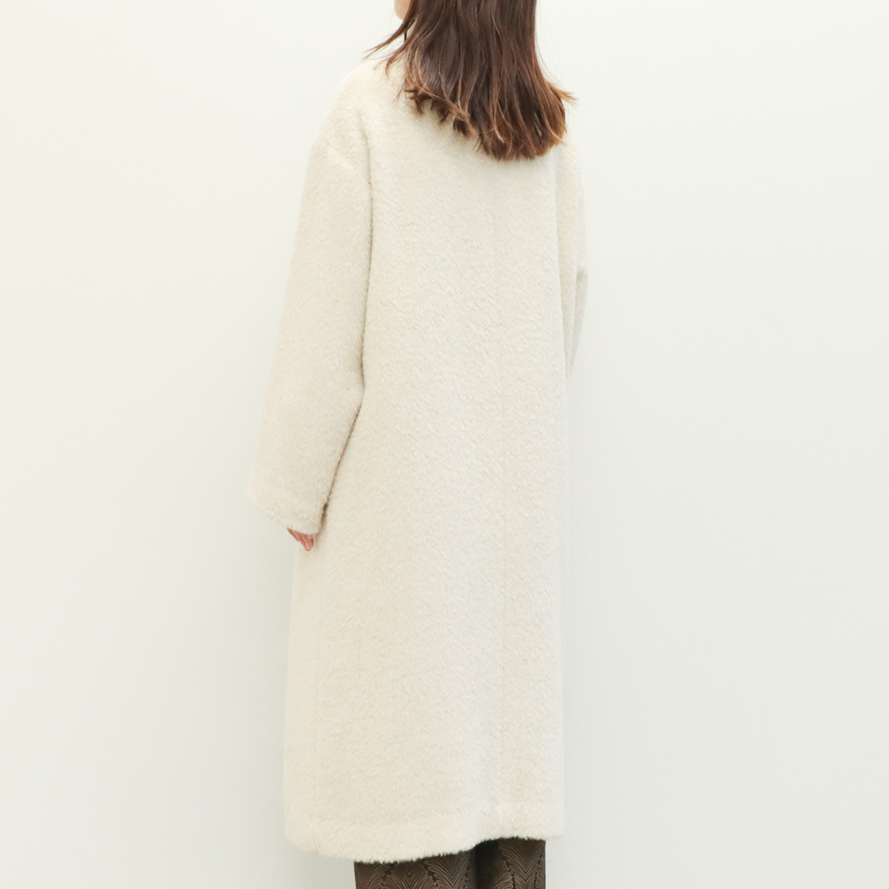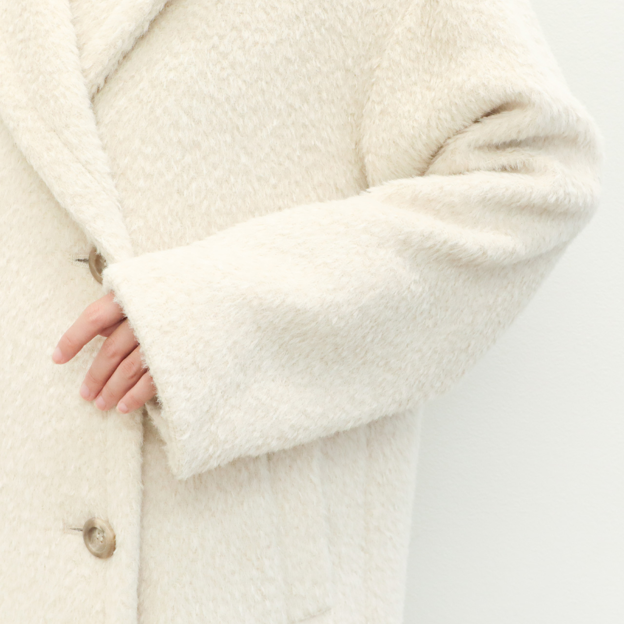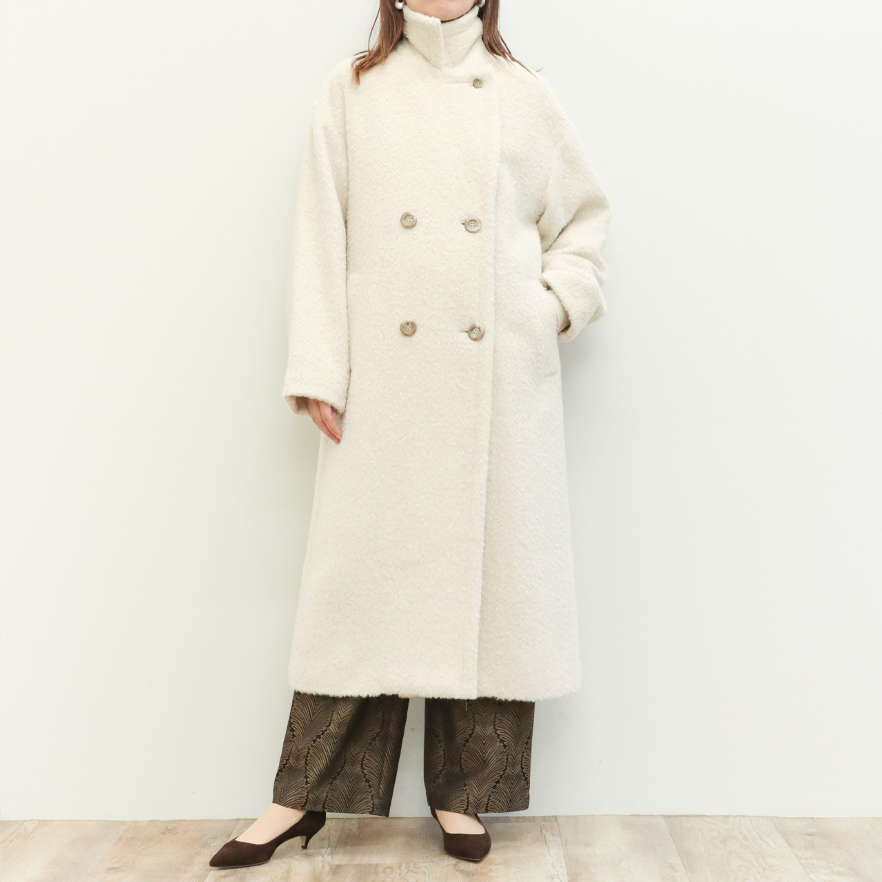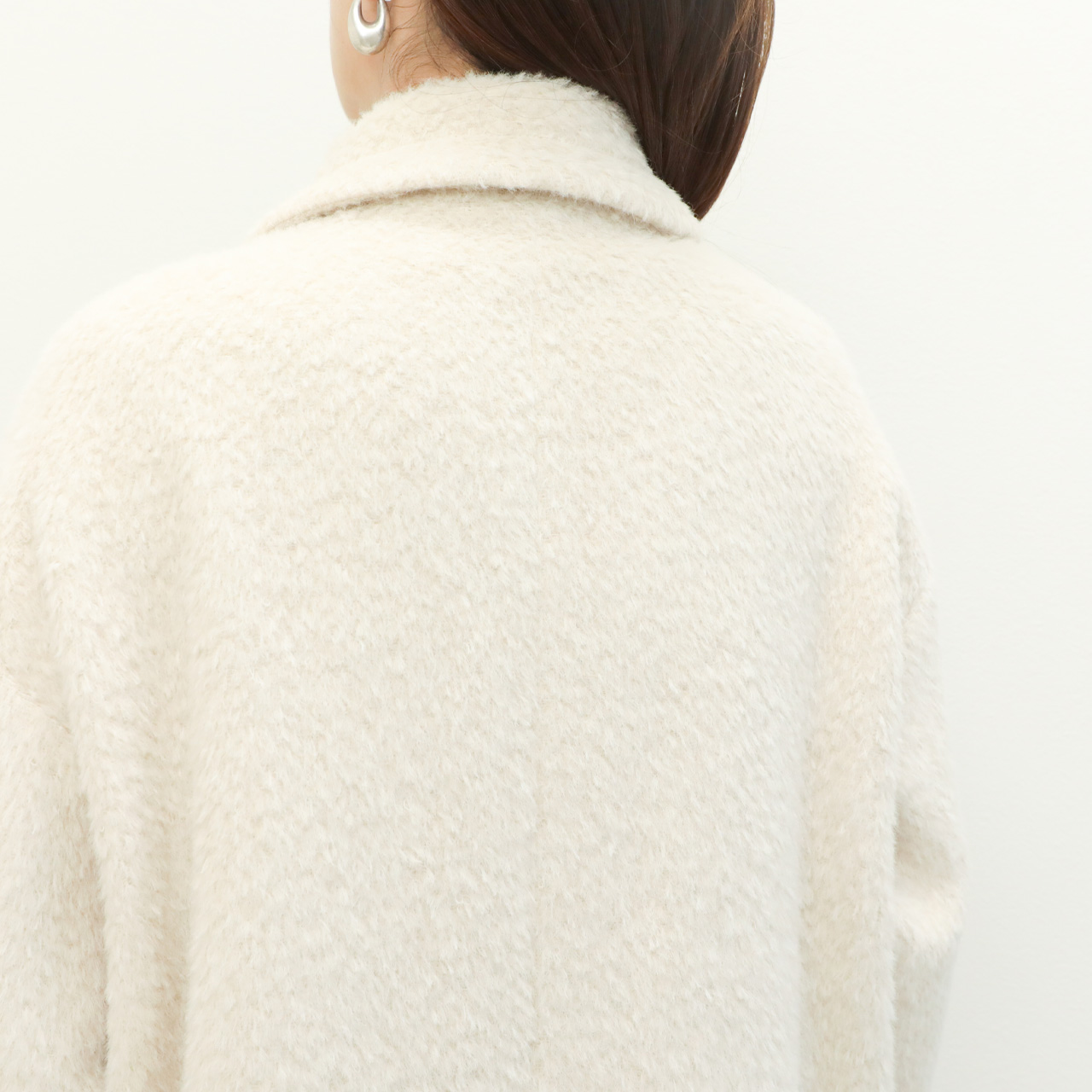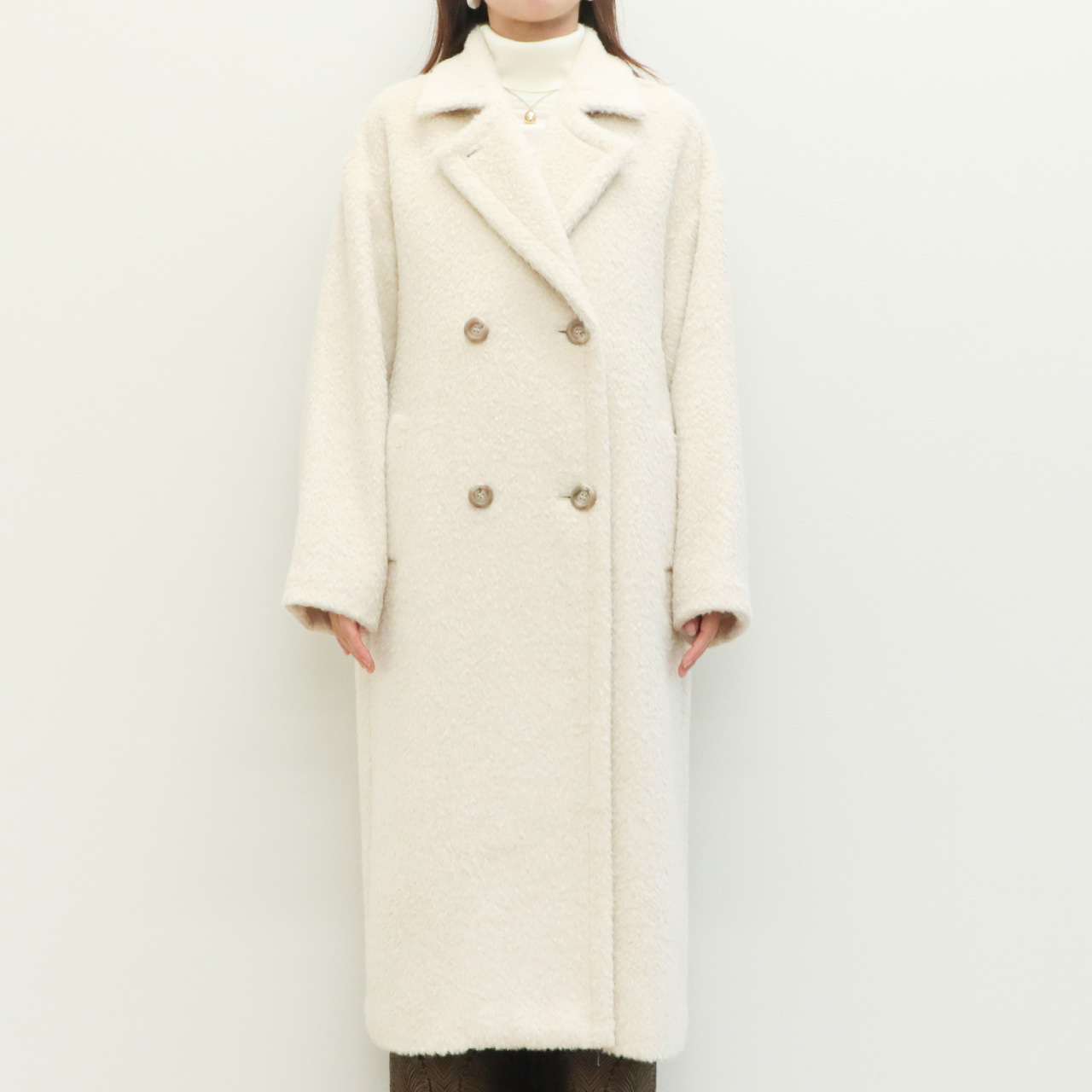 前立てはダブルブレストになっており重厚感が感じさせつつも、シャギー素材で女性ならではの柔らかさや優し気な雰囲気が演出されています。襟サイズも大きめに設定し、メンズのヴィンテージコートをレディースが羽織っているような雰囲気でスタイリングを組むのも面白そうです。