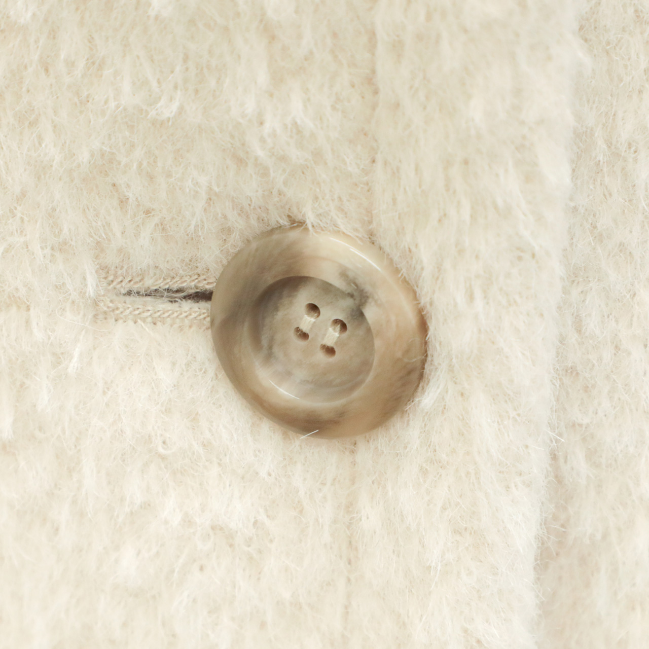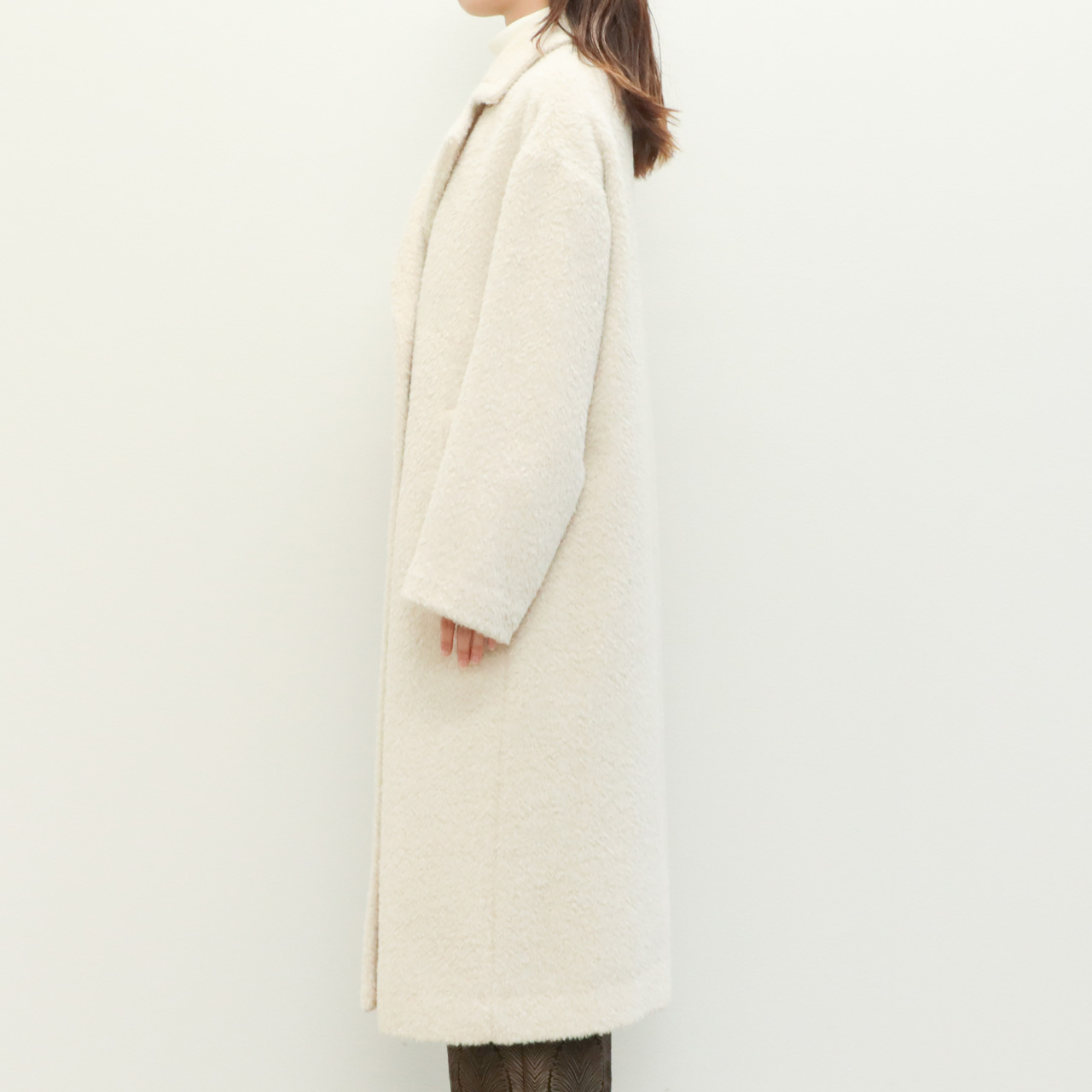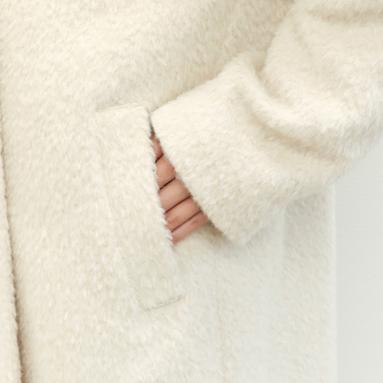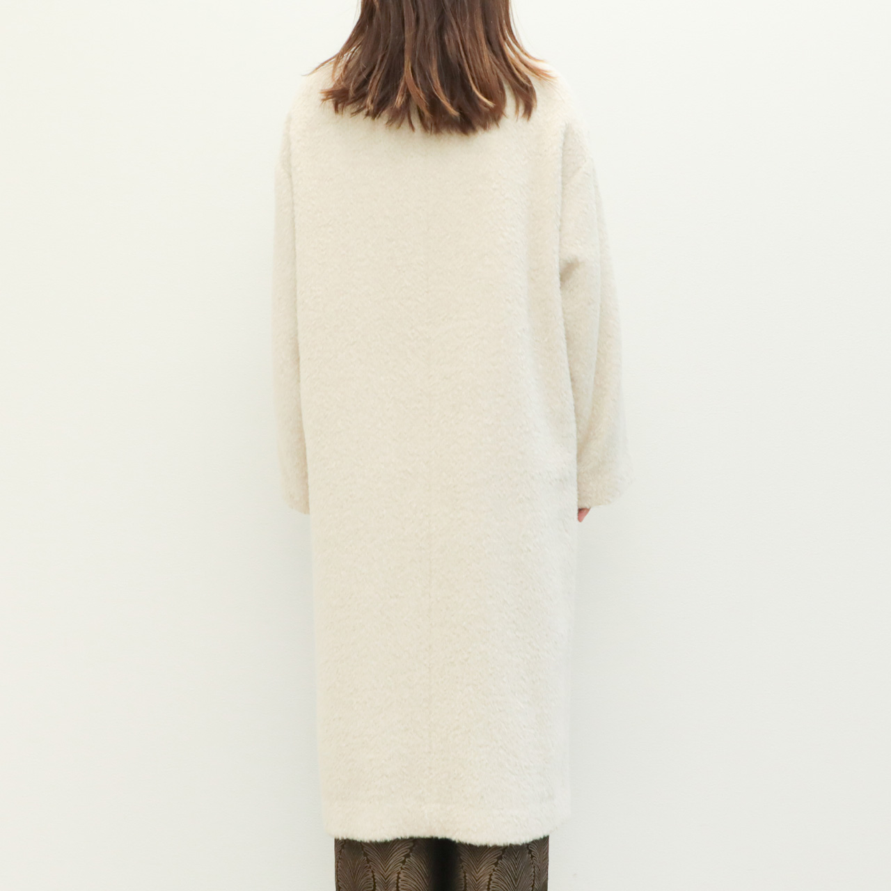 前立てはダブルブレストになっており重厚感が感じさせつつも、シャギー素材で女性ならではの柔らかさや優し気な雰囲気が演出されています。襟サイズも大きめに設定し、メンズのヴィンテージコートをレディースが羽織っているような雰囲気でスタイリングを組むのも面白そうです。