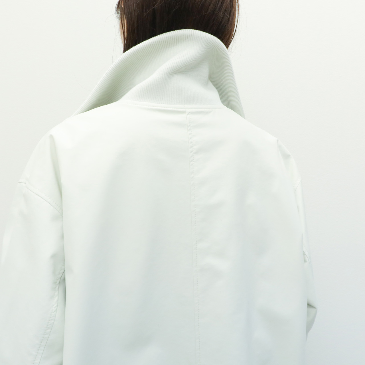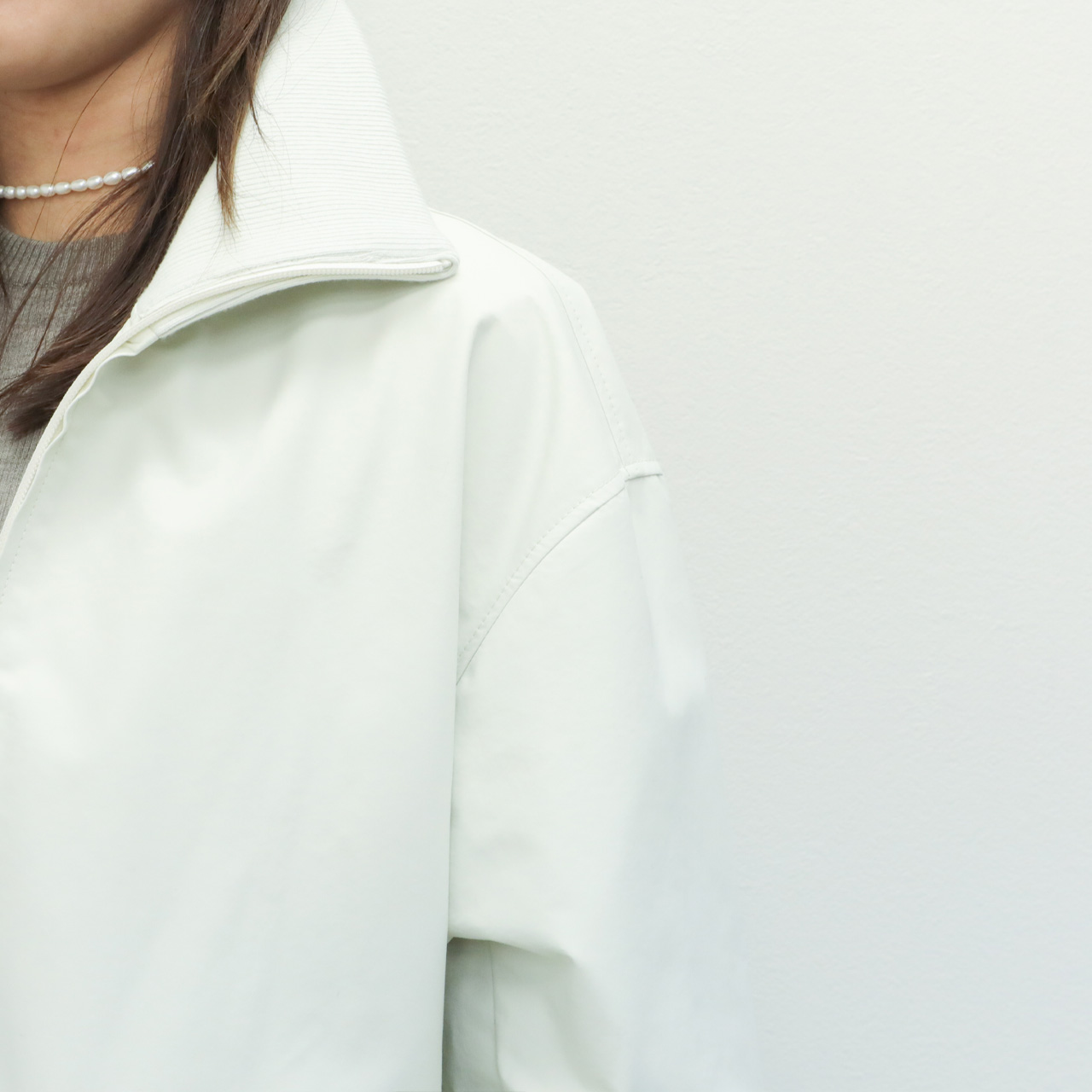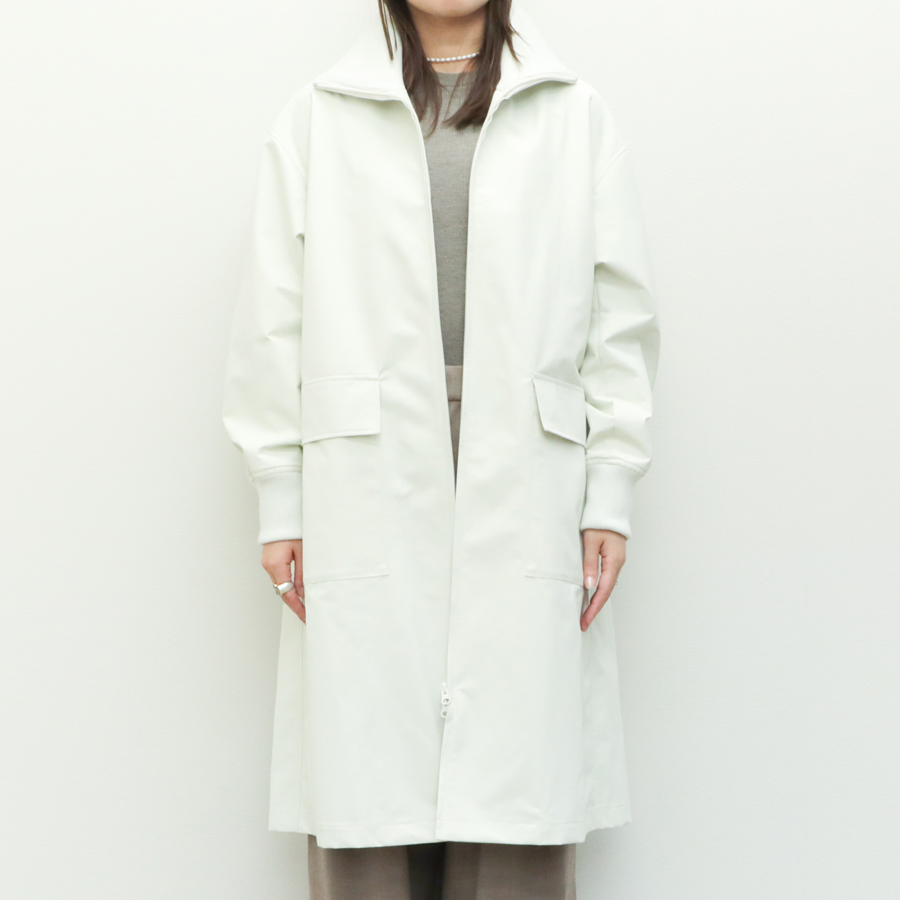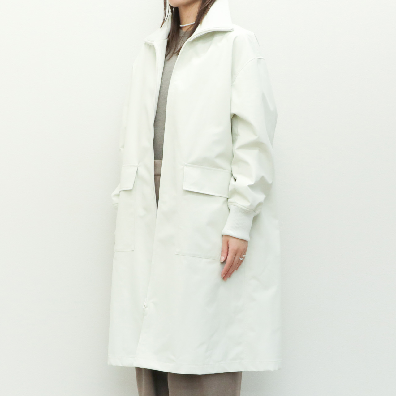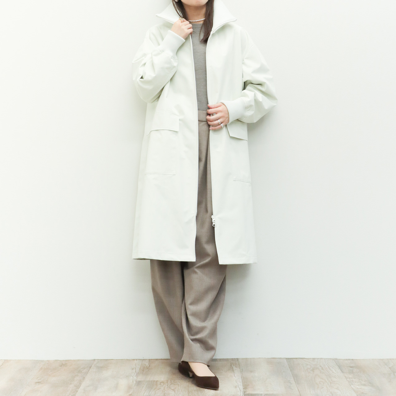 フロントはジップアップ仕様。エレメントが見えないように縫製され、全体のミニマルな雰囲気を損ないません。