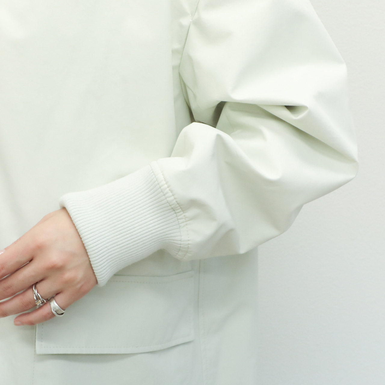 袖、衿はリブニットで切り替え、デザインとしてアクセントをプラスしてくれる上に、袖口からの冷気の侵入も防いでくれます。