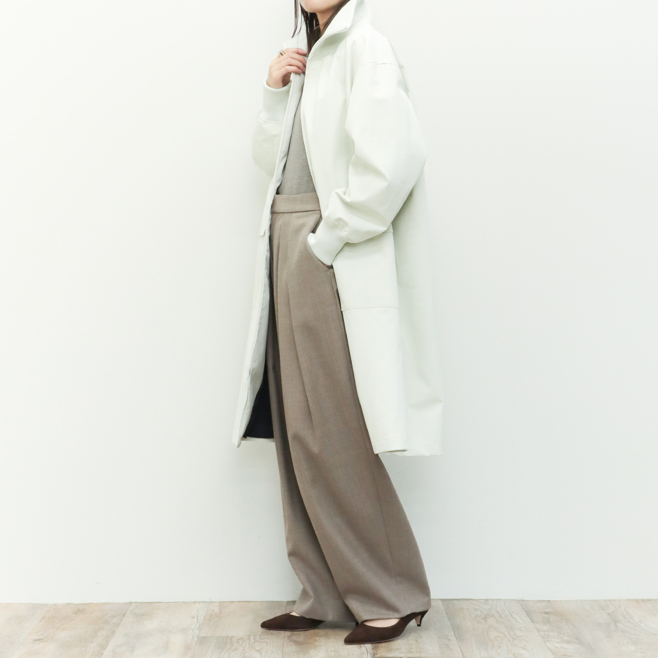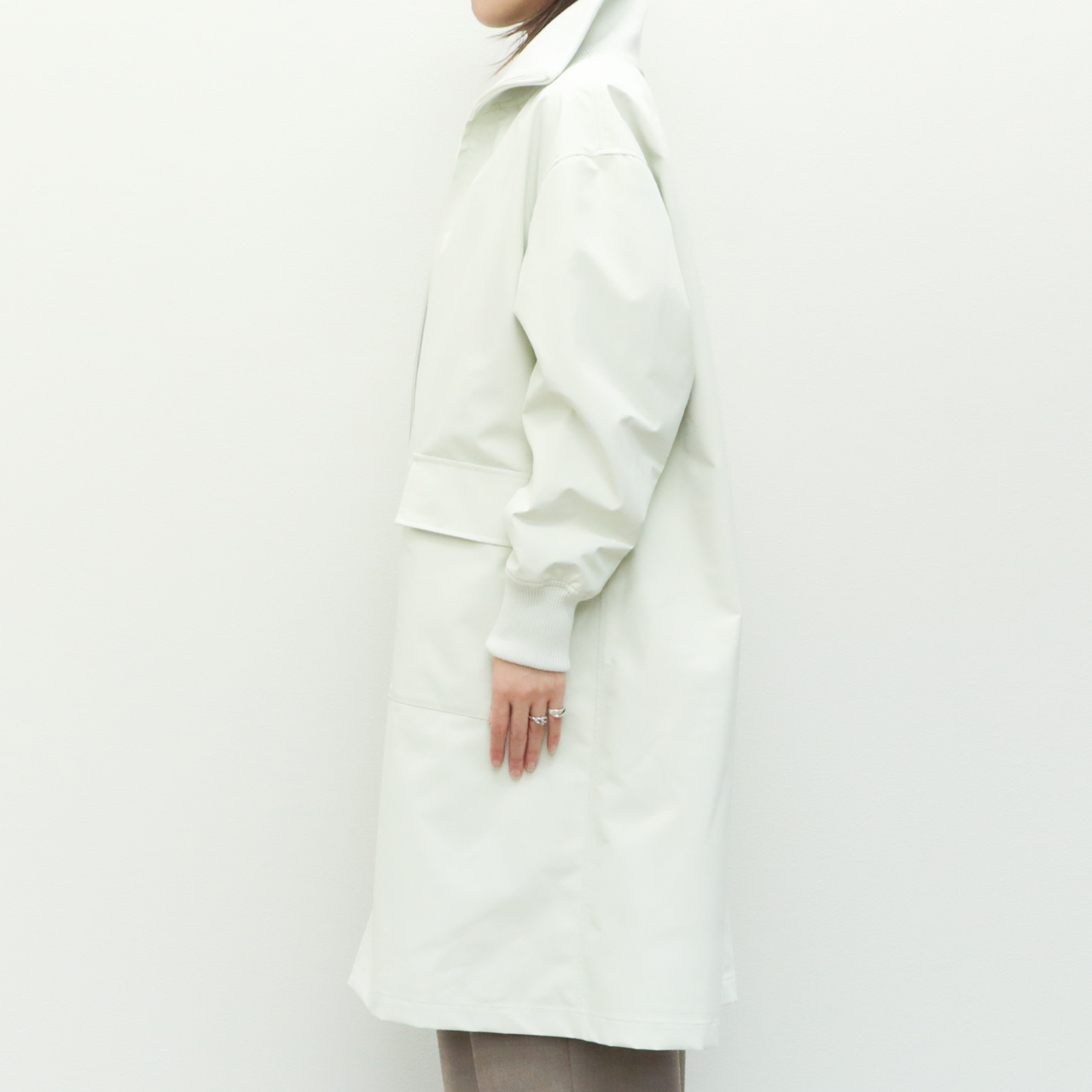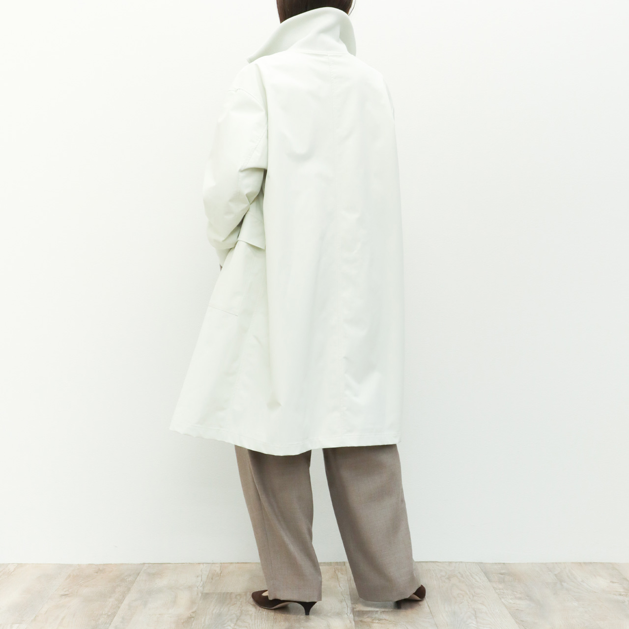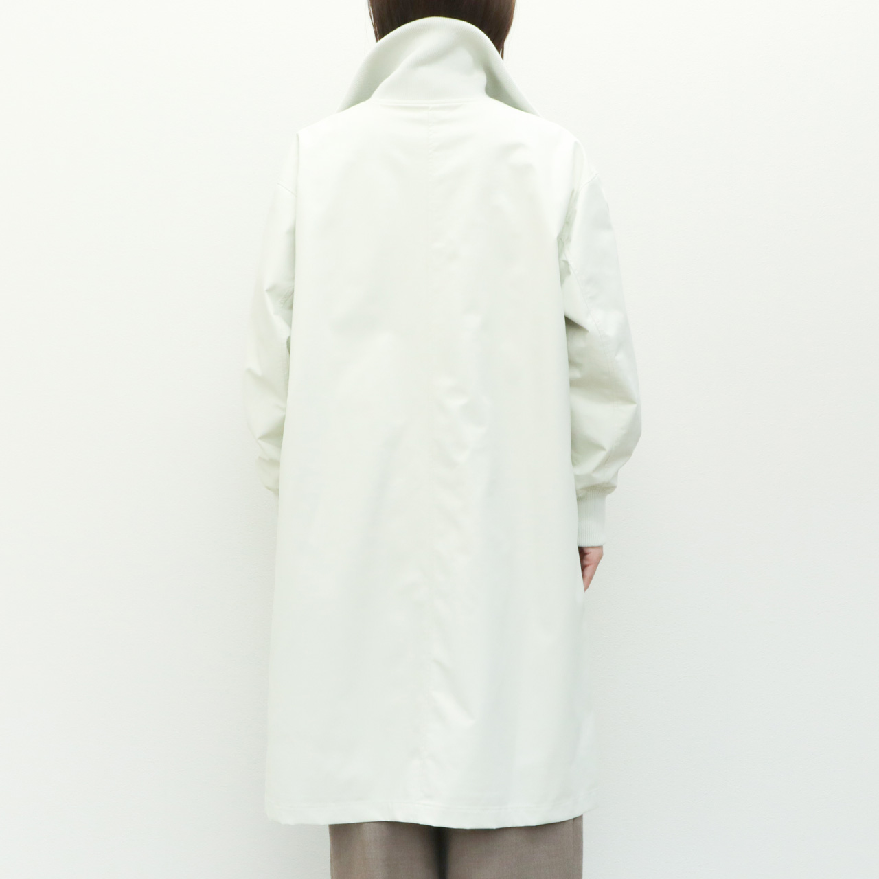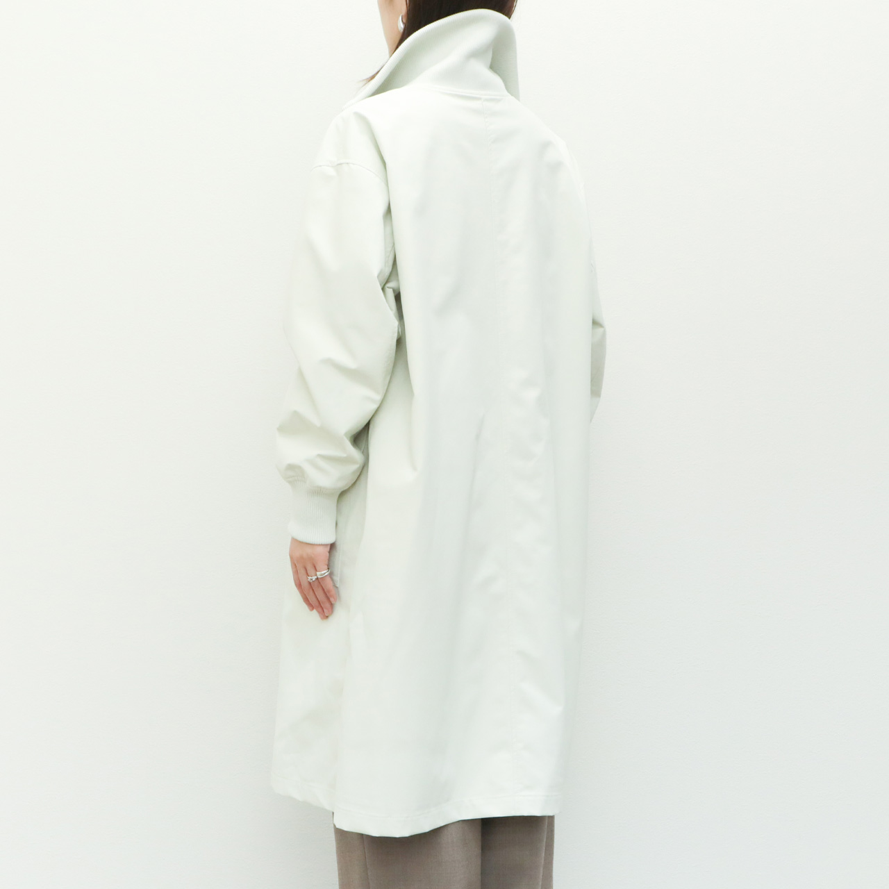 シルエットはdrawellの得意とするドロップショルダー、ややゆとりのあるパターンで落ち感があり、すとんと落ちるストレートなシルエット、アイボリーカラーにモードな雰囲気を感じさせます。