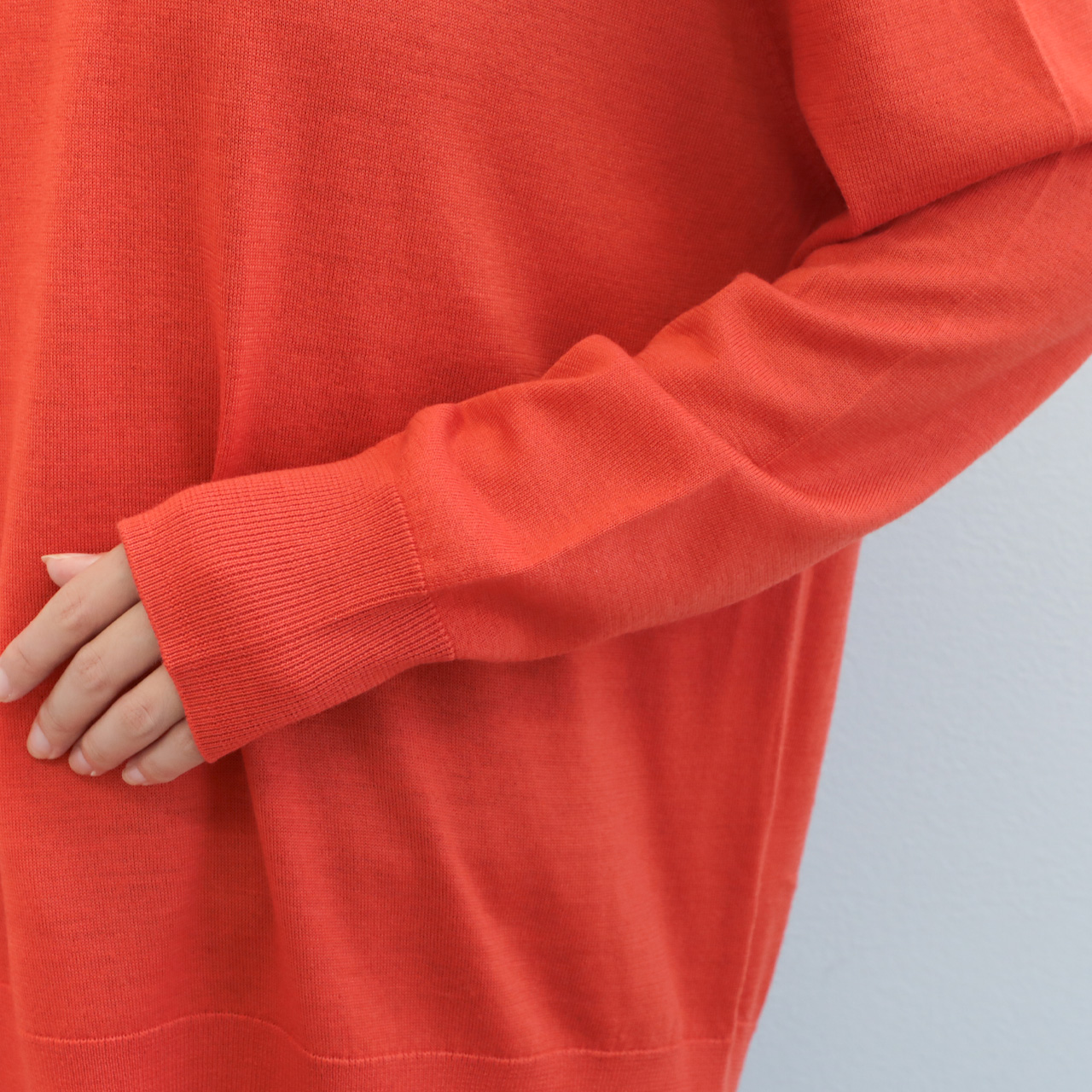素材はウール100%。ソフトで滑らか、そして程よい艶が感じられるウールを16ゲージで編み上げることで非常に品のある表情に仕上げています。