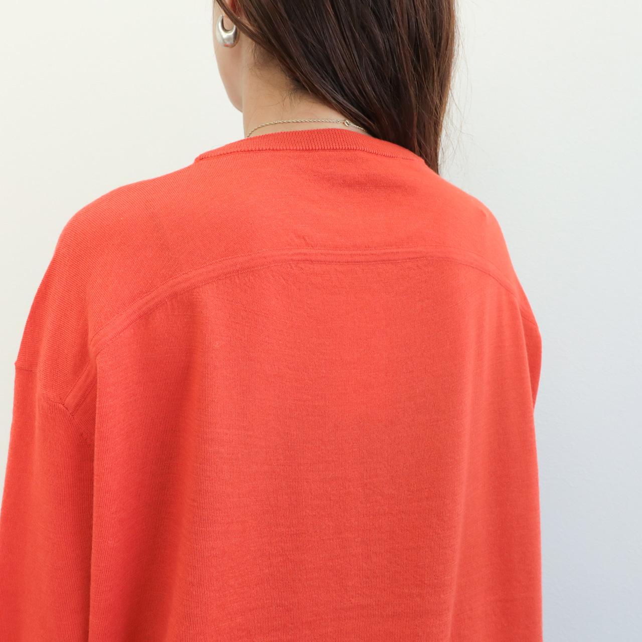 デザイナーの渡邊智香氏が送り出す魔法のような一着。長く愛されるバックフレアデザイン、その理由を是非このニットでご体感ください。