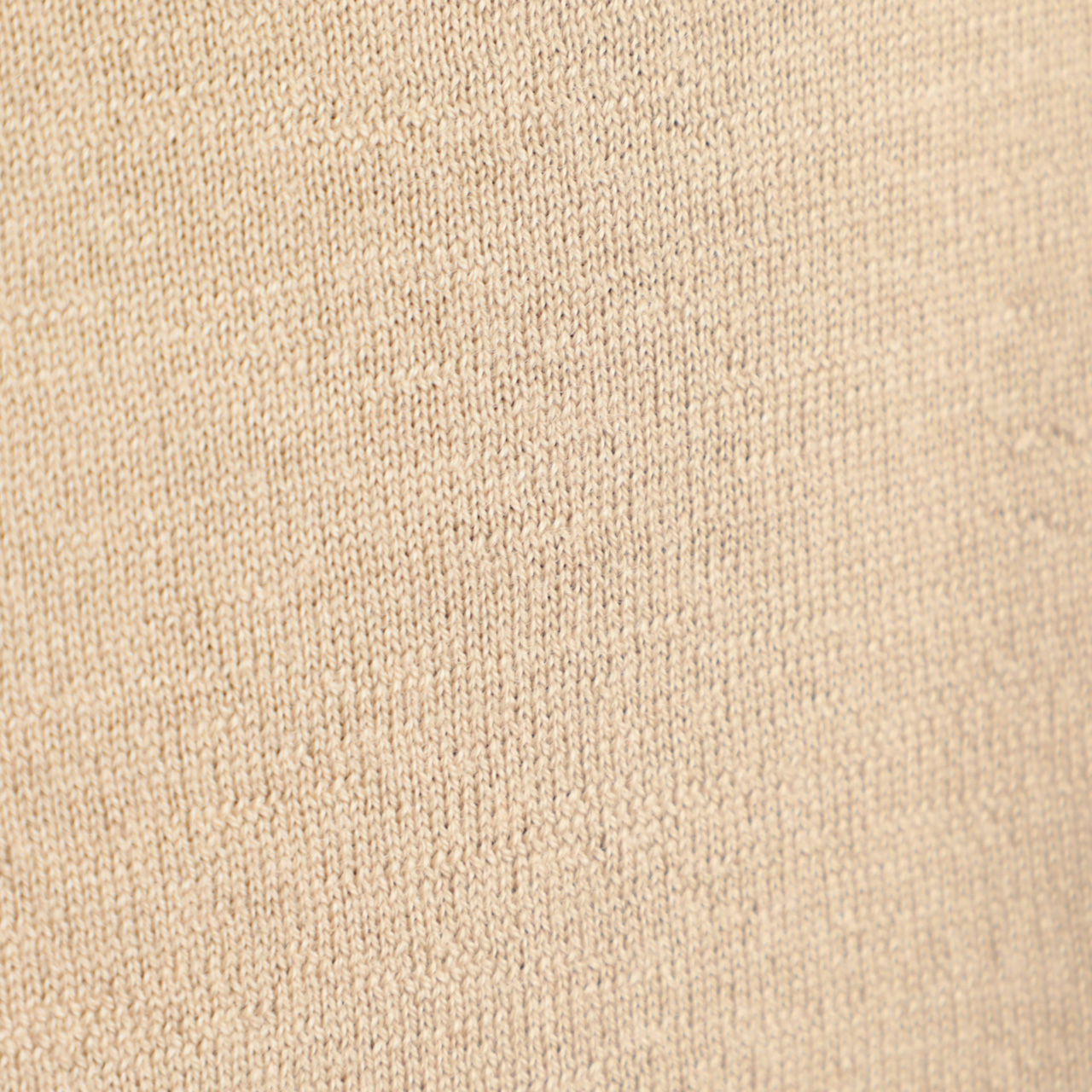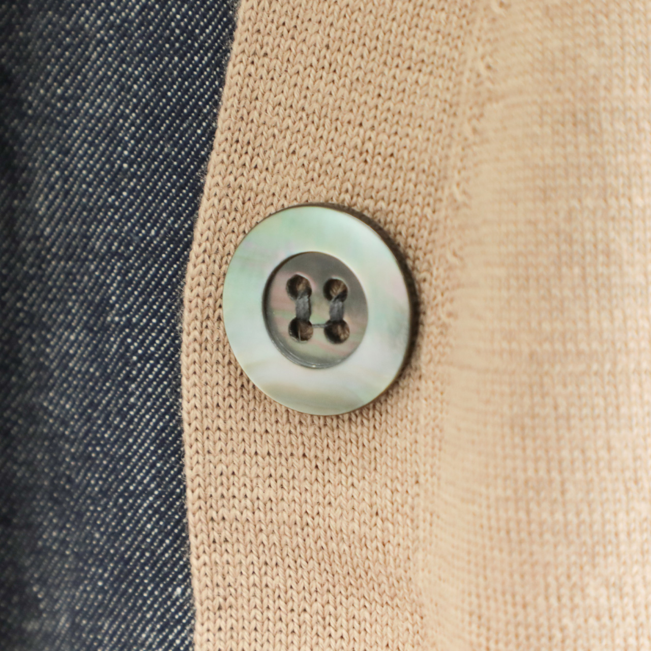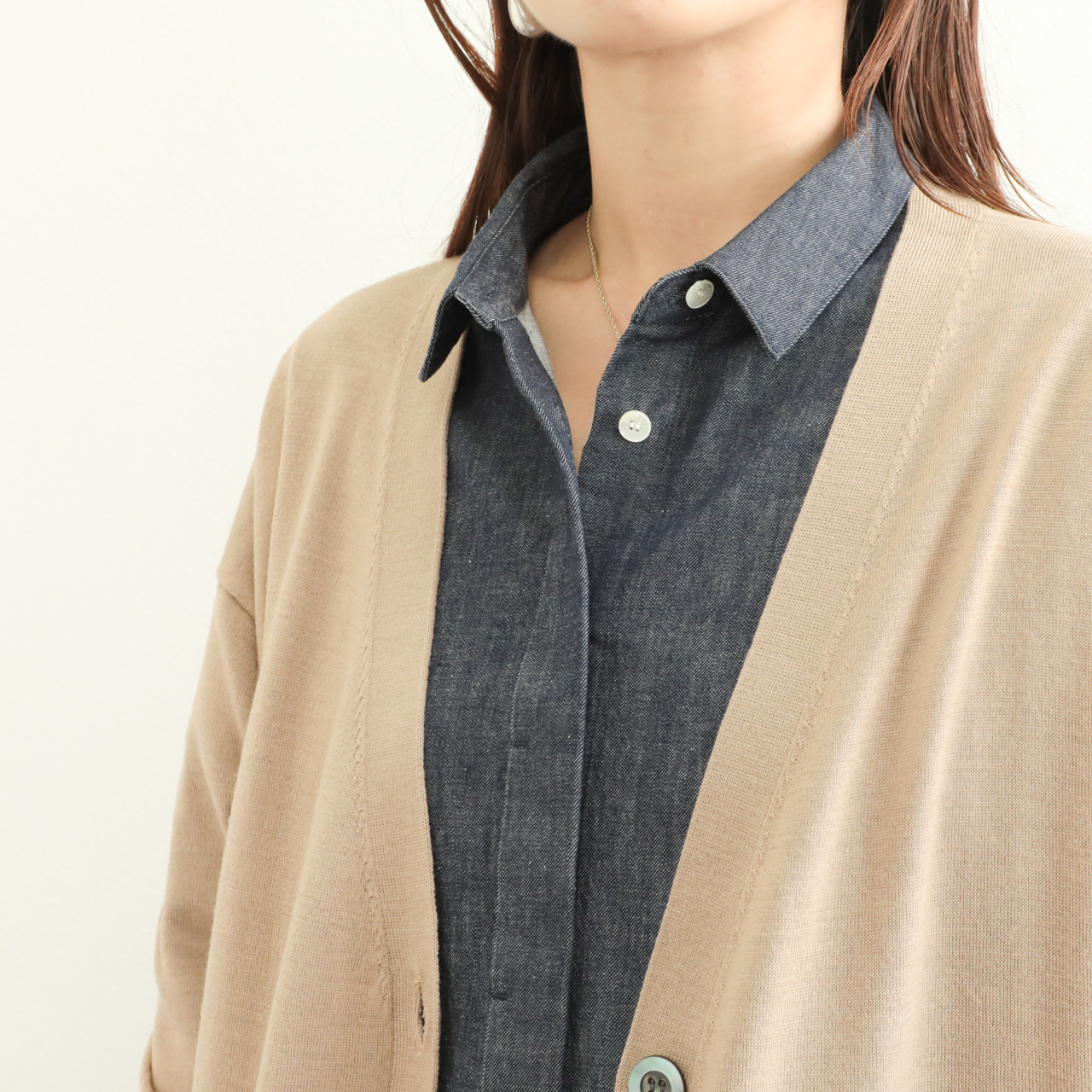 素材はウール100%。ソフトで滑らか、そして程よい艶が感じられるウールを16ゲージで編み上げることで非常に品のある表情に仕上げています。シェルボタンを合わせることでよりエレガントさをアップさせました。