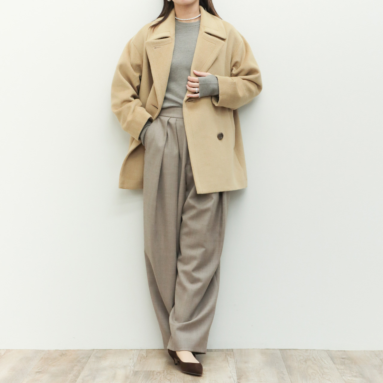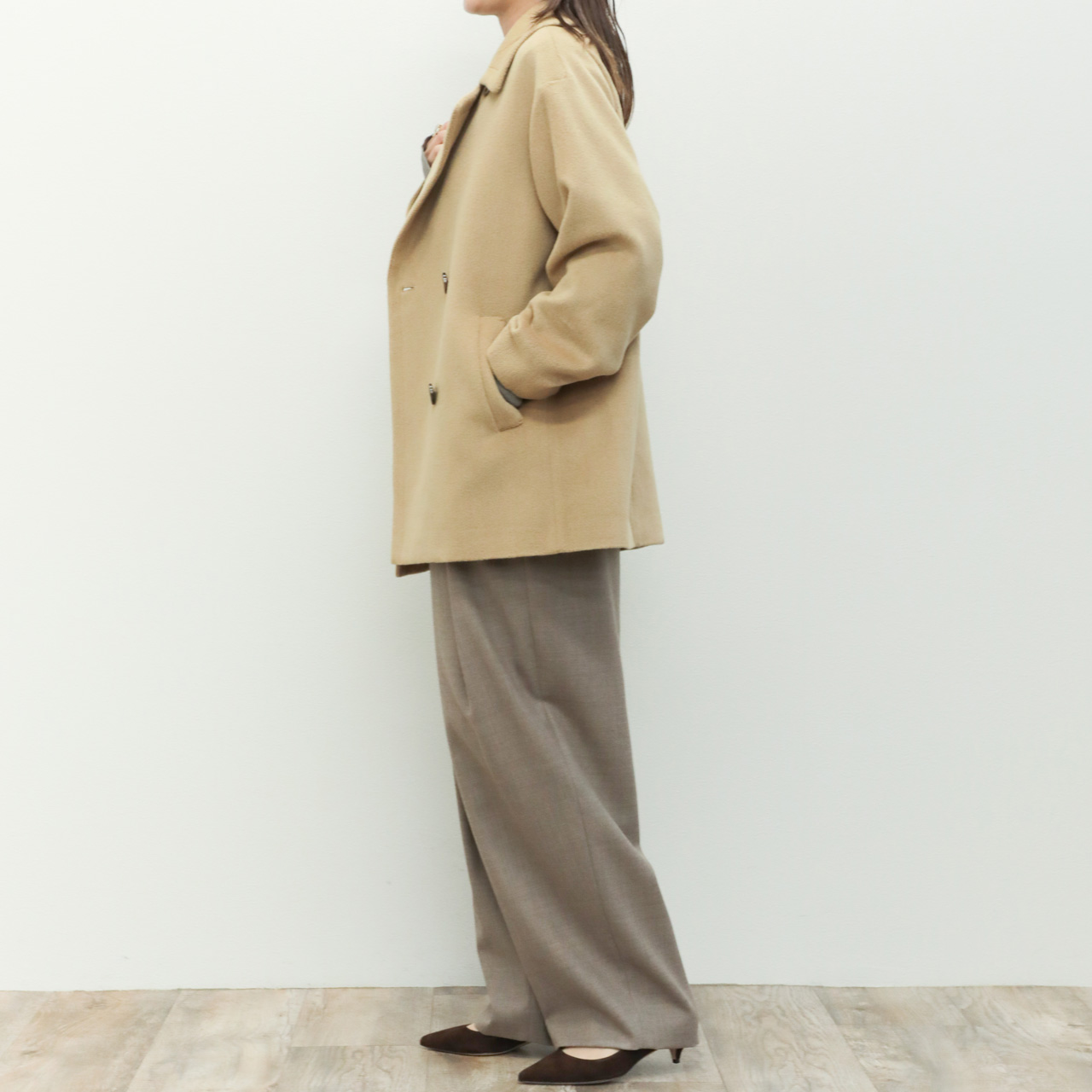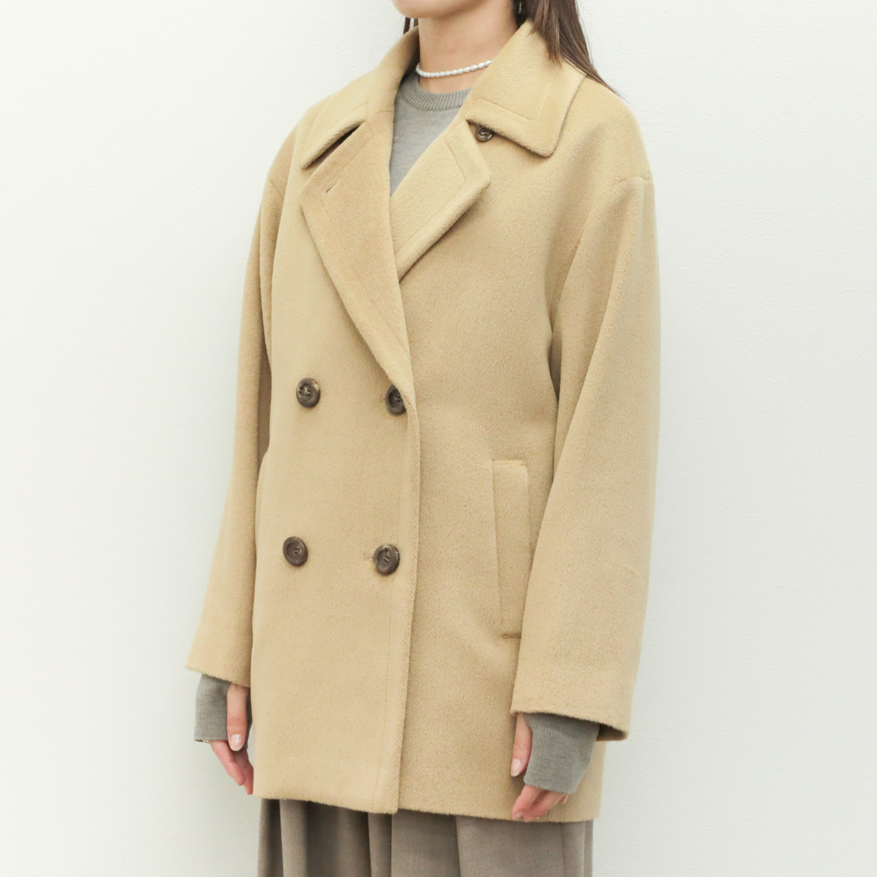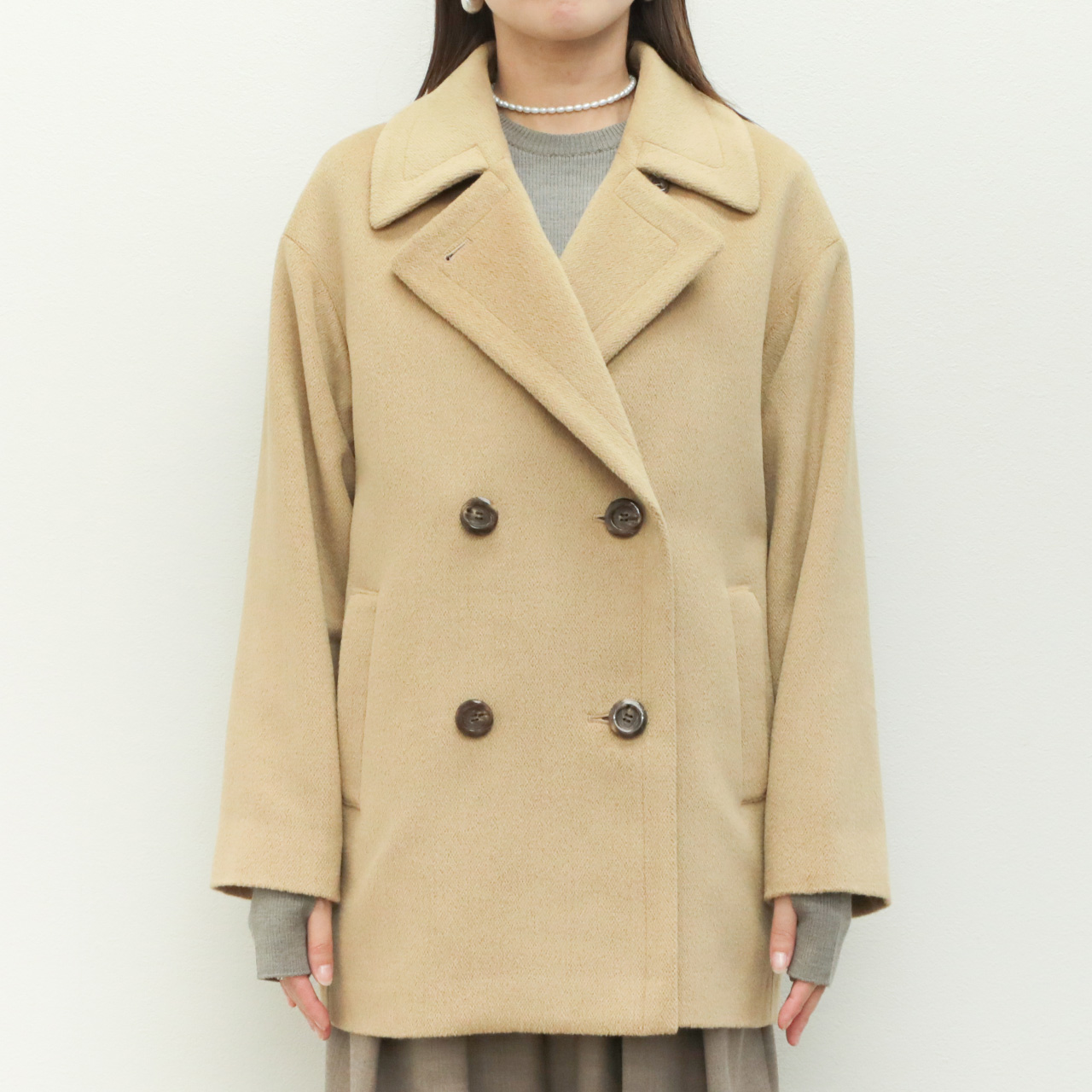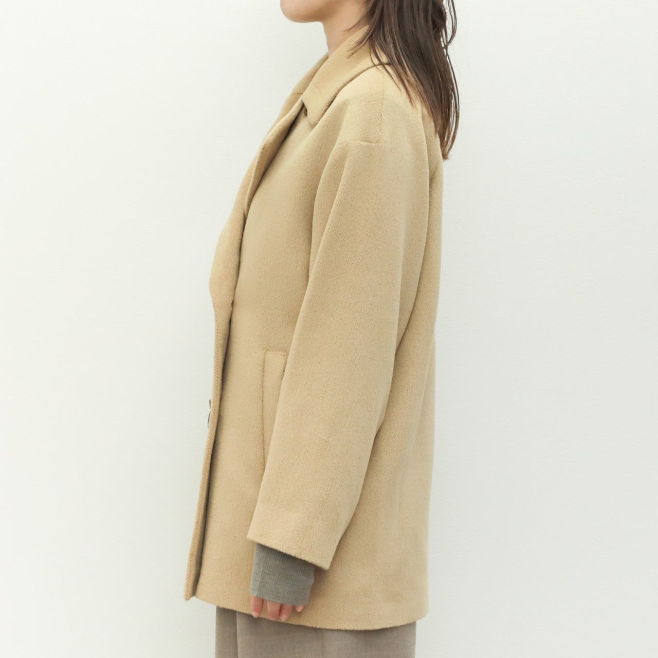 今季は昨年好評いただいたショート丈のPコートを別素材でもご用意しました。 ウールアンゴラ素材をベースに、ビーバー仕上げを施したオックスフォード地を採用したこちらのモデル。シャギータイプに比べて毛足が抑えられておりますので、より長いシーズンお楽しみいただける表情です。