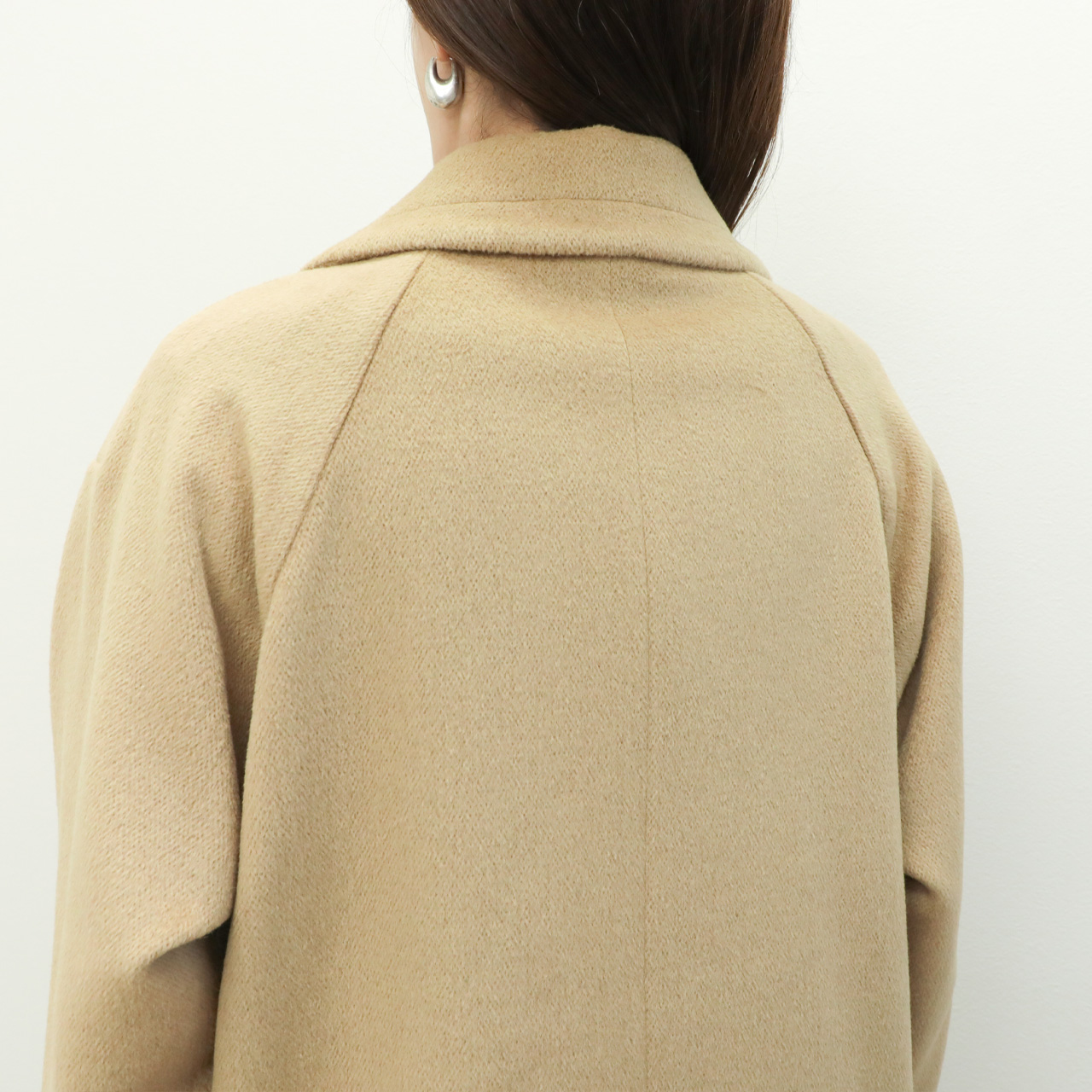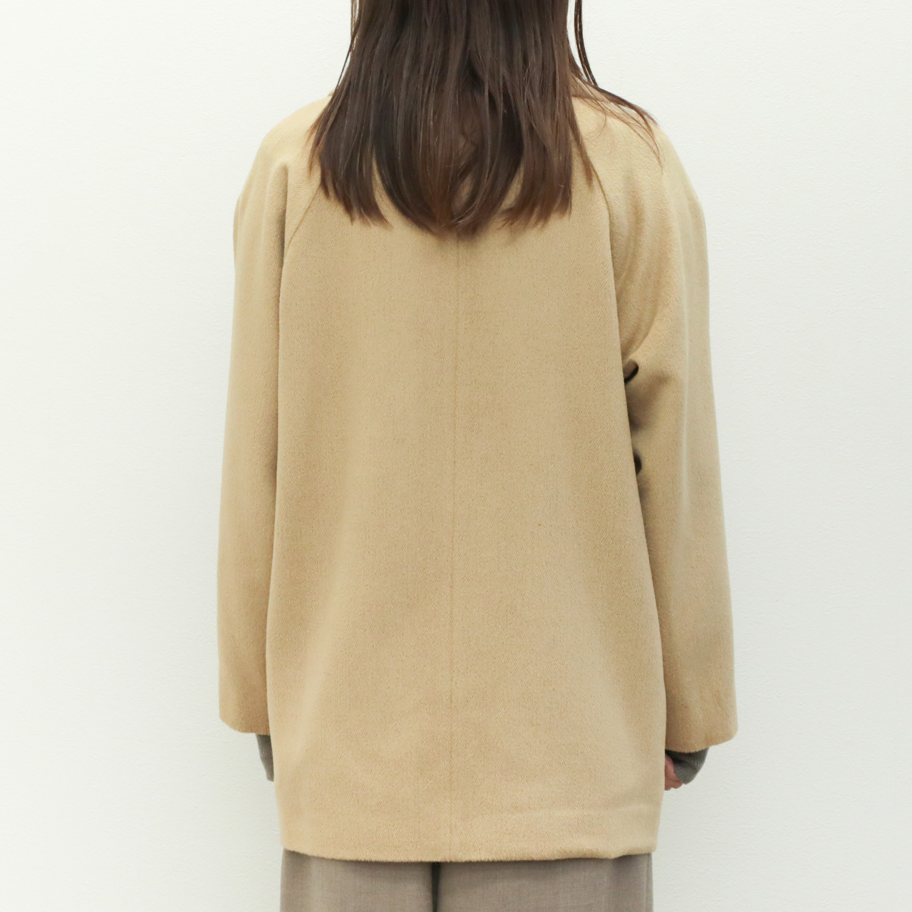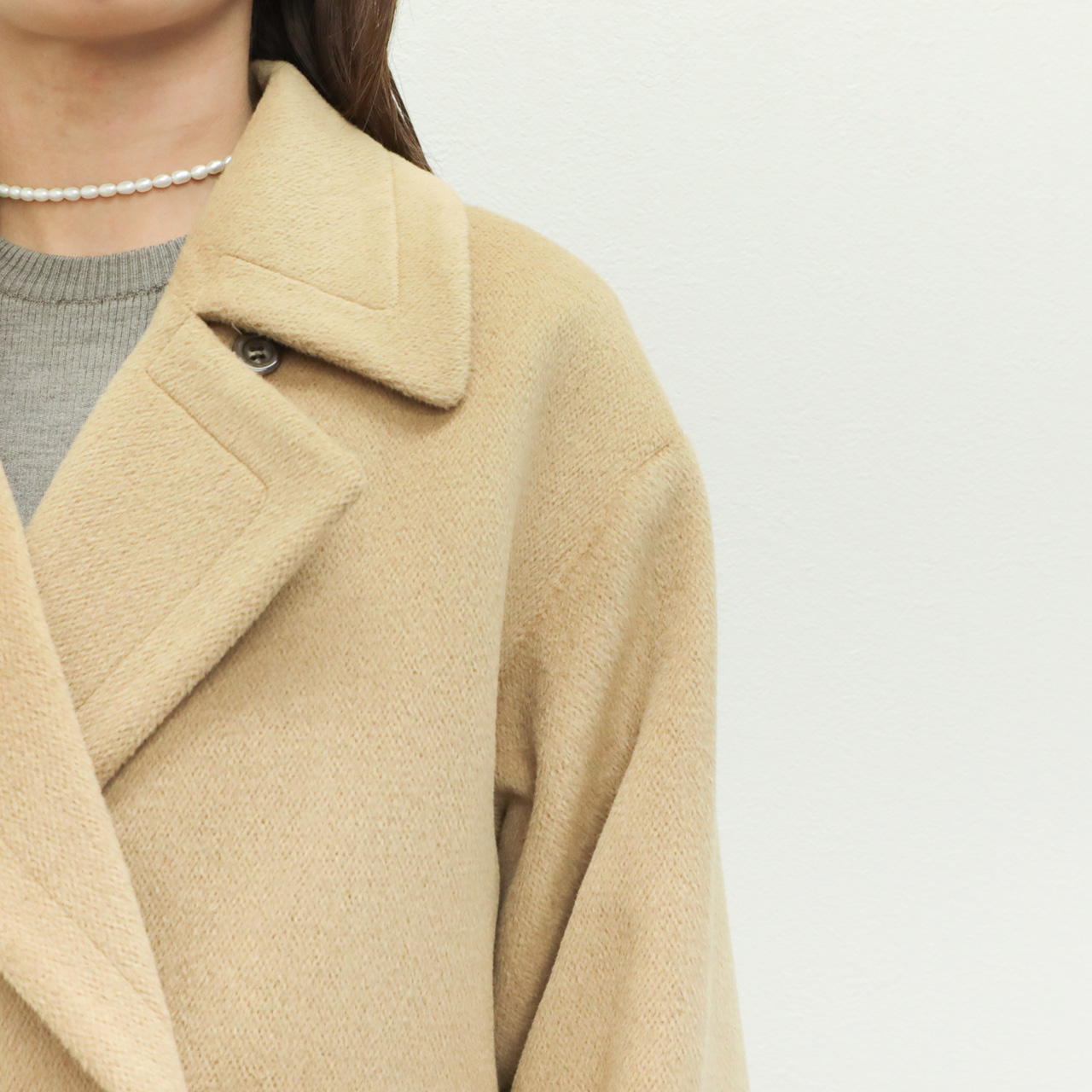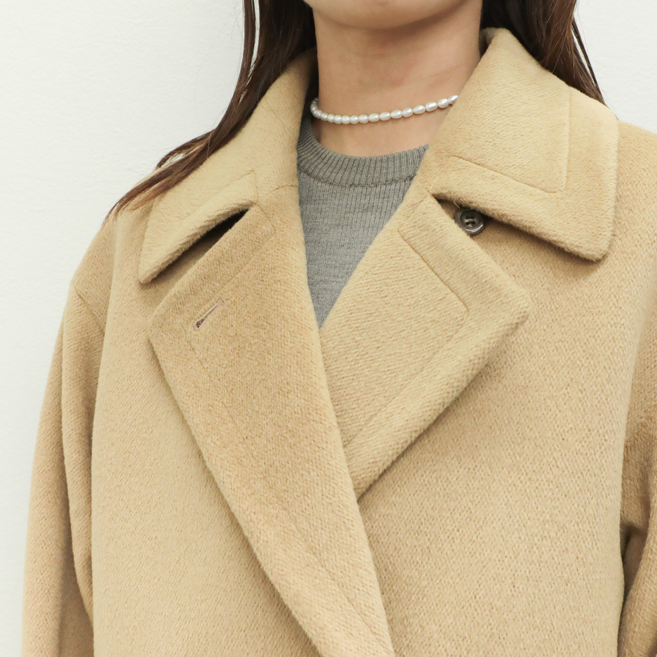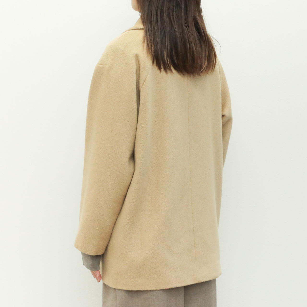 今季は昨年好評いただいたショート丈のPコートを別素材でもご用意しました。 ウールアンゴラ素材をベースに、ビーバー仕上げを施したオックスフォード地を採用したこちらのモデル。シャギータイプに比べて毛足が抑えられておりますので、より長いシーズンお楽しみいただける表情です。