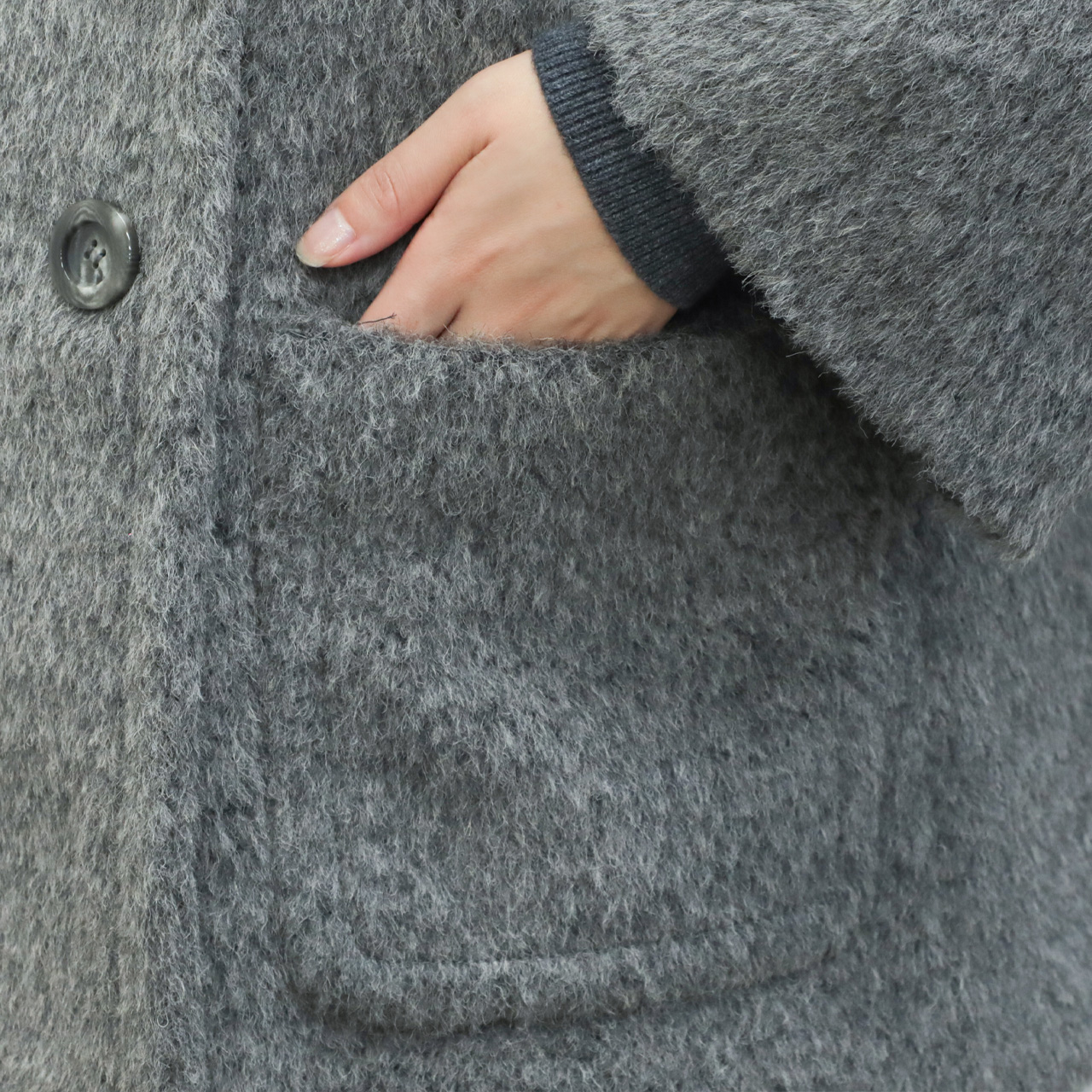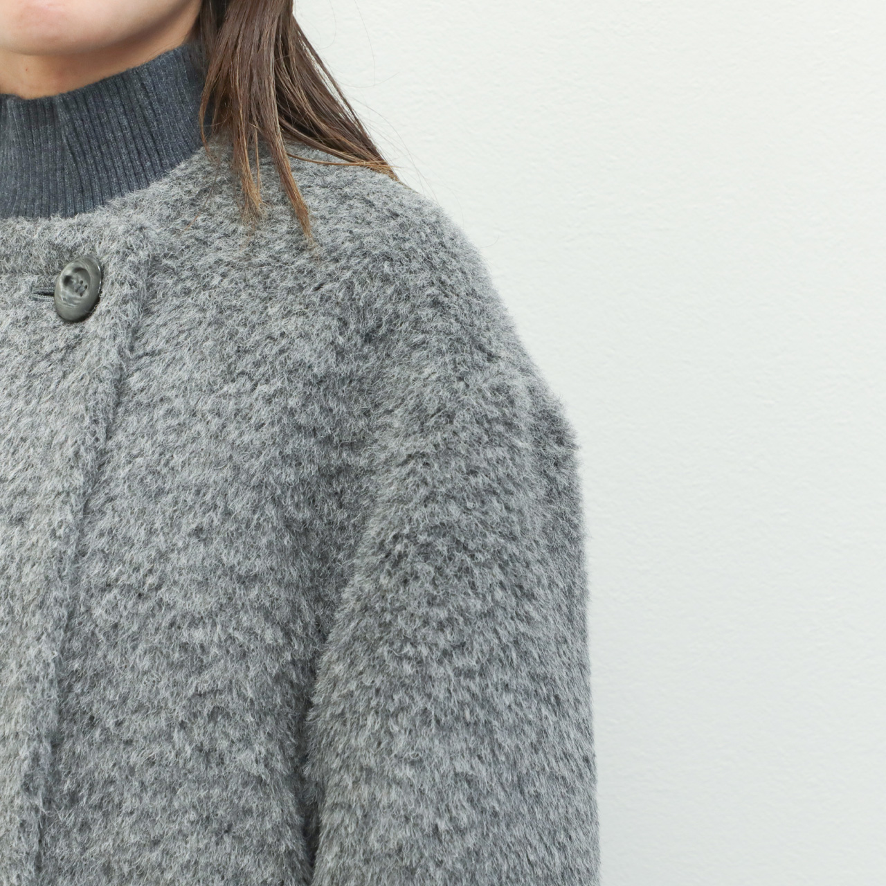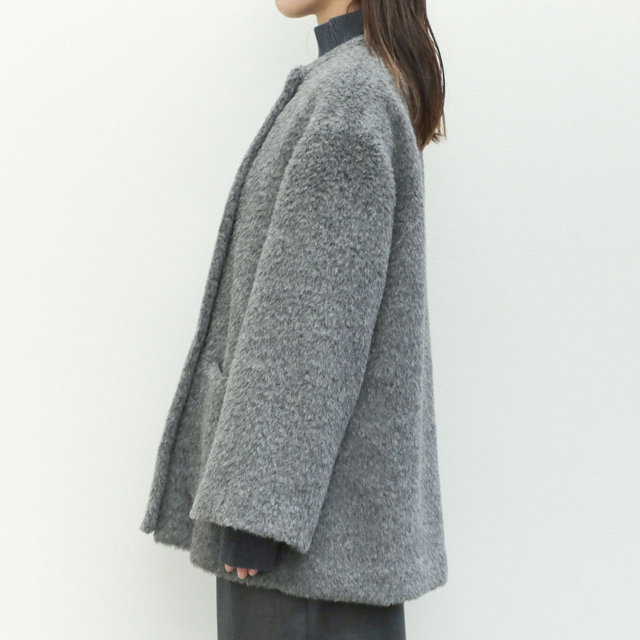 今季は昨年好評だったアルパカシャギー地を使用し新作をオーダー。フェミニンさが引き立つノーカラー+Aラインシルエットが目を惹きます。