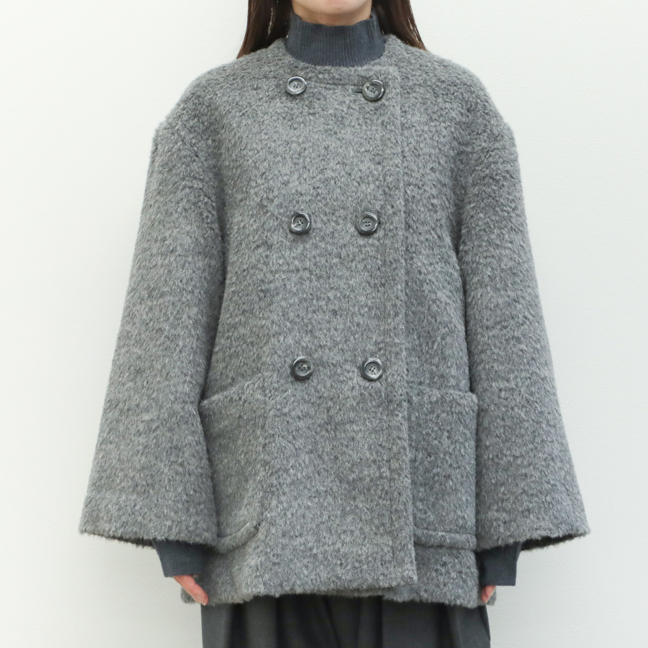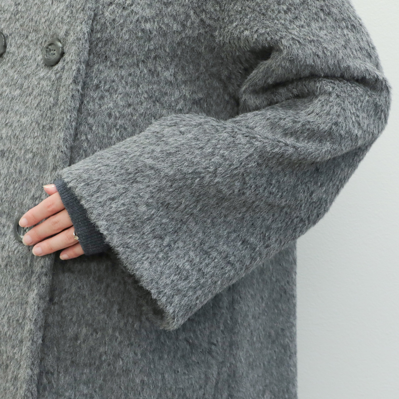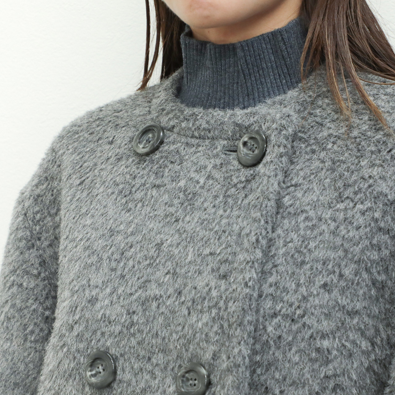 今季は昨年好評だったアルパカシャギー地を使用し新作をオーダー。フェミニンさが引き立つノーカラー+Aラインシルエットが目を惹きます。