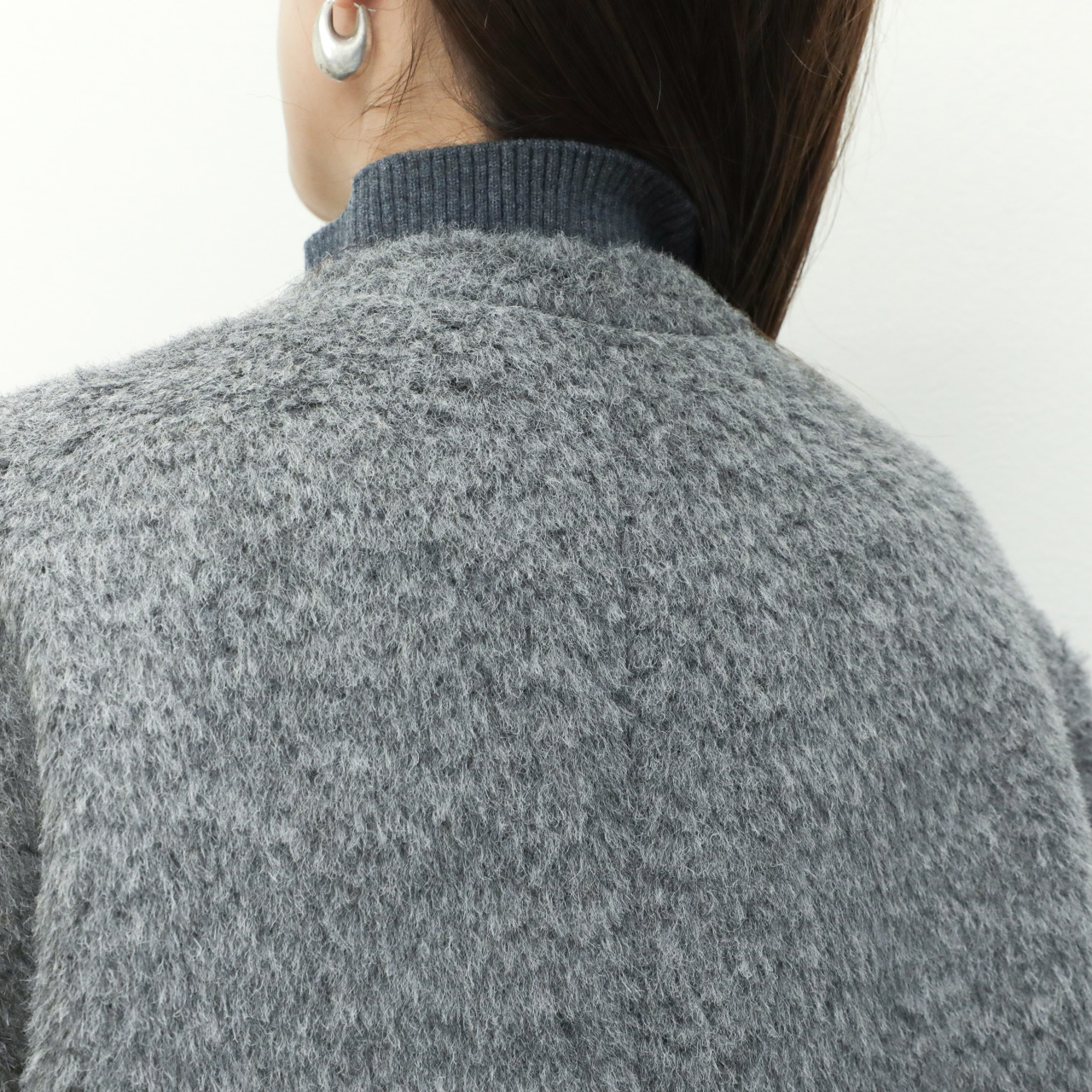 シルエットはdrawellが得意とするドロップショルダー+ビッグシルエット。丸みのあるショルダーラインがシャギーの雰囲気と相まって着る方を柔らかく魅せてくれます。