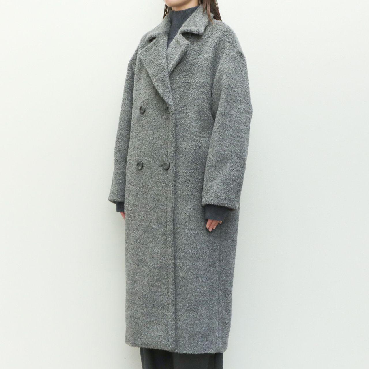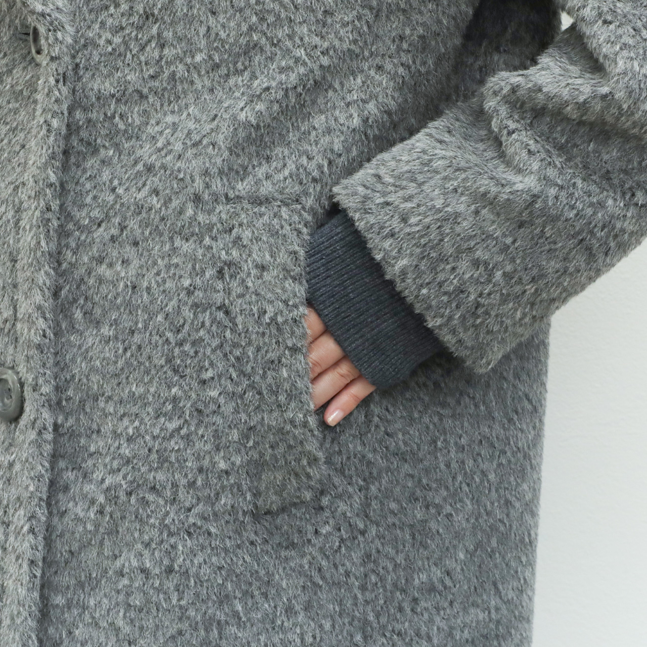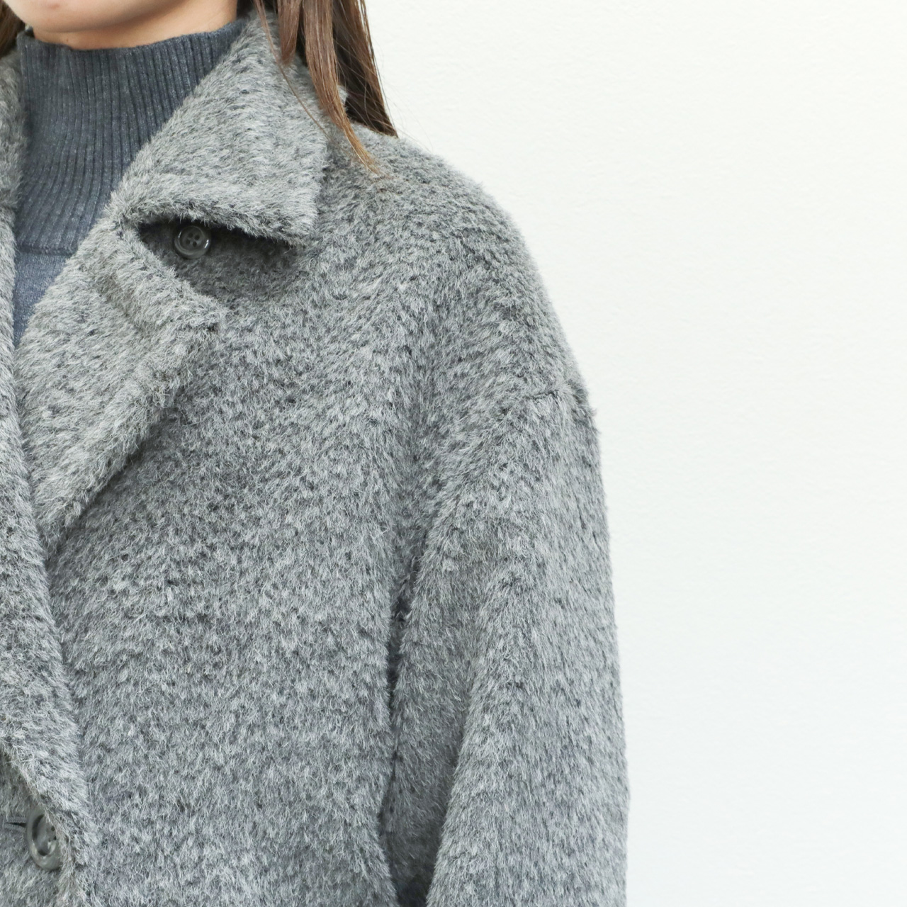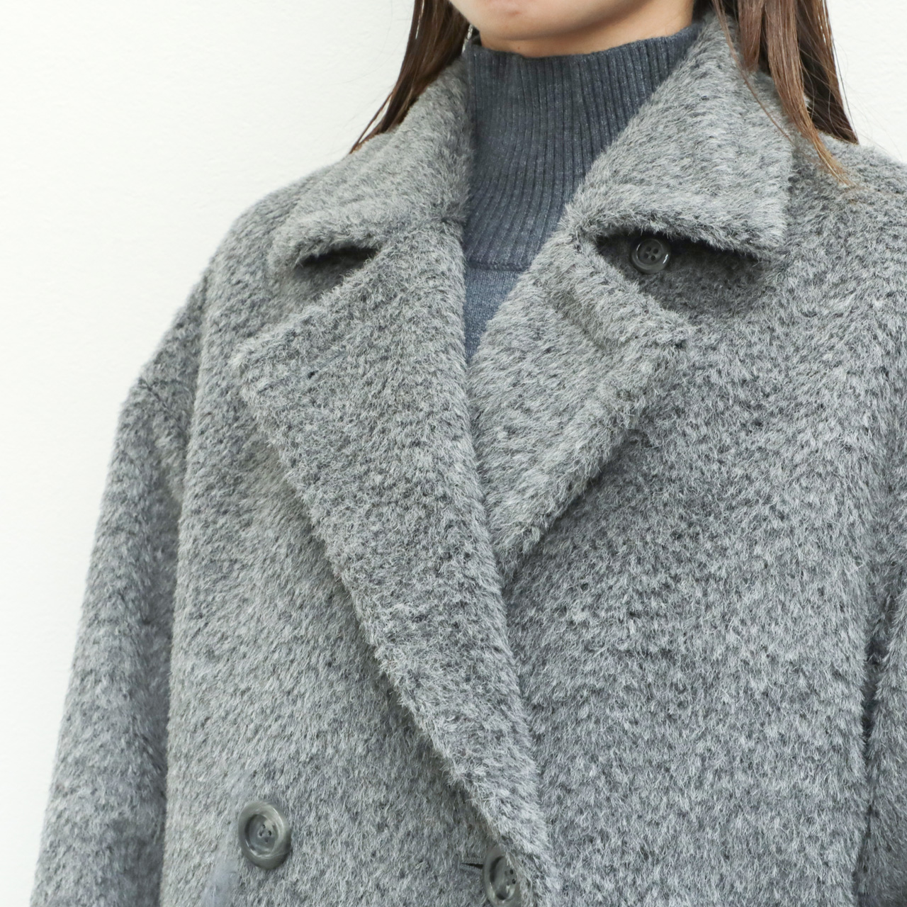 前立てはダブルブレストになっており重厚感が感じさせつつも、シャギー素材で女性ならではの柔らかさや優し気な雰囲気が演出されています。襟サイズも大きめに設定し、メンズのヴィンテージコートをレディースが羽織っているような雰囲気でスタイリングを組むのも面白そうです。