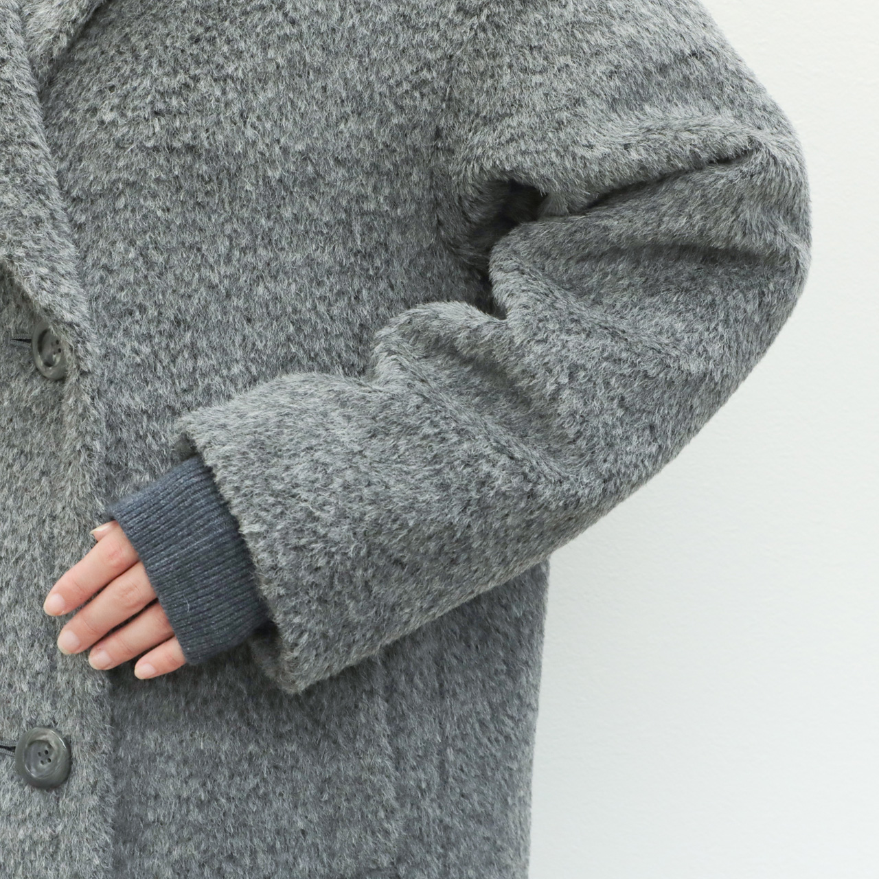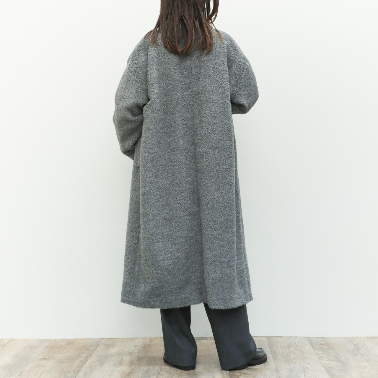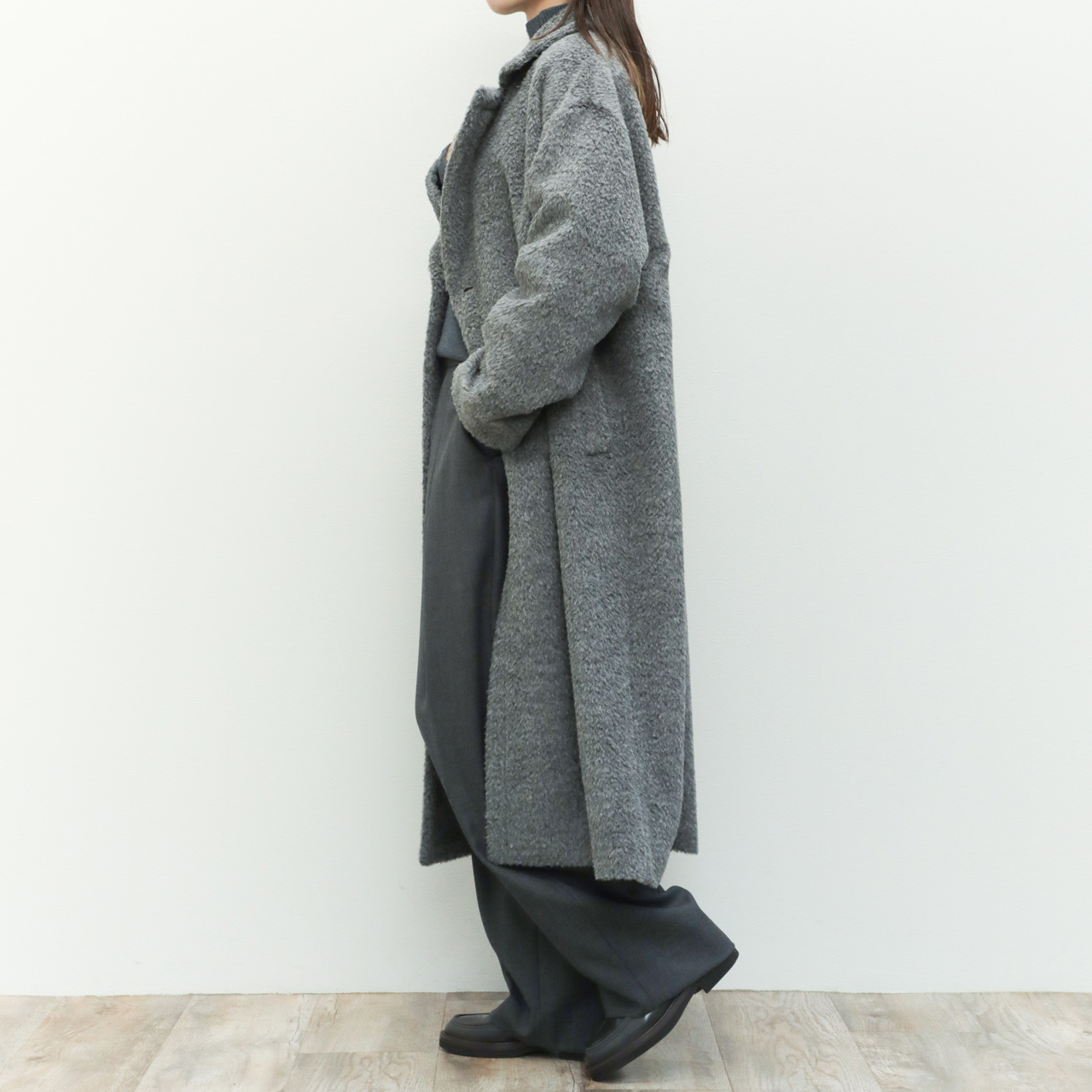 前立てはダブルブレストになっており重厚感が感じさせつつも、シャギー素材で女性ならではの柔らかさや優し気な雰囲気が演出されています。襟サイズも大きめに設定し、メンズのヴィンテージコートをレディースが羽織っているような雰囲気でスタイリングを組むのも面白そうです。