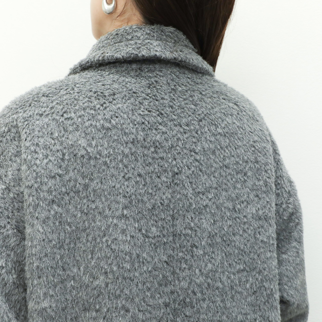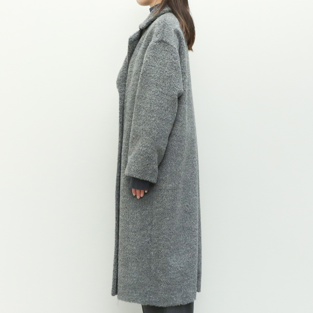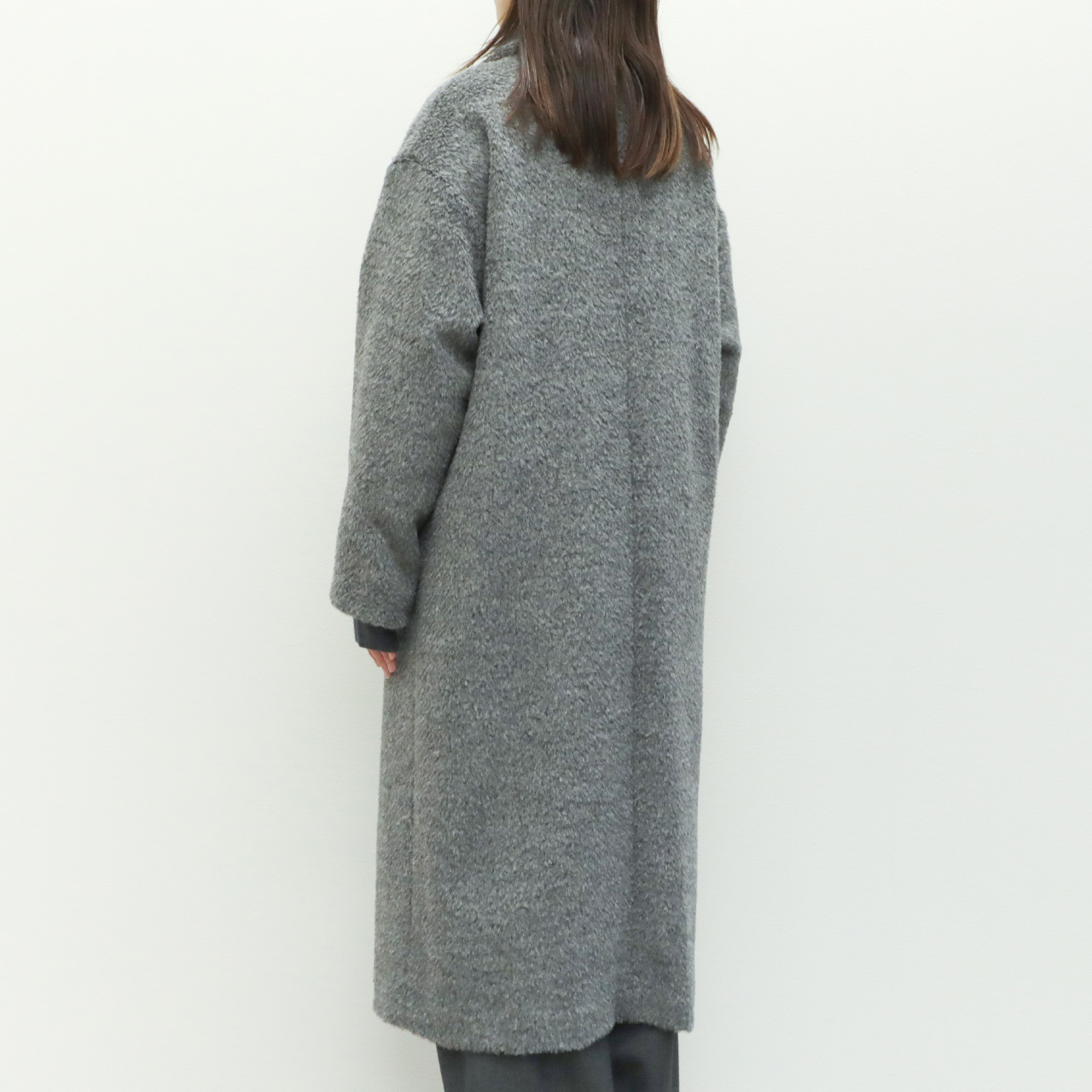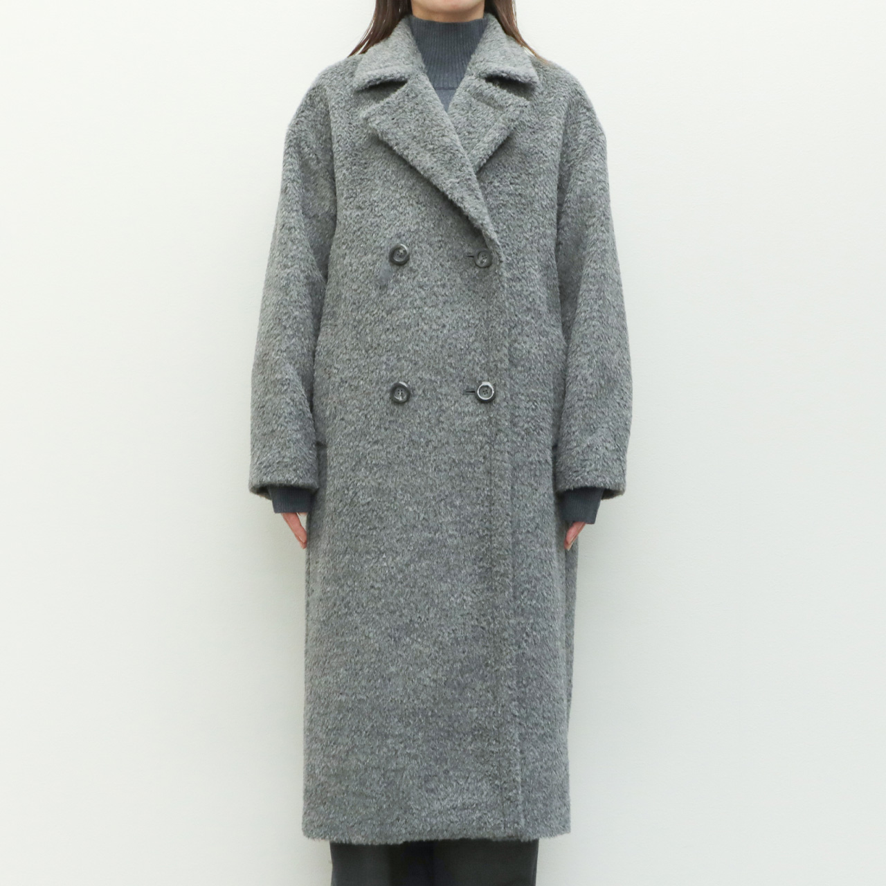 前立てはダブルブレストになっており重厚感が感じさせつつも、シャギー素材で女性ならではの柔らかさや優し気な雰囲気が演出されています。襟サイズも大きめに設定し、メンズのヴィンテージコートをレディースが羽織っているような雰囲気でスタイリングを組むのも面白そうです。