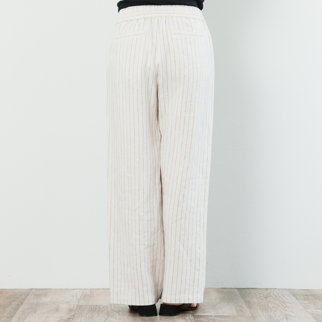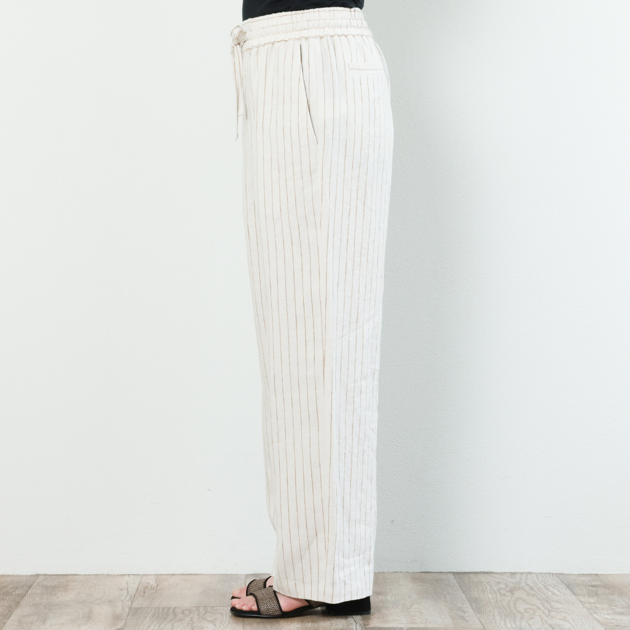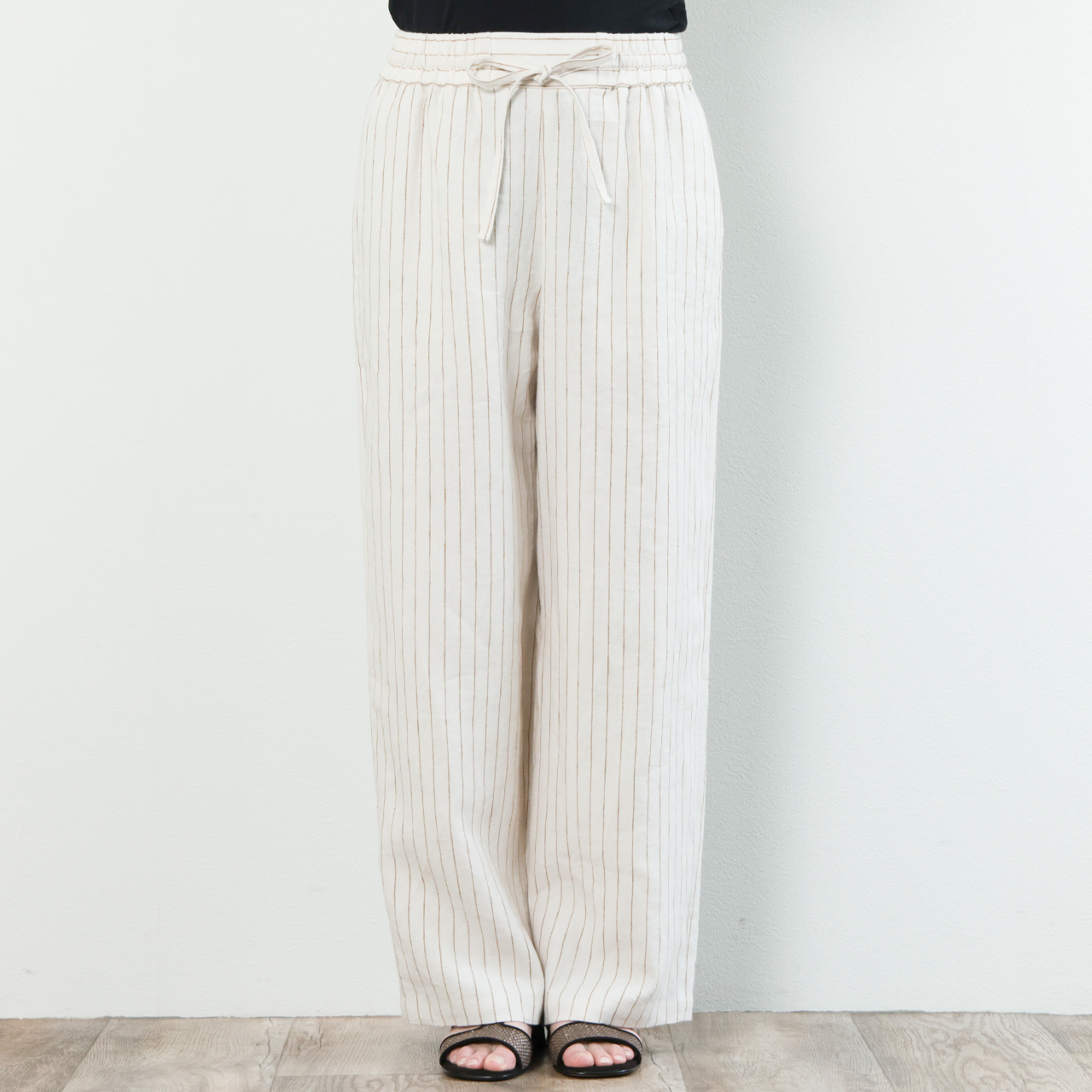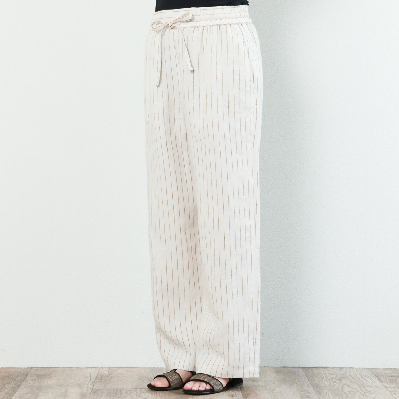 drawell ドロウェル パンツ ワイド ドローストリング ウエストゴム リネン ストライプ ヘリンボーン 5-1-DW-2 ストライプアイボリー