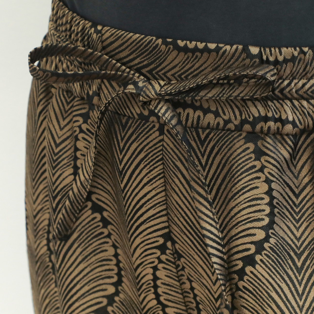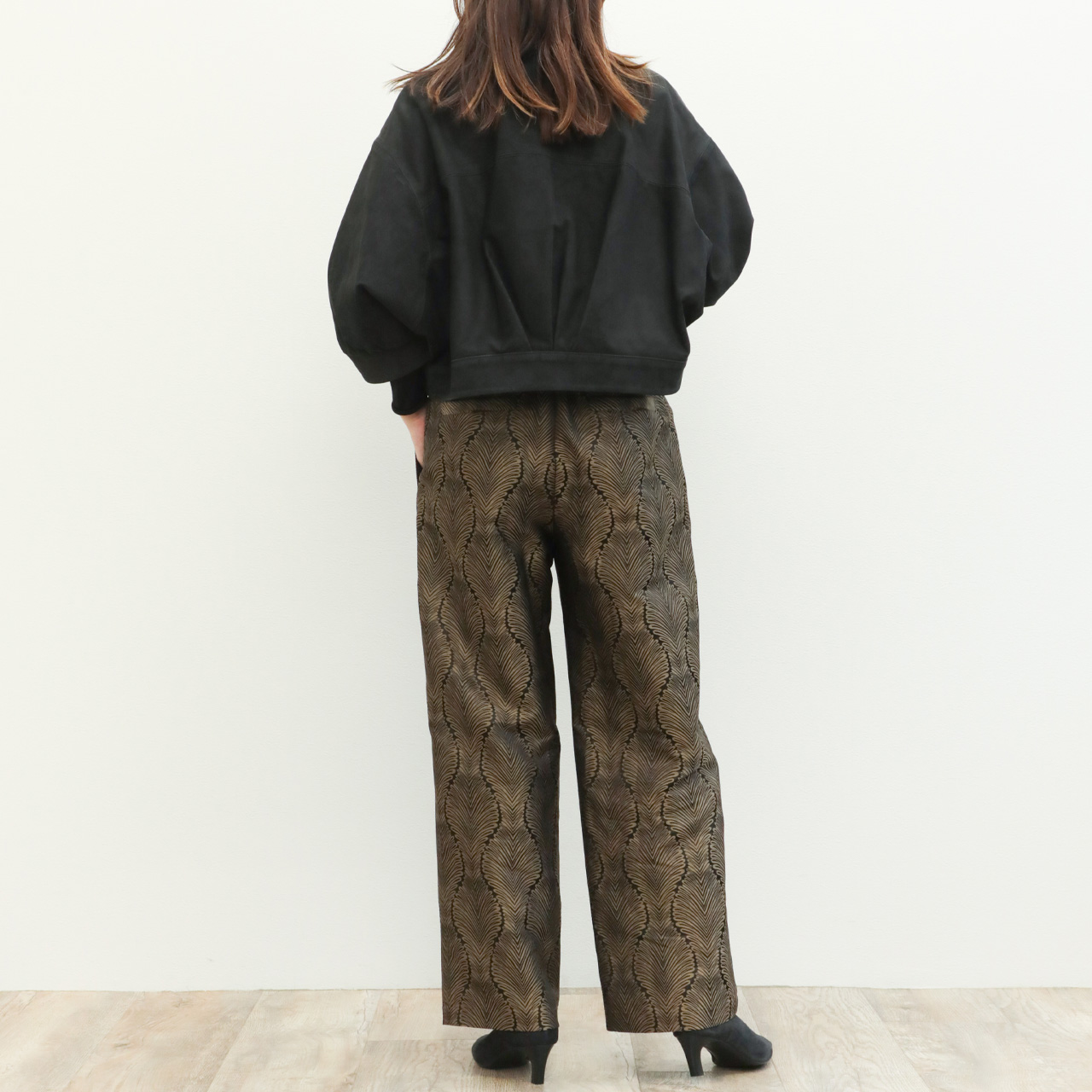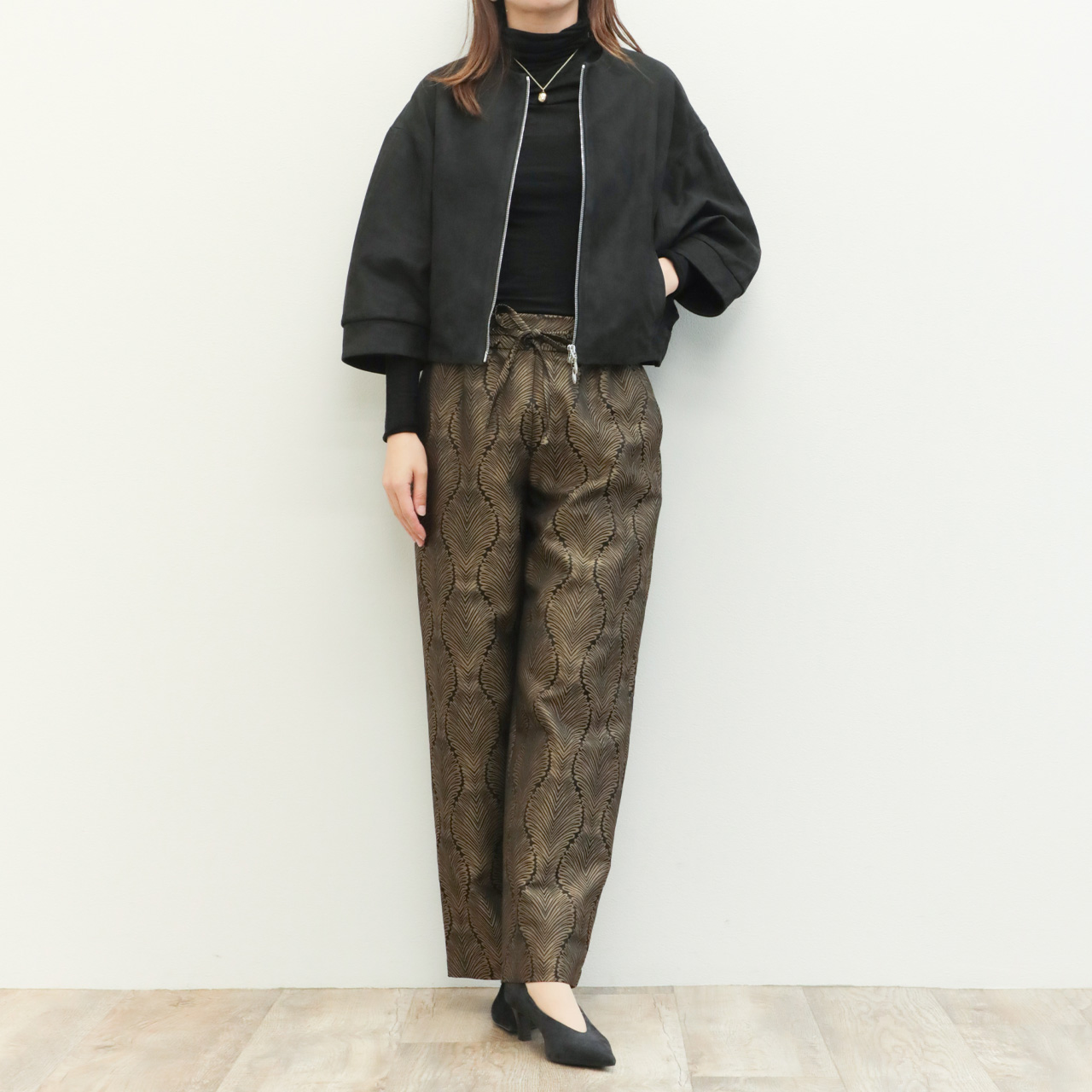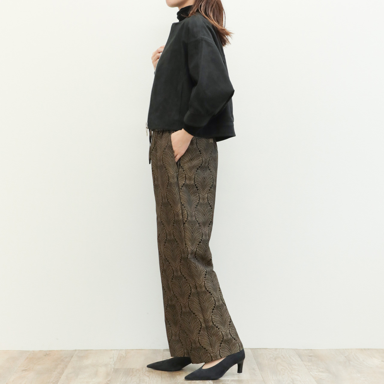 ボディはポリエステル×レーヨンの混紡地。両者の持つ艶や織りによる立体感があるユニークな生地。ハリはありつつも柔らかさも感じられる生地に仕上がっており、ウエストゴムの仕様もあってコンフォートな穿き心地を実感していただけるはずです。