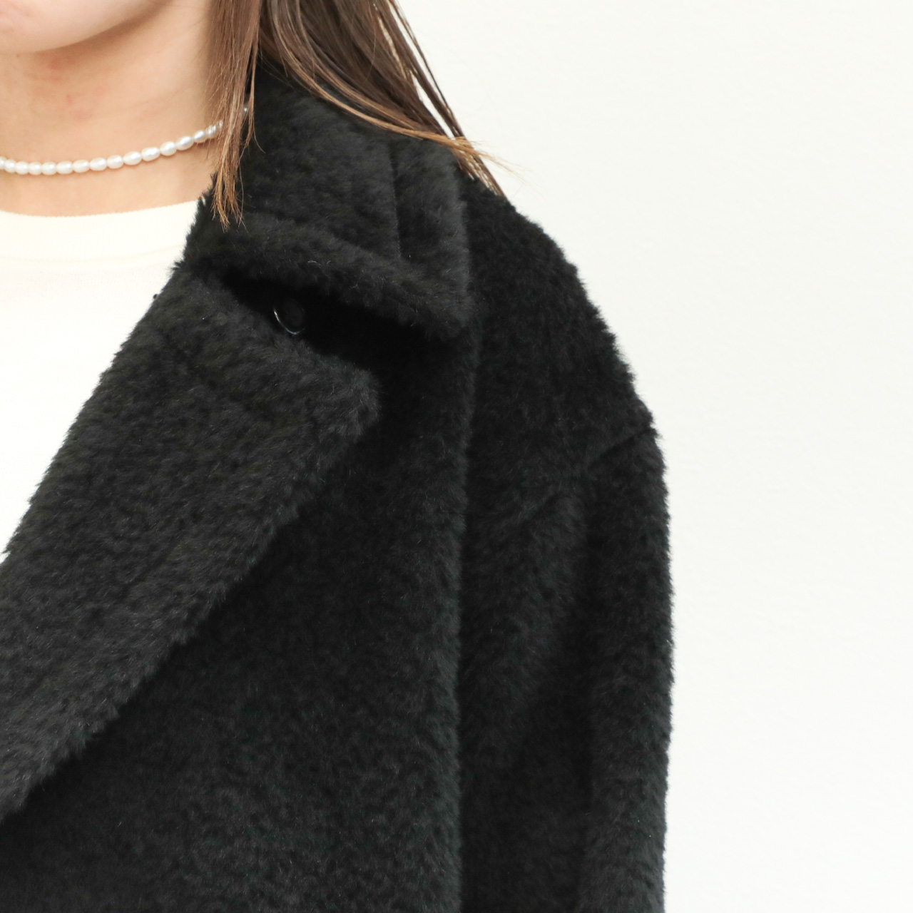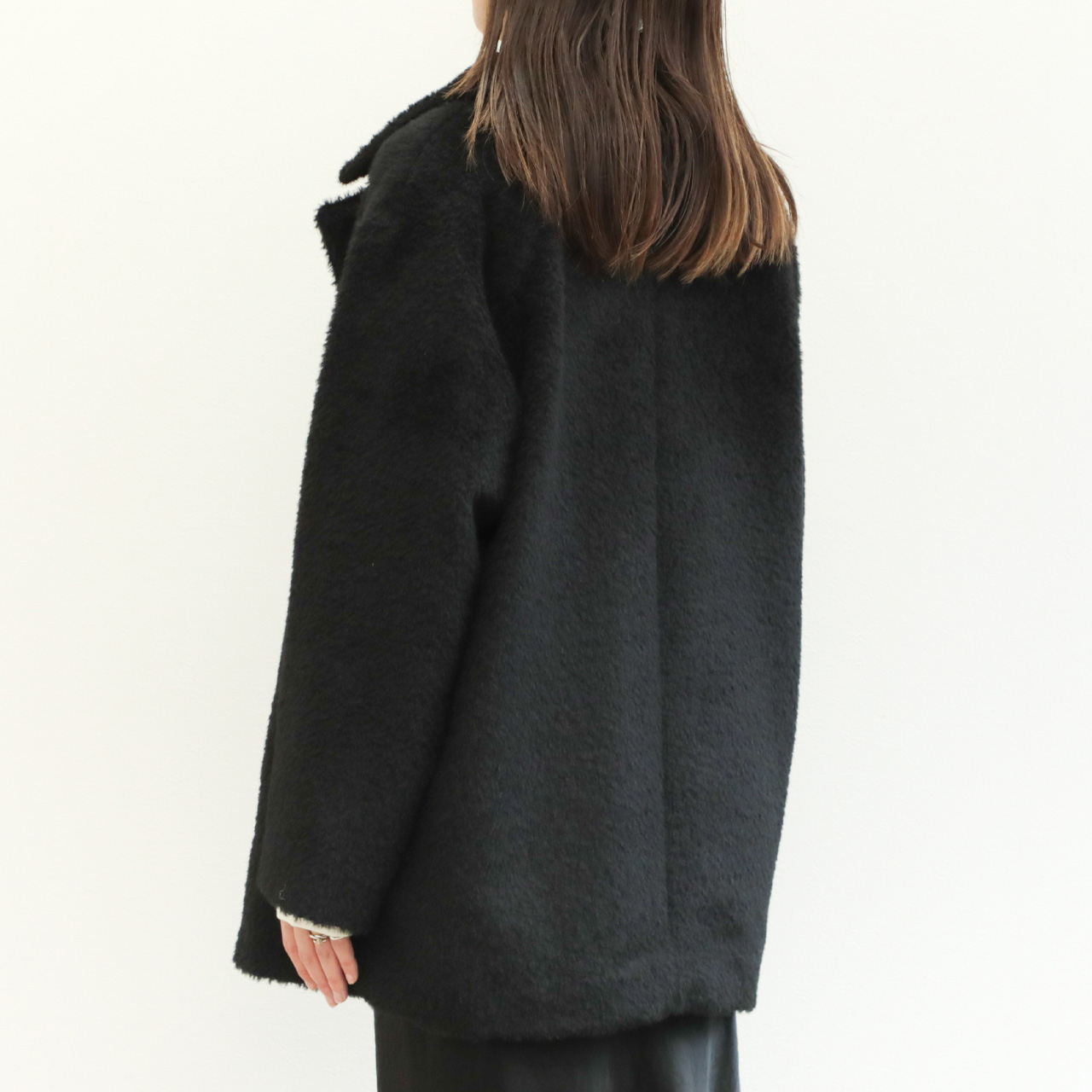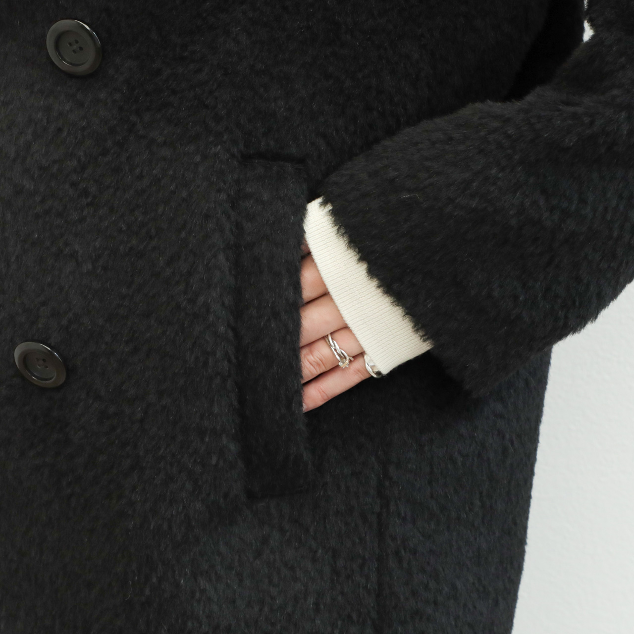 今季は昨年好評だったアルパカシャギー地を使用したコートをオーダー。昨年のエレガントなロング丈のコートとは対照的なカジュアルにも使えるショート丈のPコート。 アルパカ素材を主に使用し、ウール、ナイロンを混紡した生地を使用しているので、光沢のあるラグジュアリーな生地の風合いと、さらさらした手触り、柔らかな素材感が特徴です。
