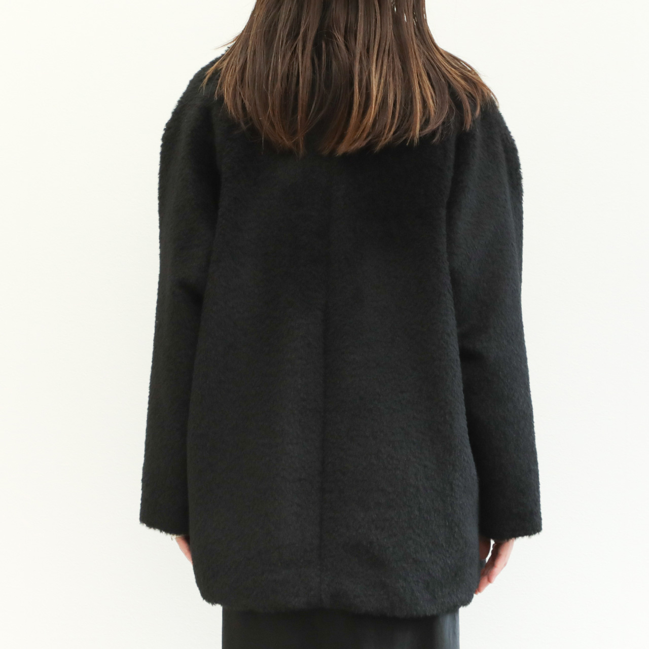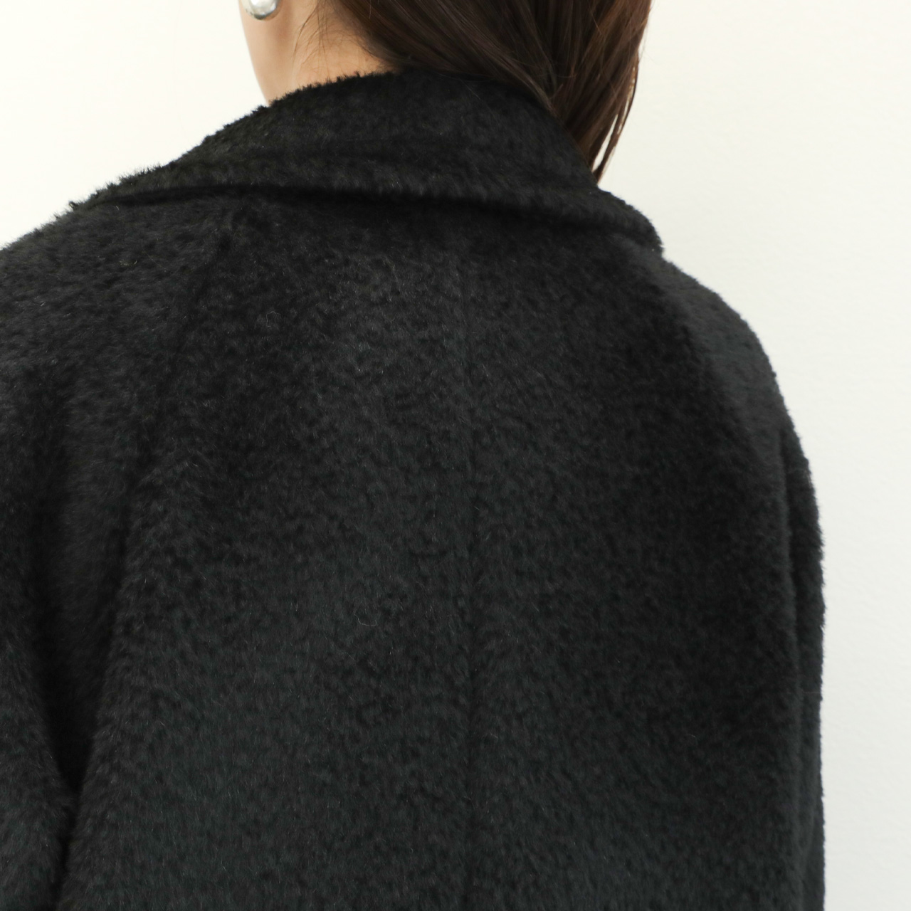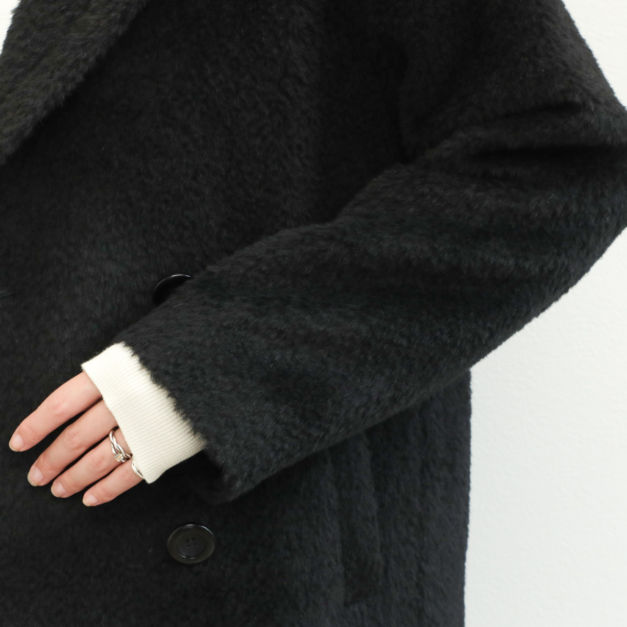 今季は昨年好評だったアルパカシャギー地を使用したコートをオーダー。昨年のエレガントなロング丈のコートとは対照的なカジュアルにも使えるショート丈のPコート。 アルパカ素材を主に使用し、ウール、ナイロンを混紡した生地を使用しているので、光沢のあるラグジュアリーな生地の風合いと、さらさらした手触り、柔らかな素材感が特徴です。