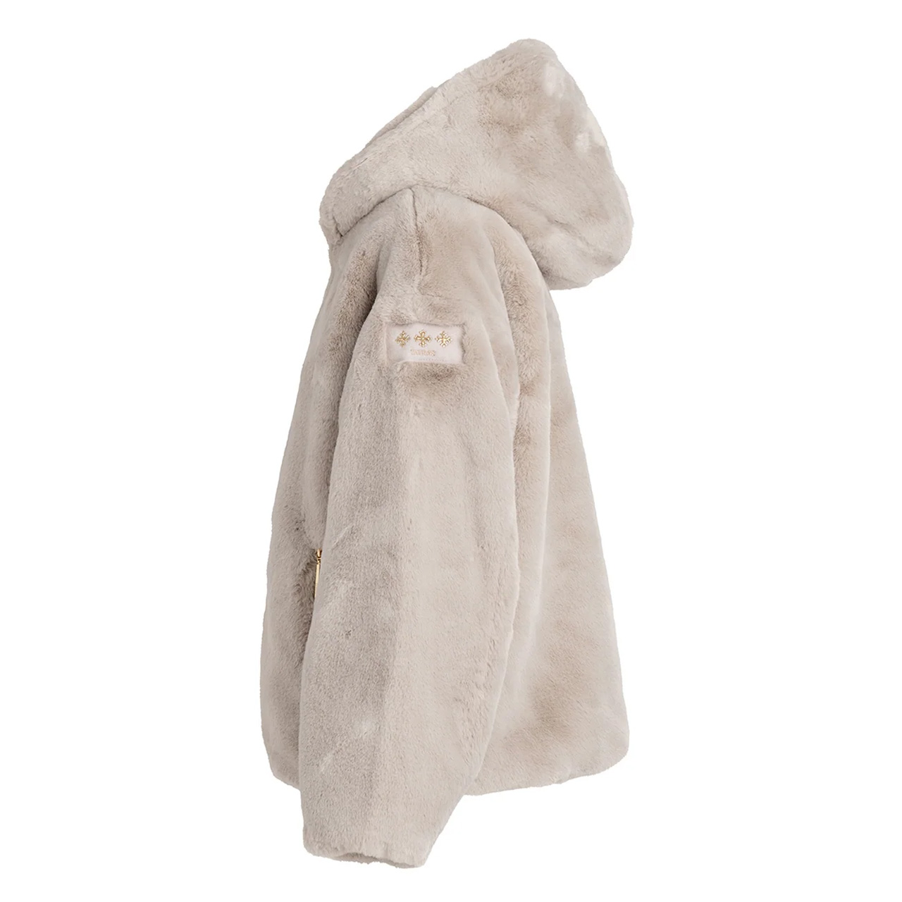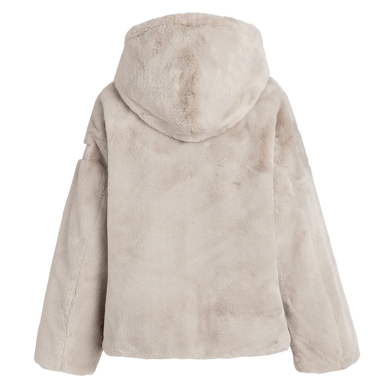 艶やかなラビットファー調エコファーを使用して、ラグジュアリーな表情に仕上げたフード付きブルゾン。