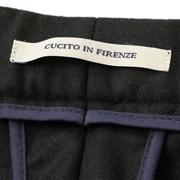 80年代頃のウールスラックスに見られるようなザクっとした見た目と織地にレトロな雰囲気が出ておりますが、ストレッチが入っていることで穿き心地は今の時代にピッタリとあうものになっております。