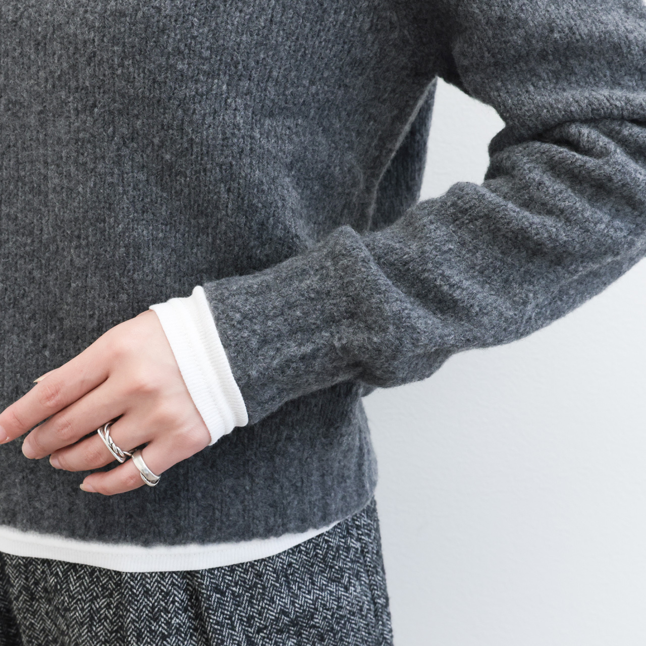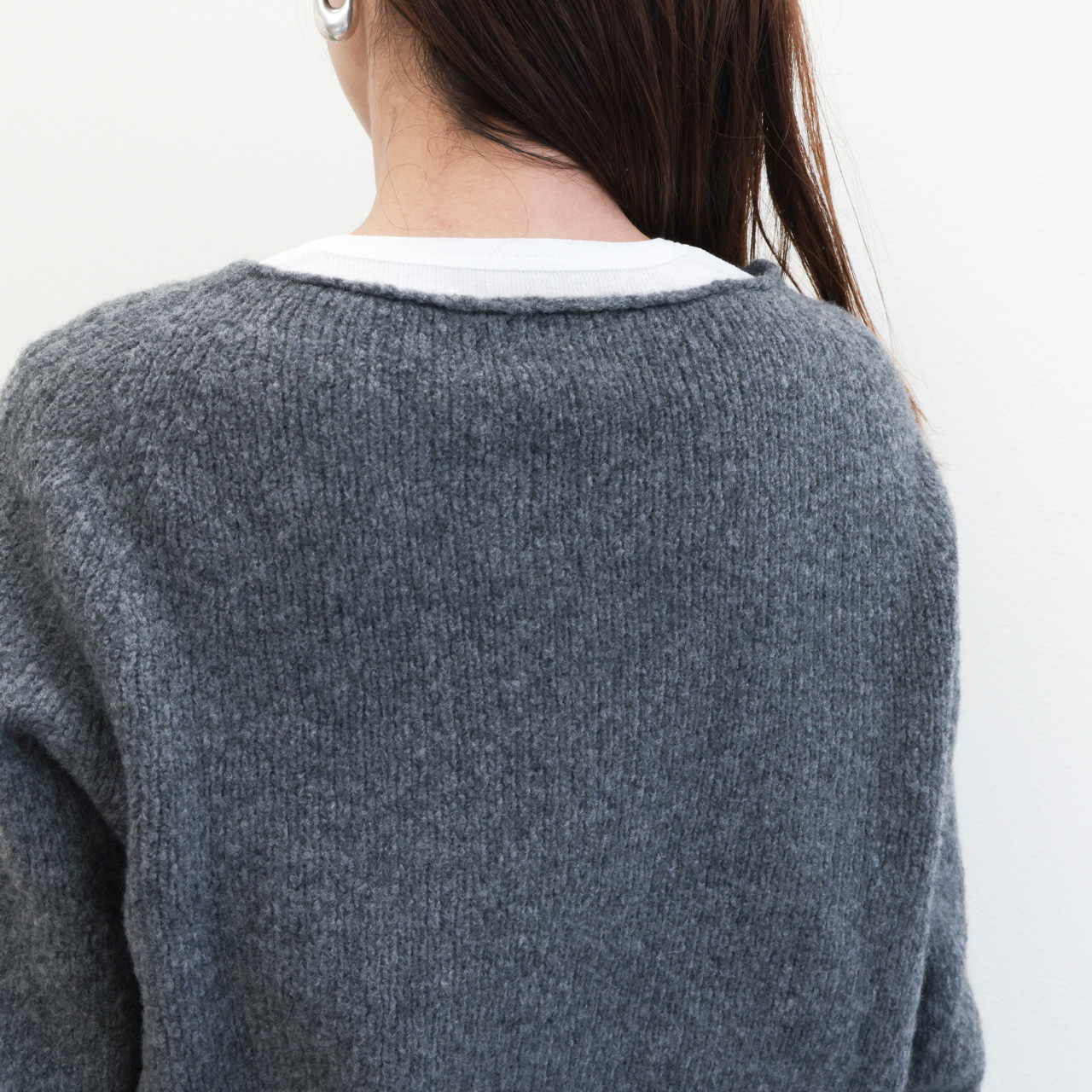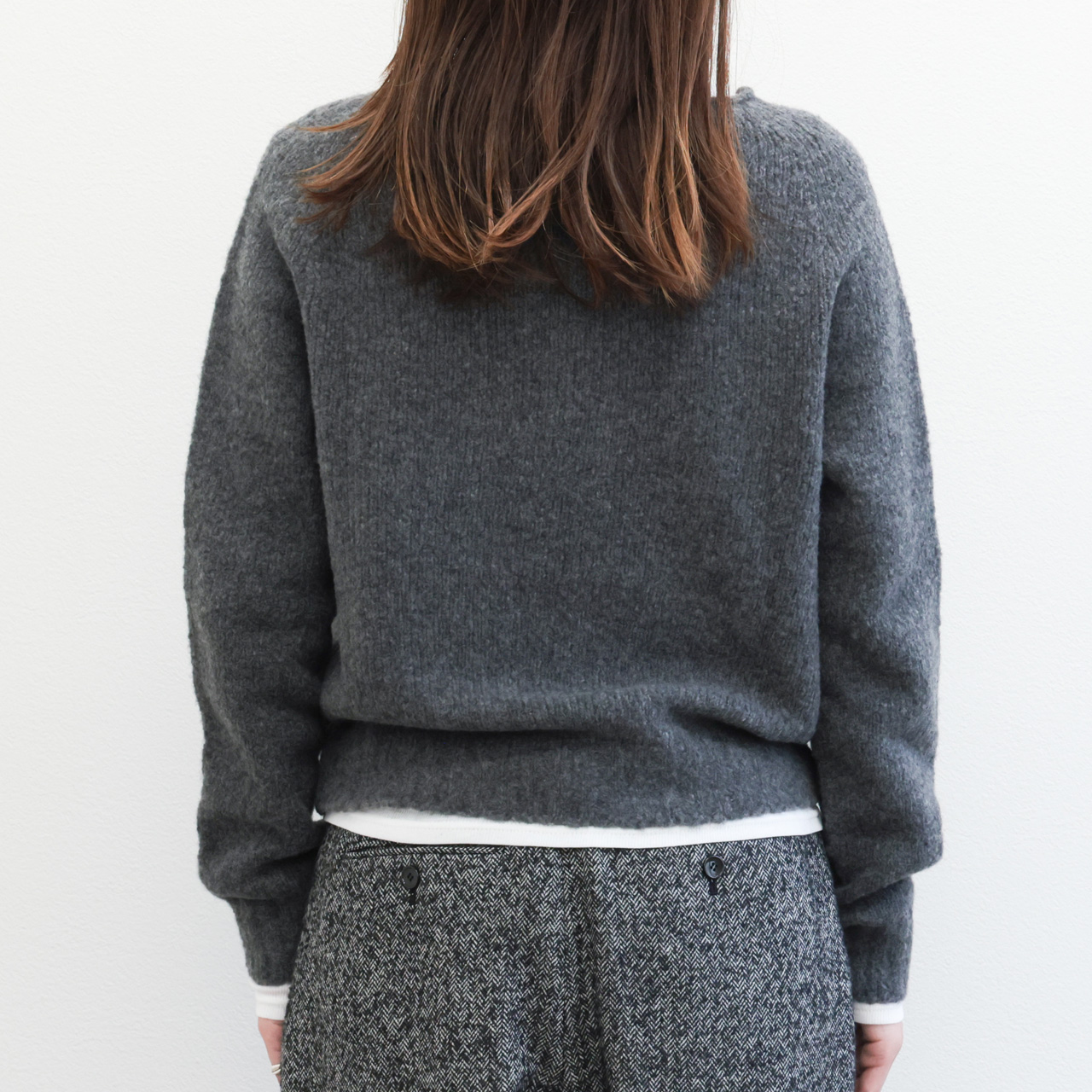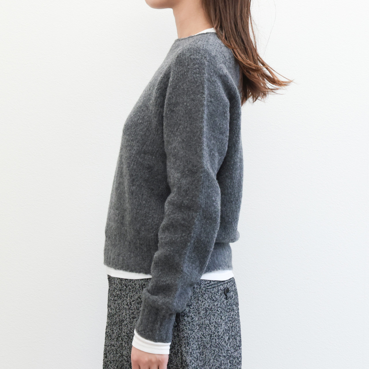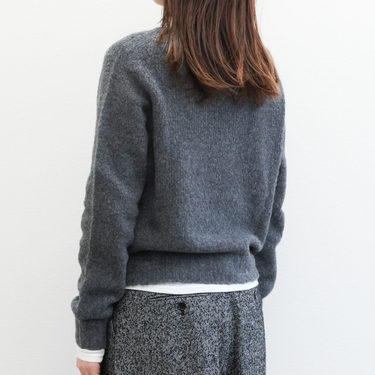 この着心地は素材も支えてくれています。製品タグには毛としか書いていない組成ですが、実はリサイクルバージンウールとカシミヤをブレンド。ブークレの様な風合いの糸に仕上げニットを編み上げることで見た目にはほんのりと膨らみの感じられ、着用感はライトな仕上がりになっており、気持ちの良い着心地をアシスト。