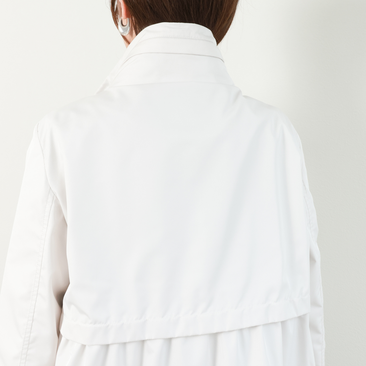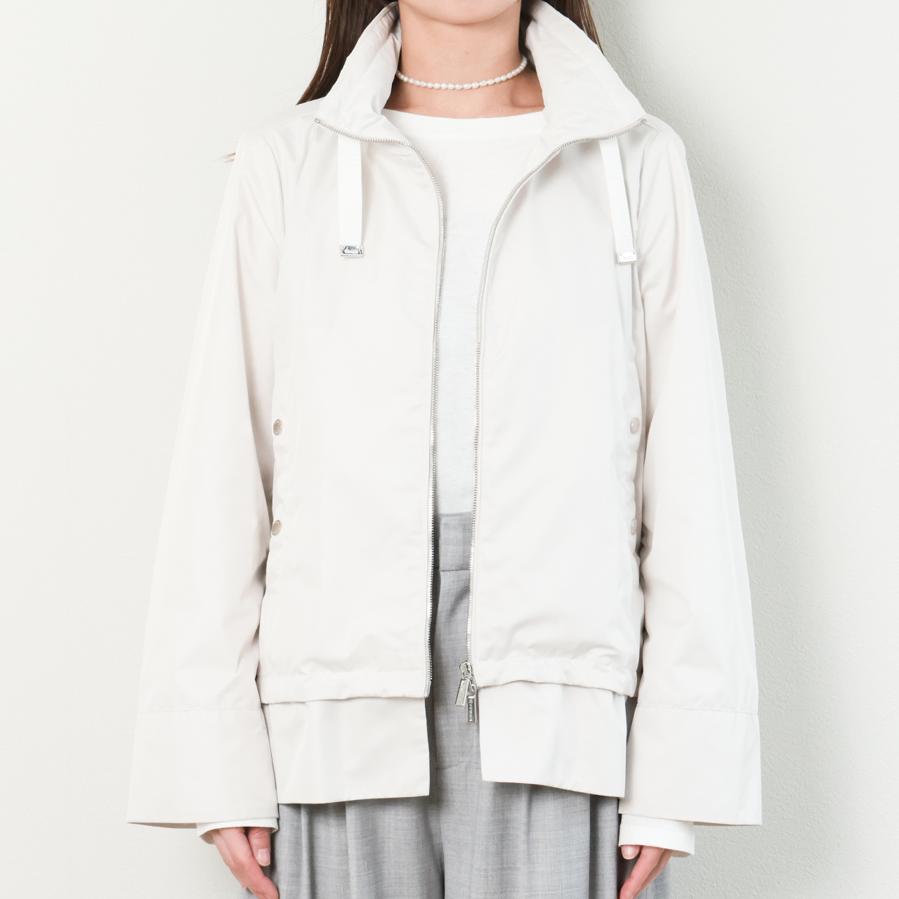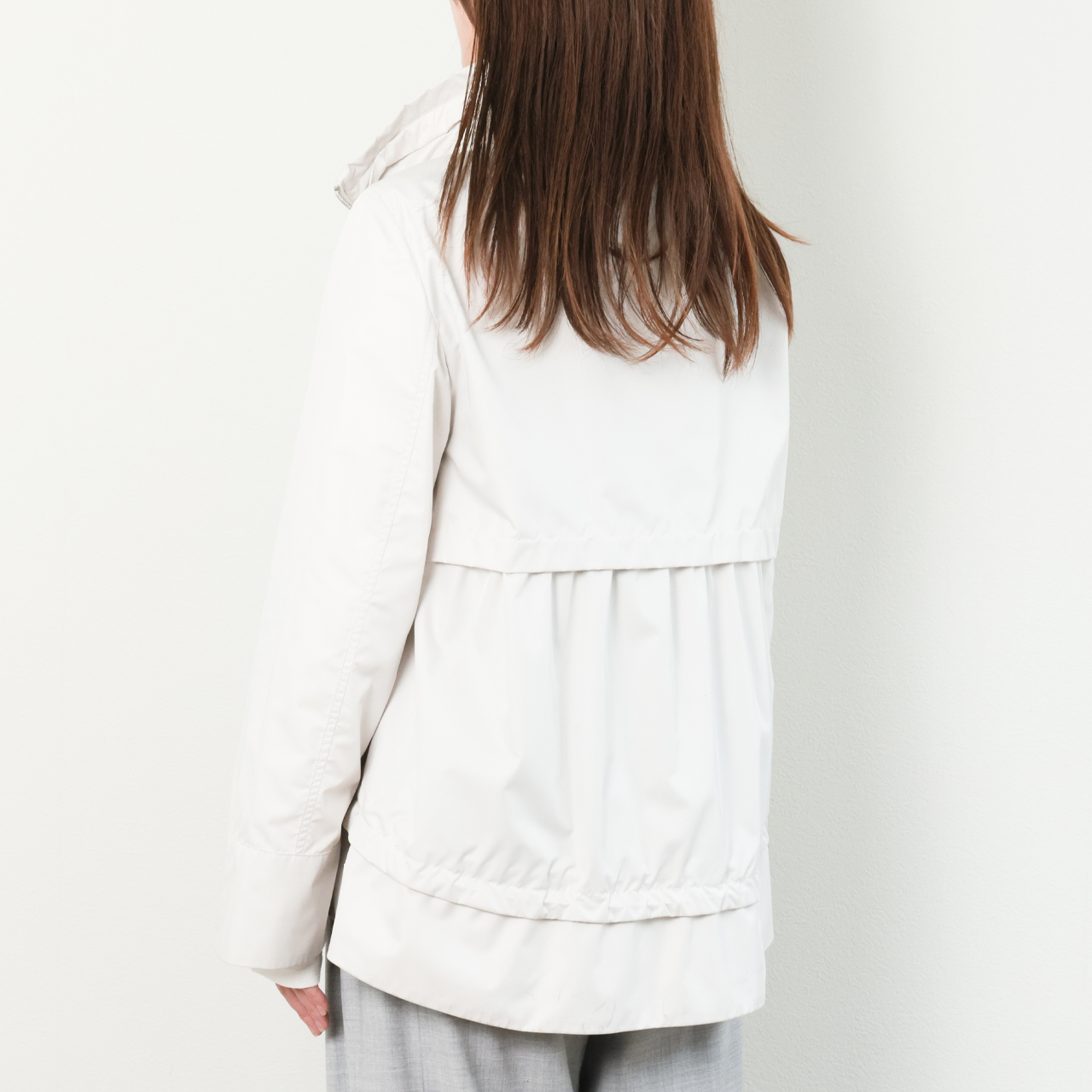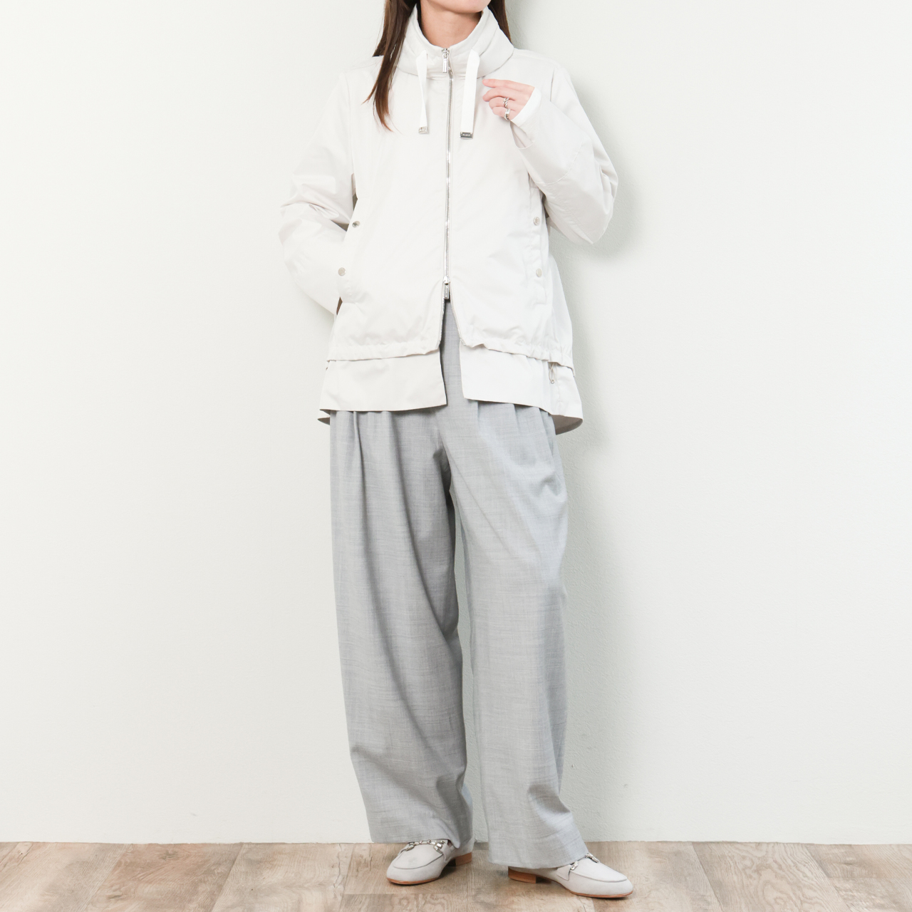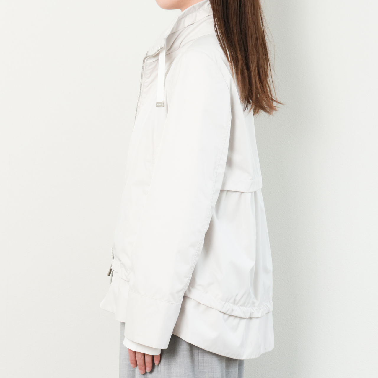 フードは襟の部分に収納可能ですので、カジュアルな時はパーカーブルゾンで、ドレッシーなスタイルの時はフードを閉まってというような使い分けで、一着で二度おいしいデザインです。