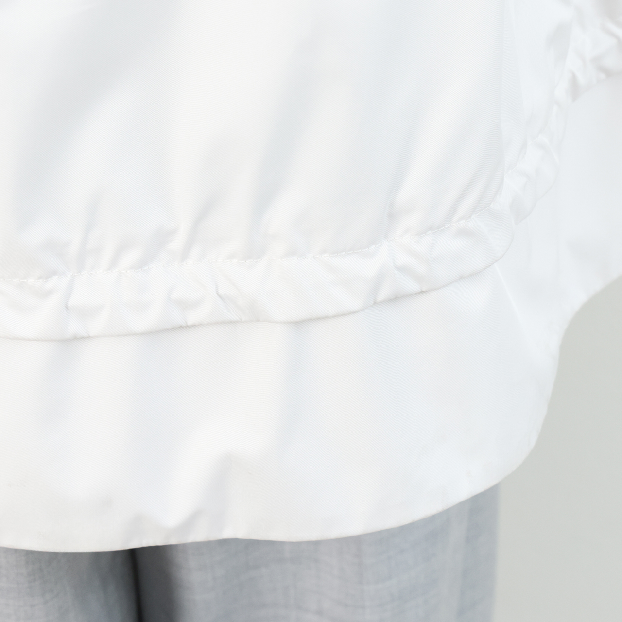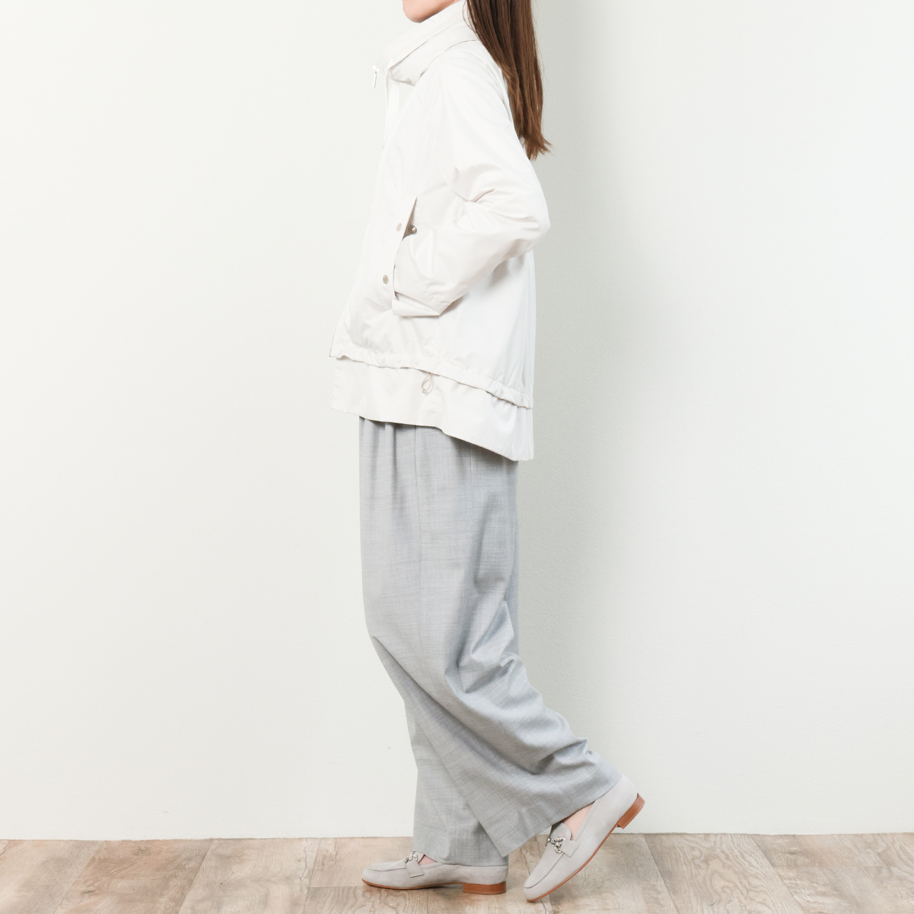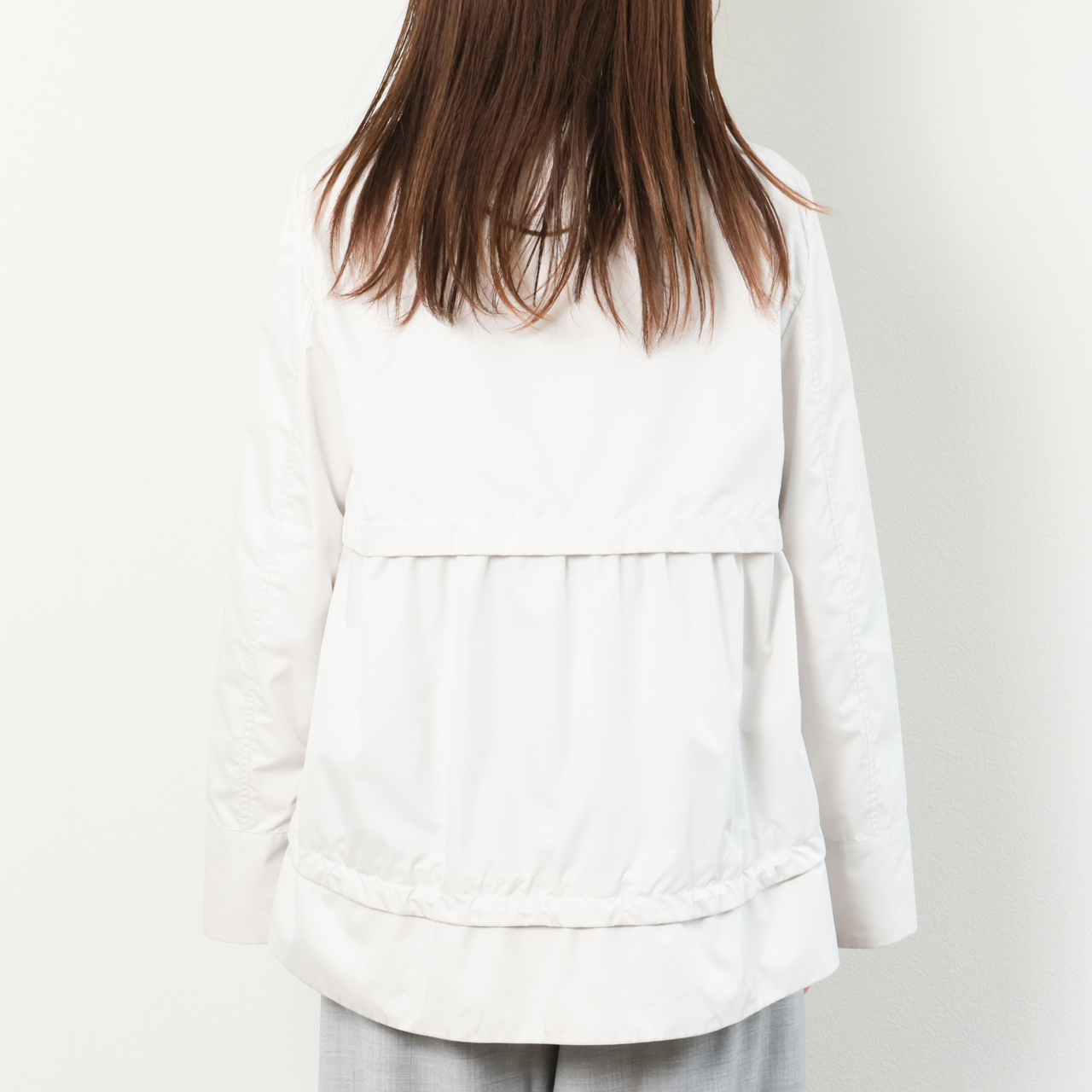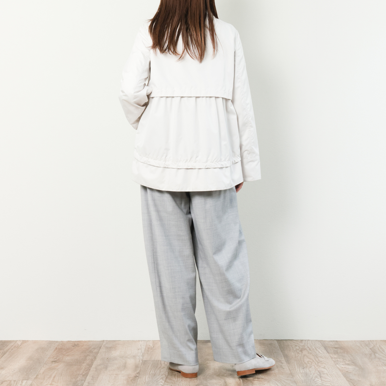 注目したいのはデザイン。女性らしい裾にかけて広がるAラインのフレアシルエット、そしてそこにあしらわれたドローコード。コードを引っ張ることでギャザーを寄せることが出来るので、スタイリングやシーンに応じて甘めの味付けを可能にしています。